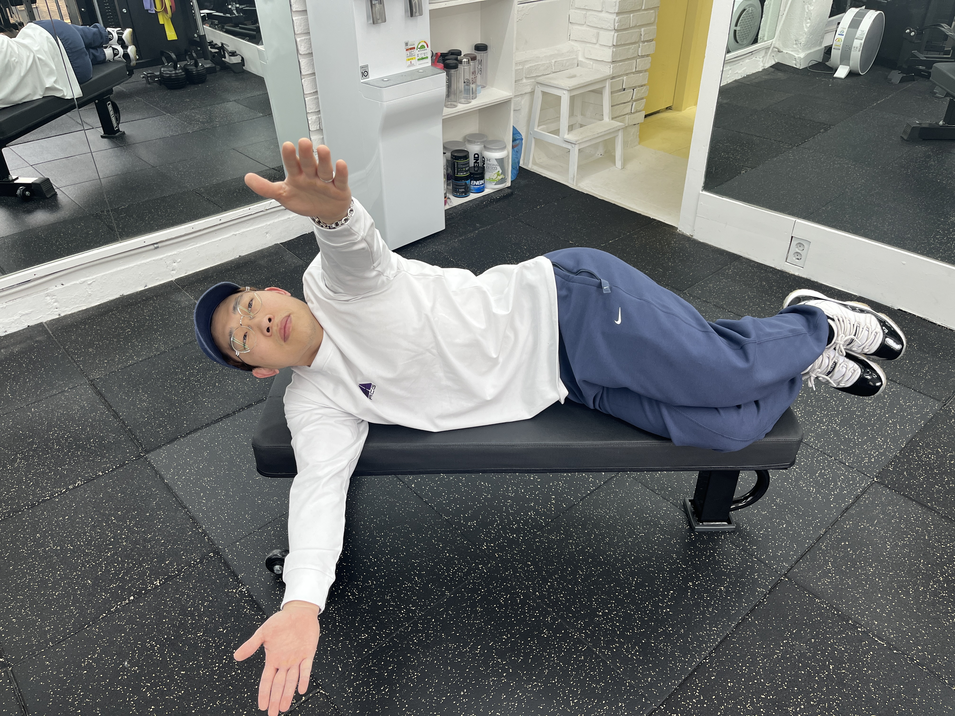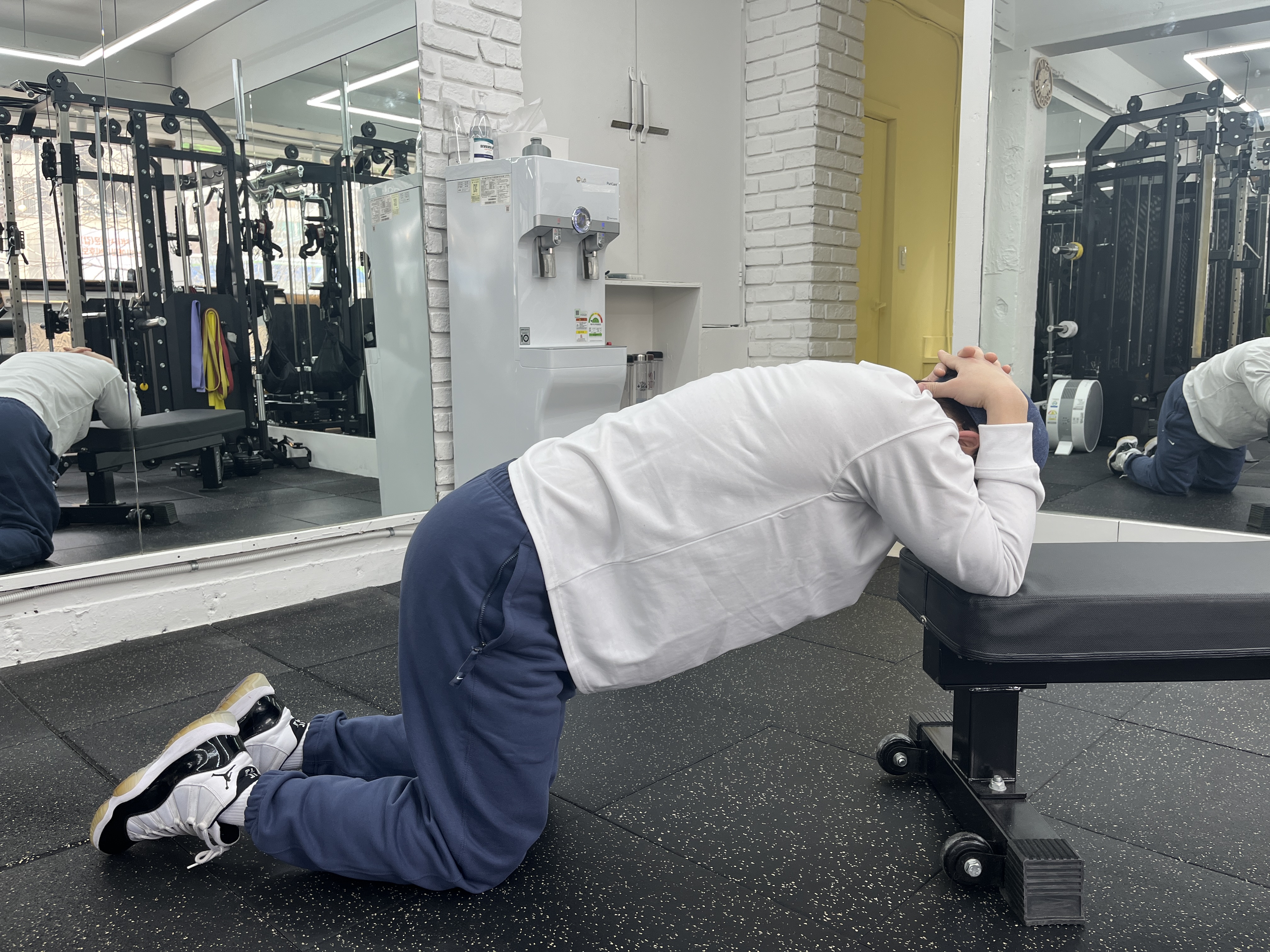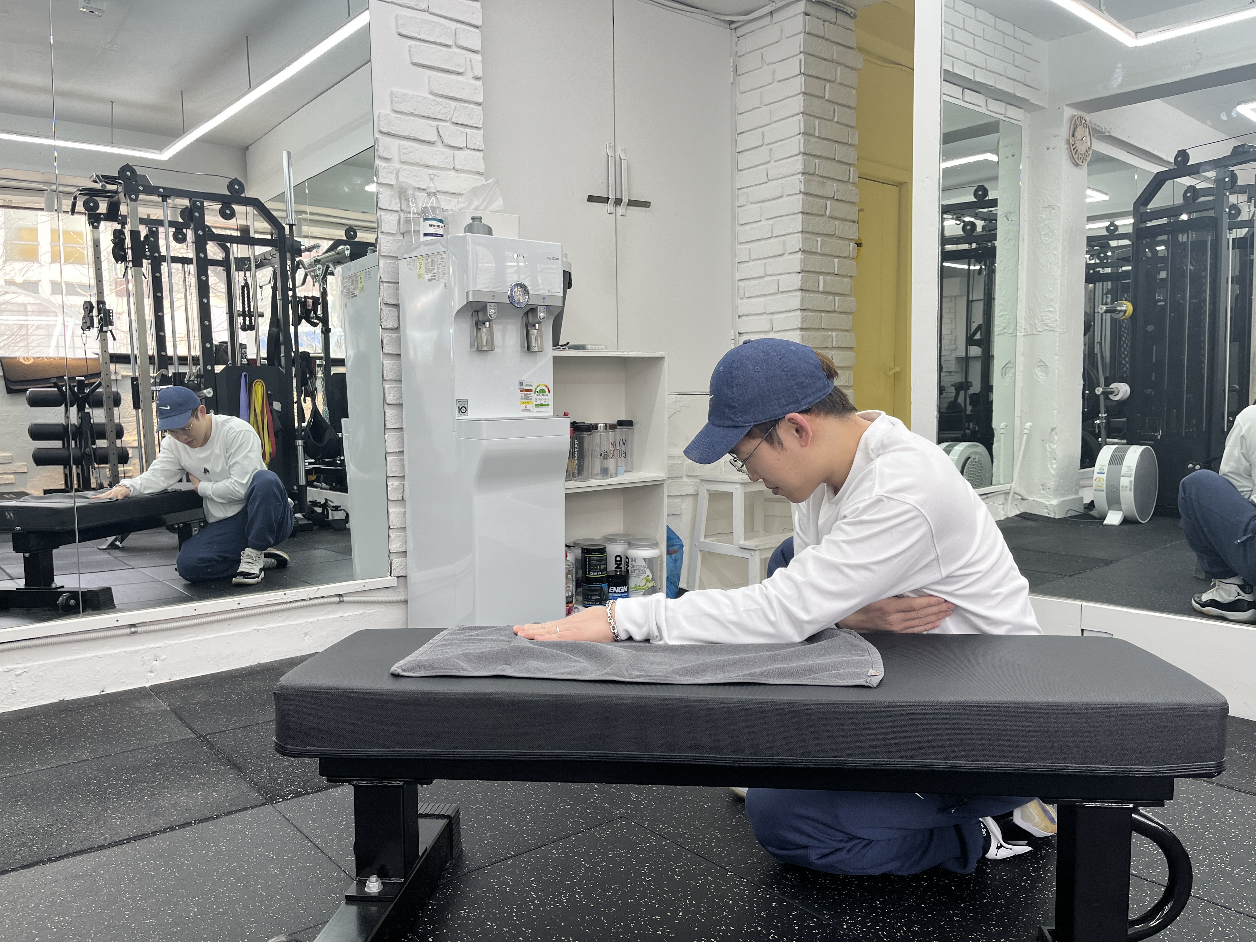 예시에서는 벤치 위에서 시행했지만 평평한 바닥에 매트를 깔고 운동하셔도 좋습니다.