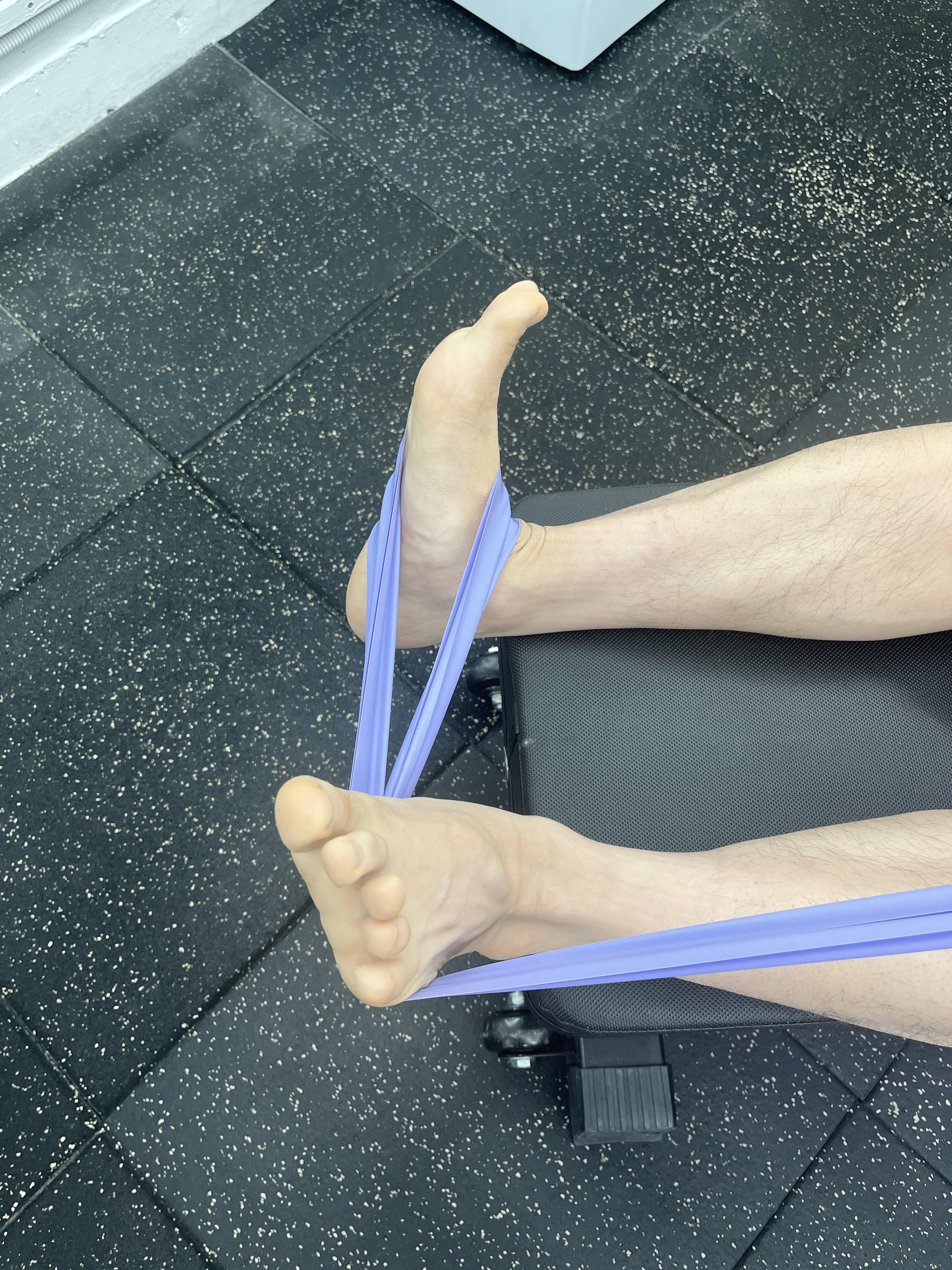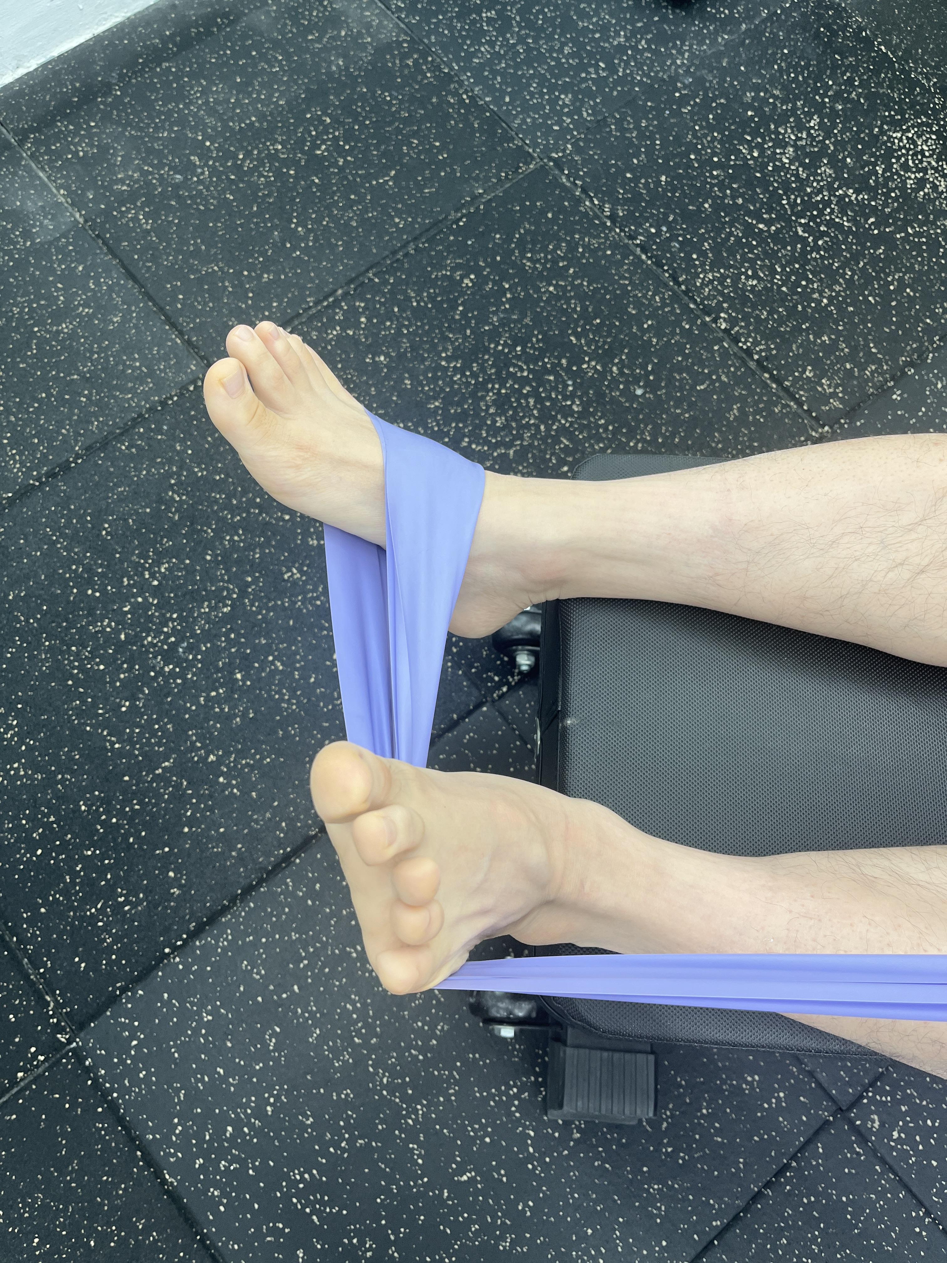 다음과 같이 밴드의 고리를 만들어 운동하고자 하는 발에 걸어줍니다. 이때 밴드의 고리 반대쪽은 단단하게 고정해주고, 운동 강도에 따라서 좀더 강하게 잡을수도, 느슨하게 잡을 수도 있습니다. 근력이 회복되면 점점 더 강한 강도로 운동해주는 것이 좋겠죠?