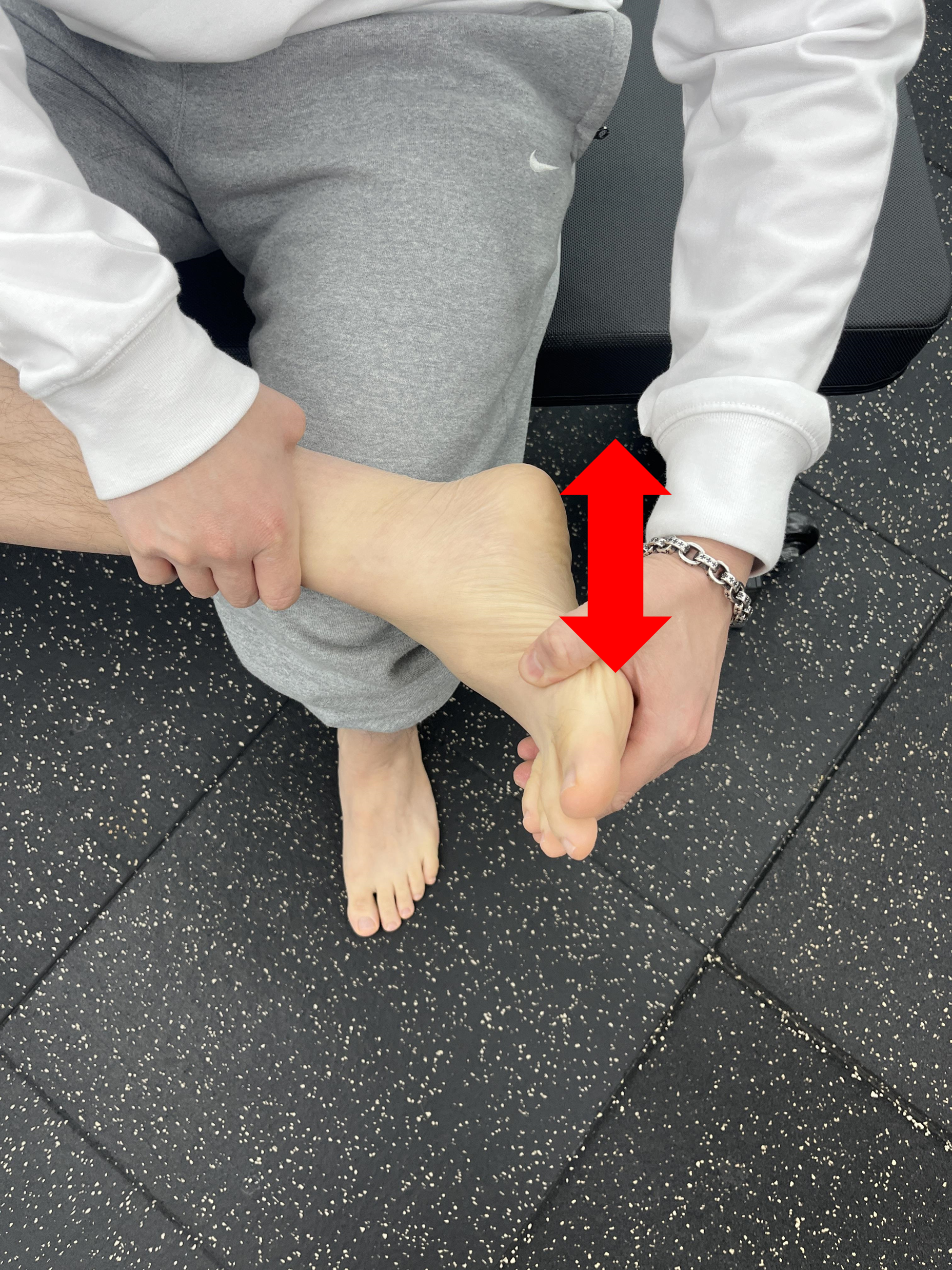 같은 운동이지만 방향을 바깥 위 방향으로 하는 운동입니다. 아래방향보다 발목 앞쪽 경골과 거골 부분의 충돌이 일어날 수 있는 동작이기때문에, 더 경직되게 느껴질 수 있습니다.