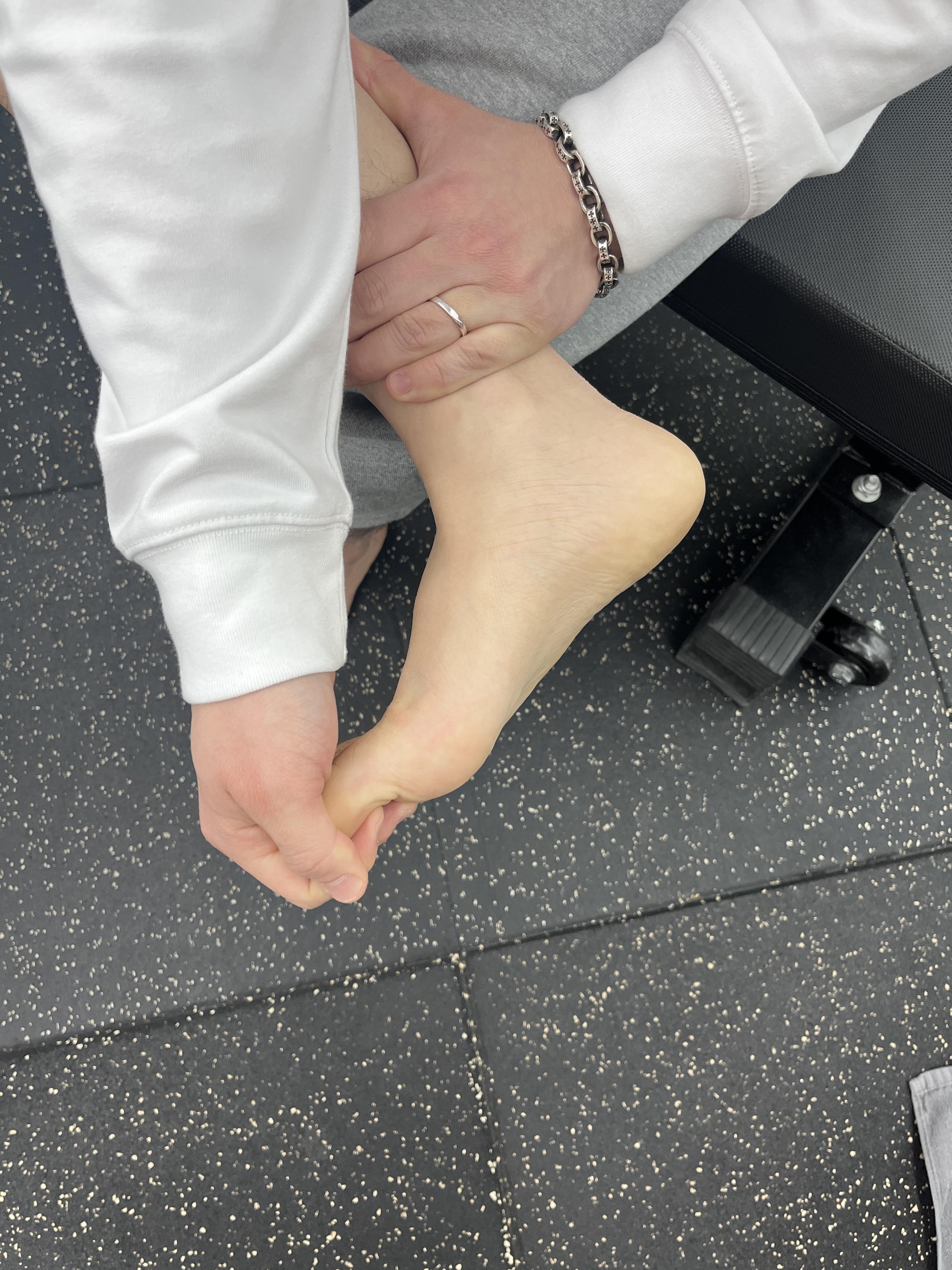 발목을 90도로 한 상태에서 운동이 잘 된다면, 발목을 바깥 & 아랫쪽 방향으로 아래 사진과 같이 회전시켜줍니다.
