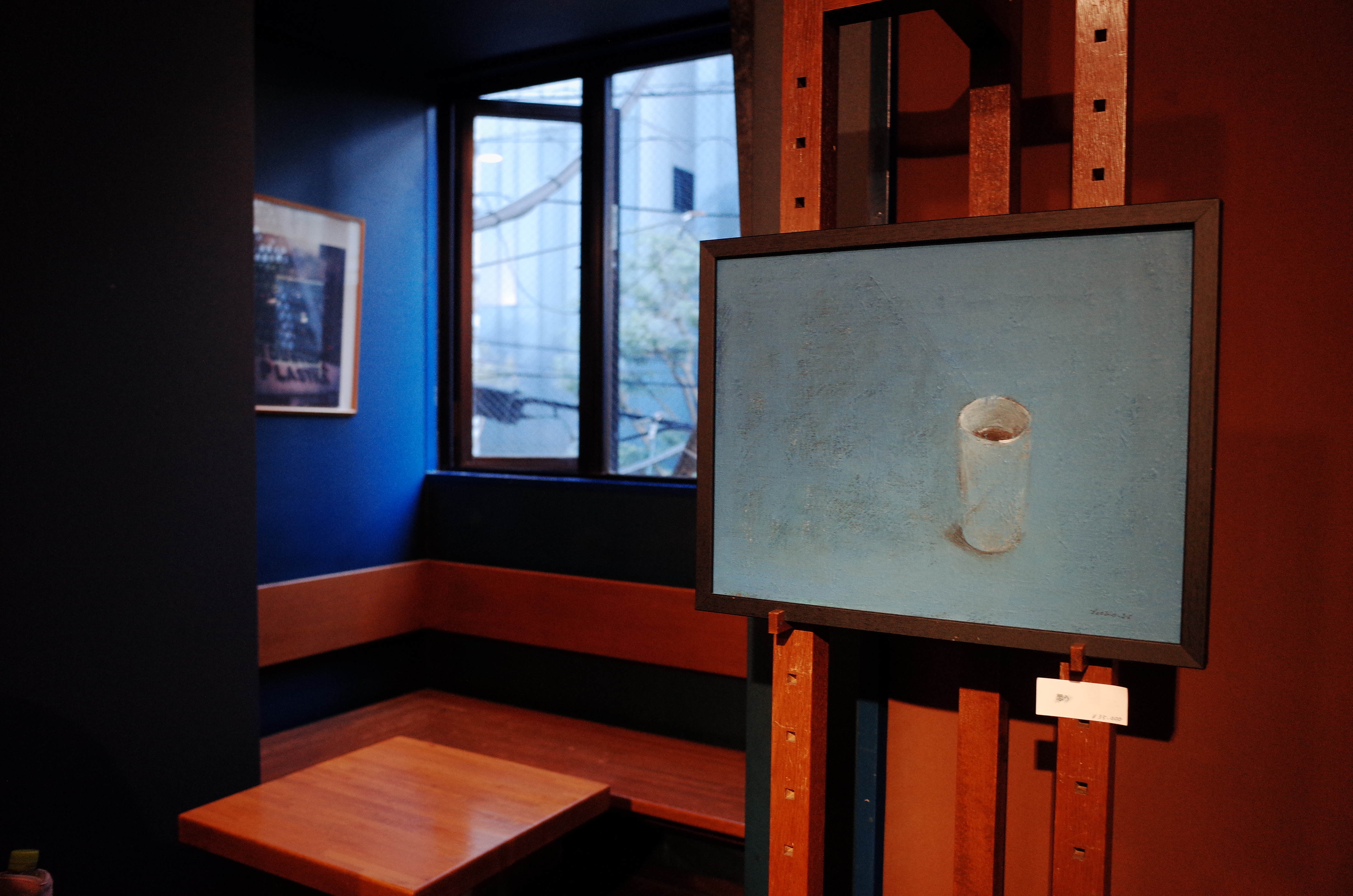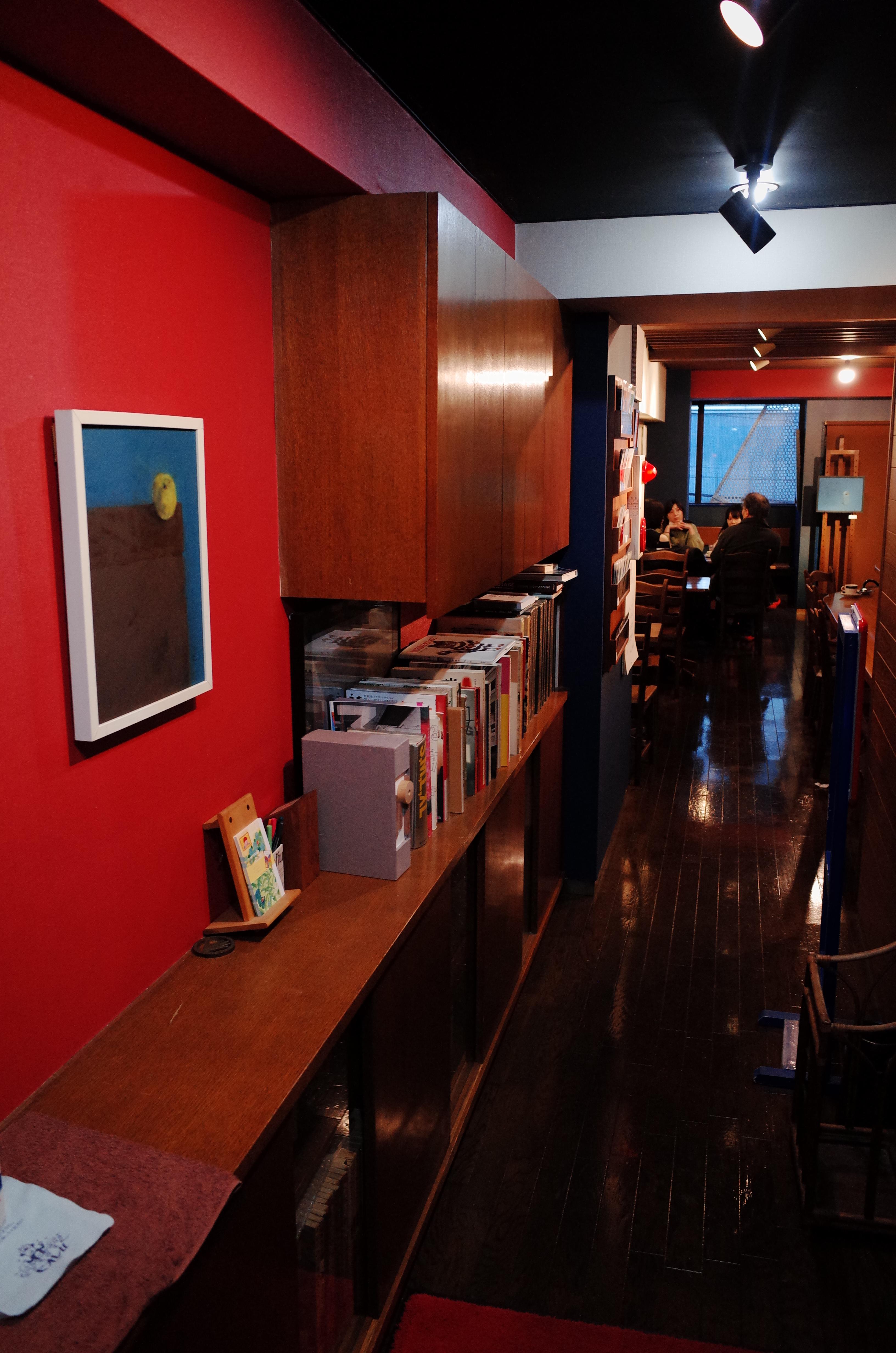 역시나 붉은색과 푸른색으 절묘한 조화를 이룬 구도. 해가 지기전 늦은 오후에 방문해서인지 채광이 분위기를 한층 더 올려준 것 같습니다. 낮이면 낮인 대로 채광이 밝은 분위기와도 잘 어울릴 것 같습니다. 액자를 붙여 놓은 가구도 이젤을 닮은 듯 안닮은듯 재밌는 구조였습니다.