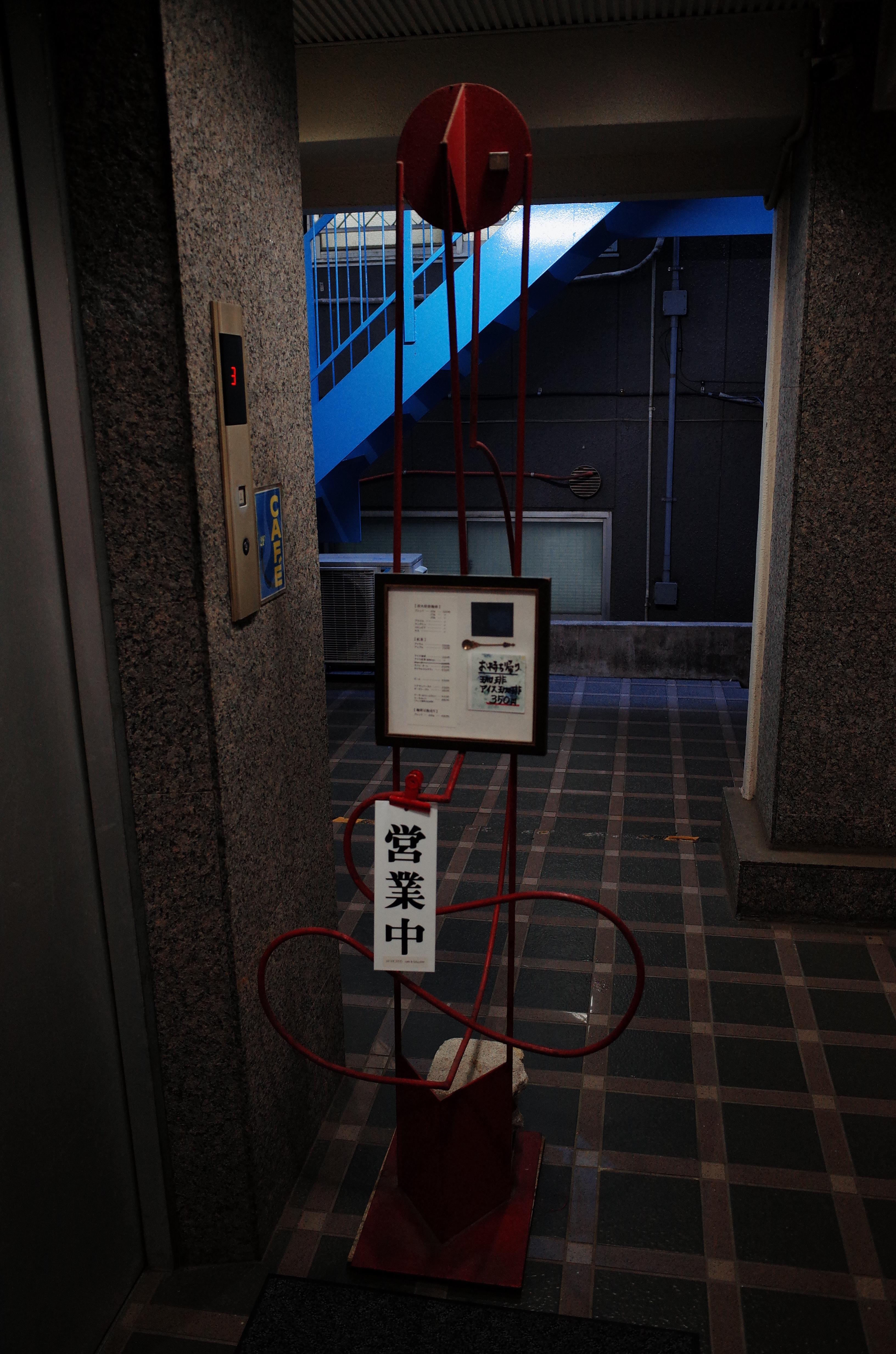 시부야 중심지에서 그리 멀지 않은 곳에 위치한 윌리엄 모리스 카페는 입구부터 독특합니다. 아주 전형적인 일본 도심지의 작은 빌딩의 2층에 위치하고 있는데요, 우리나라처럼 평범하게 건물 내부로 들어가서 내부 계단이나 엘레베이터를 타고 들어가는 것이 아니라, 독특한 야외로 연결된 계단으로 들어가게됩니다. 가는 중 뭔가 예술가 미로의 작품이 연상되는 방향 표지판이 보이는 것도 독특합니다. 가게사장님이 미술을 좋아하시는지 여러 점의 미술품이 가게 내부에도 걸려있고, 내부도 뭔가 프랑스 시골 갤러리에 온 것 같은 색감으로 인테리어를 하셨습니다.