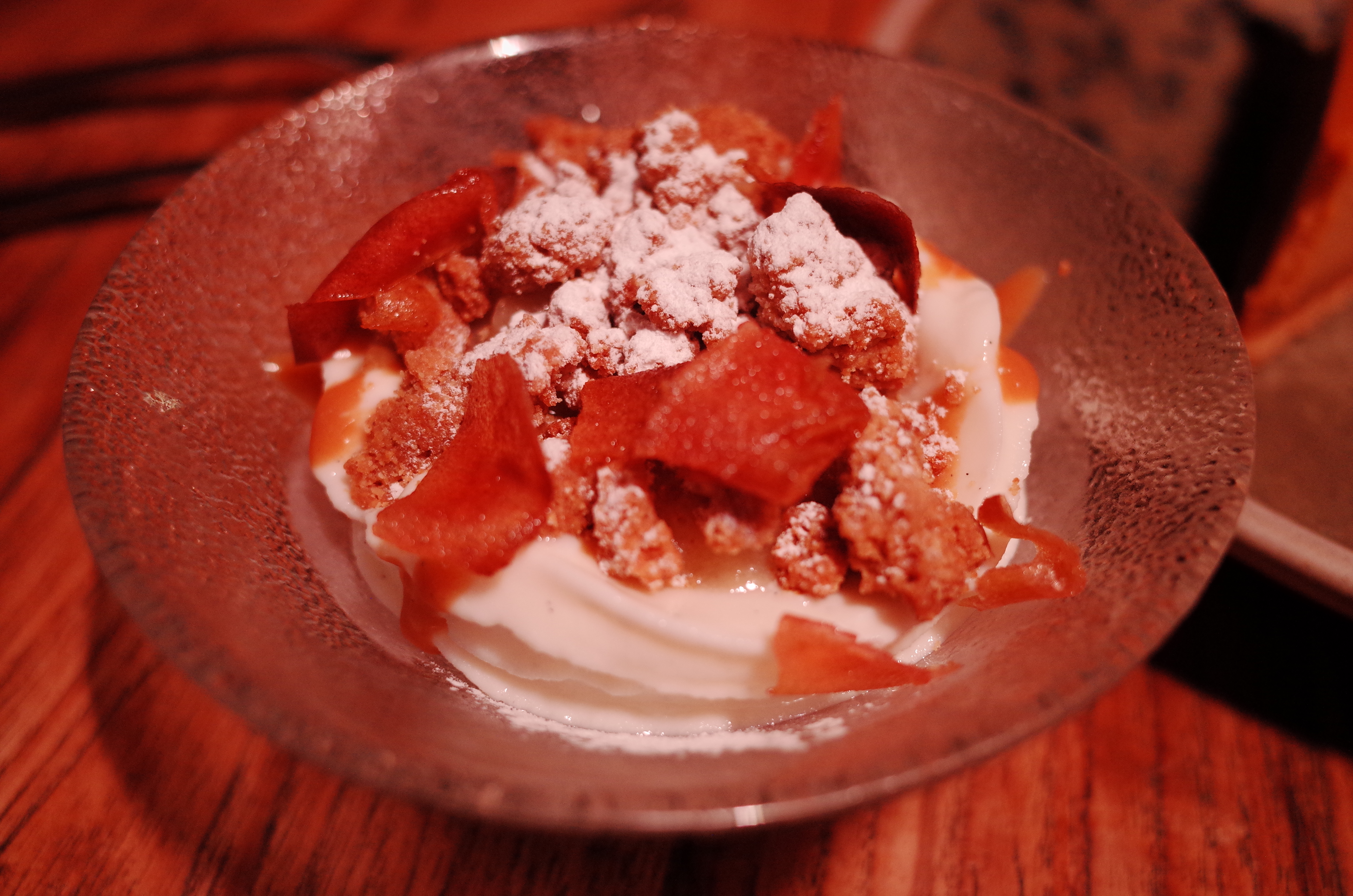 식사를 너무 만족스럽게 한 터라, 디저트를 맛보지 않을 수가 없었습니다. 테이블을 담당해주신 분께 추천받은 첫 번째 후식은 사과 아몬드 크럼블을 곁들인 바닐라 아이스크림 (Salted vanilla soft serve, British apples Almond crumble, £8). 결론적으로는 주문하길 잘했다는 생각이 드는 맛이었습니다. 아이스크림 위에 올려져있는 크럼블들과 말린 칩이 매우 조화로웠습니다. 절대 뻔하지 않은 맛이었습니다.