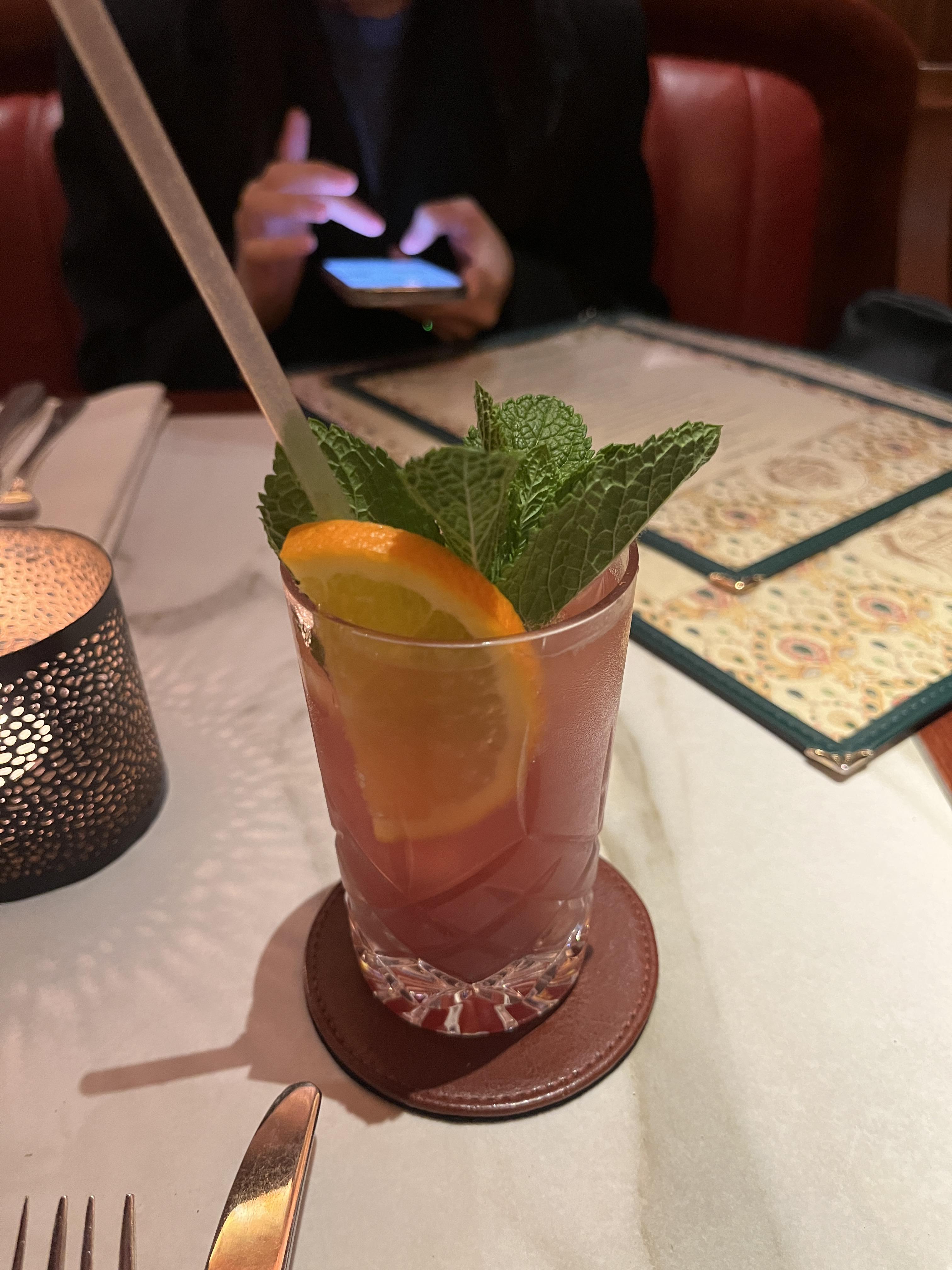 자리로 안내를 받으면 메뉴판을 안내 받고 드링크를 무엇을 시킬지 물어봅니다. 물 자체는 탭 워터를 시켜도 비린맛이 나거나 하지는 않았습니다. 메뉴판에 적혀있는 인도식 칵테일 메뉴가 궁금해서 논 알코올 칵테일로 추천을 부탁드렸습니다.