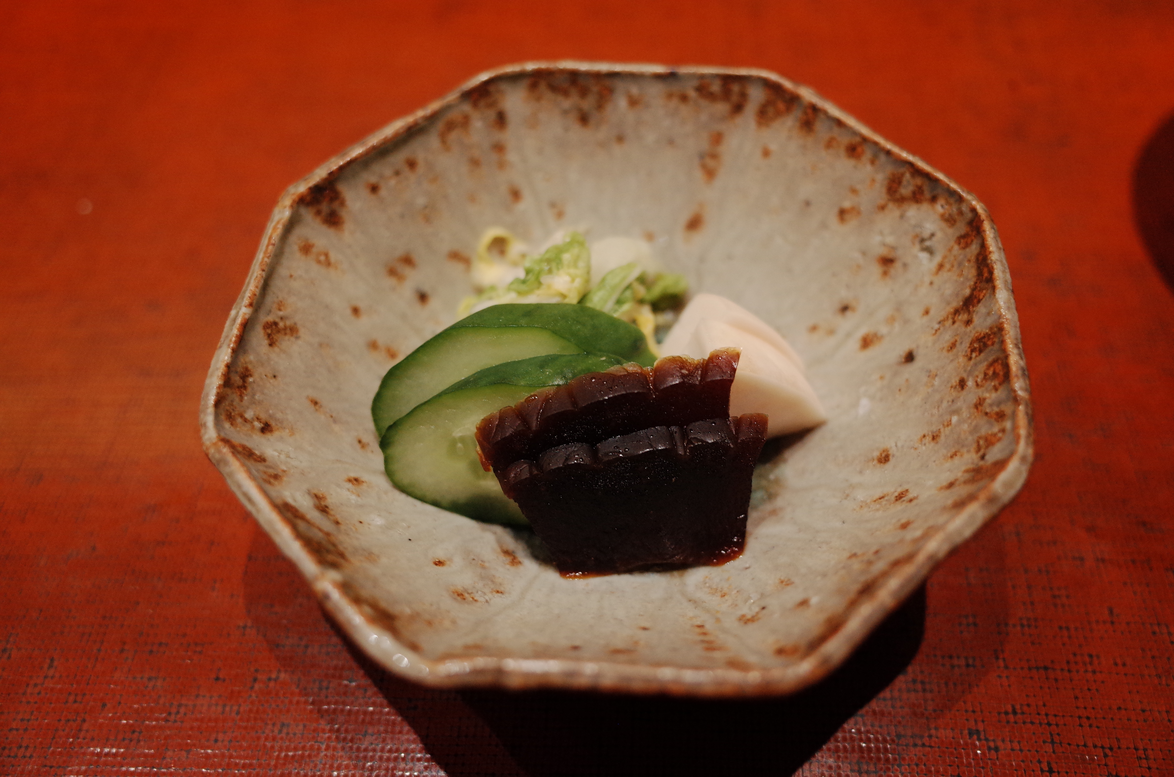 식전에 먼저 나온 각종 절인 반찬들인 '쯔케모노'. 개인적으로 이런 절임류들을 좋아해서 과거에 교토 여행을 다녀오면서 잔뜩 사왔던 기억이 나네요. 근데 막상 집에 사와서 먹으려니 일식을 계속 먹는게 아니라서 다 먹기는 힘들더라는..