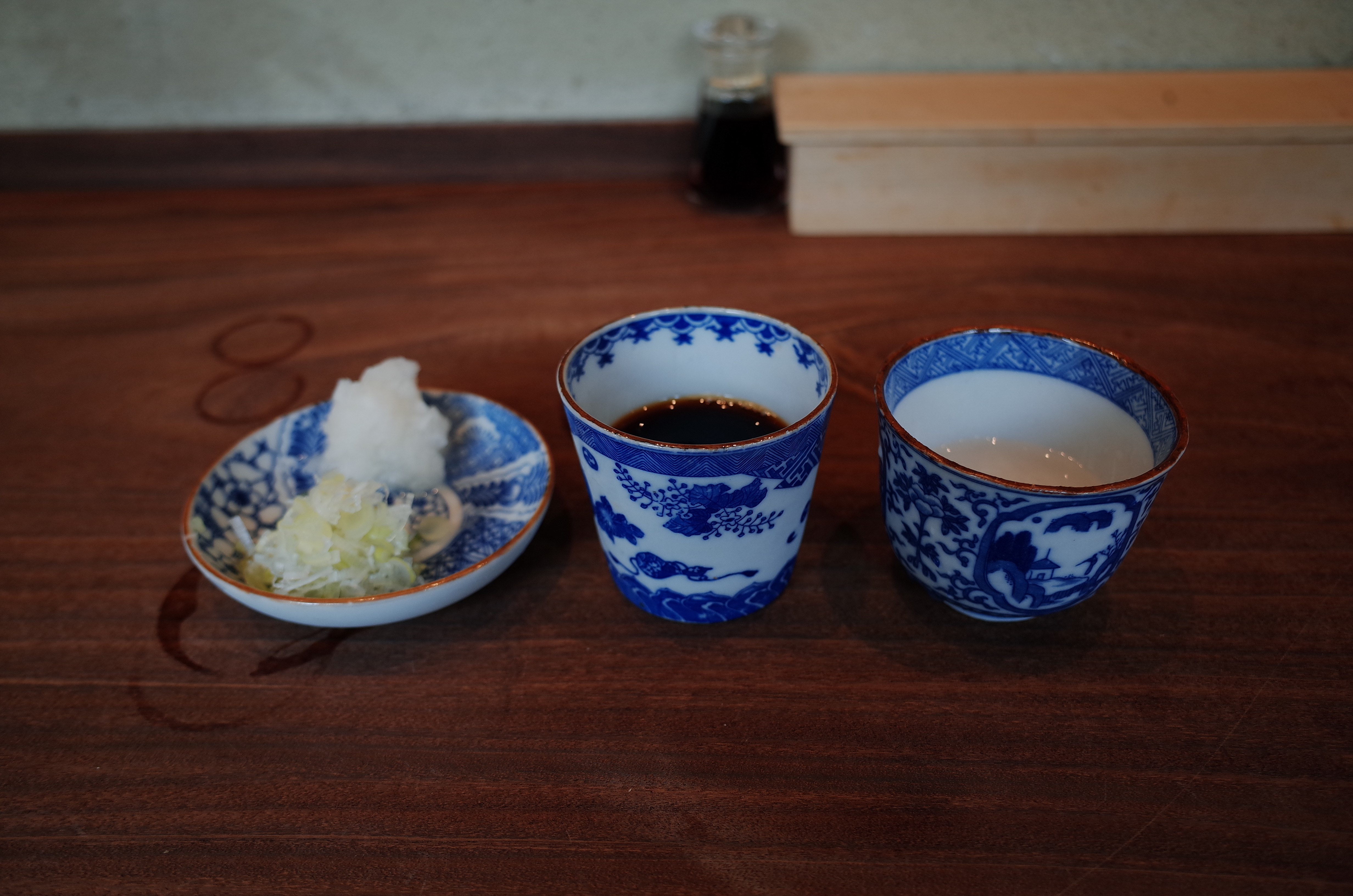 면을 기다리는 동안 먼저 나온 꾸밈류들과 소바 쯔유. 그리고 이곳의 특제 소스입니다. 달달하면서도 감칠맛이 나는 소스를 중간중간 섞어서 (너무 많이 섞지는 말라고 하시더군요) 먹으니 풍미가 매우 좋았습니다.