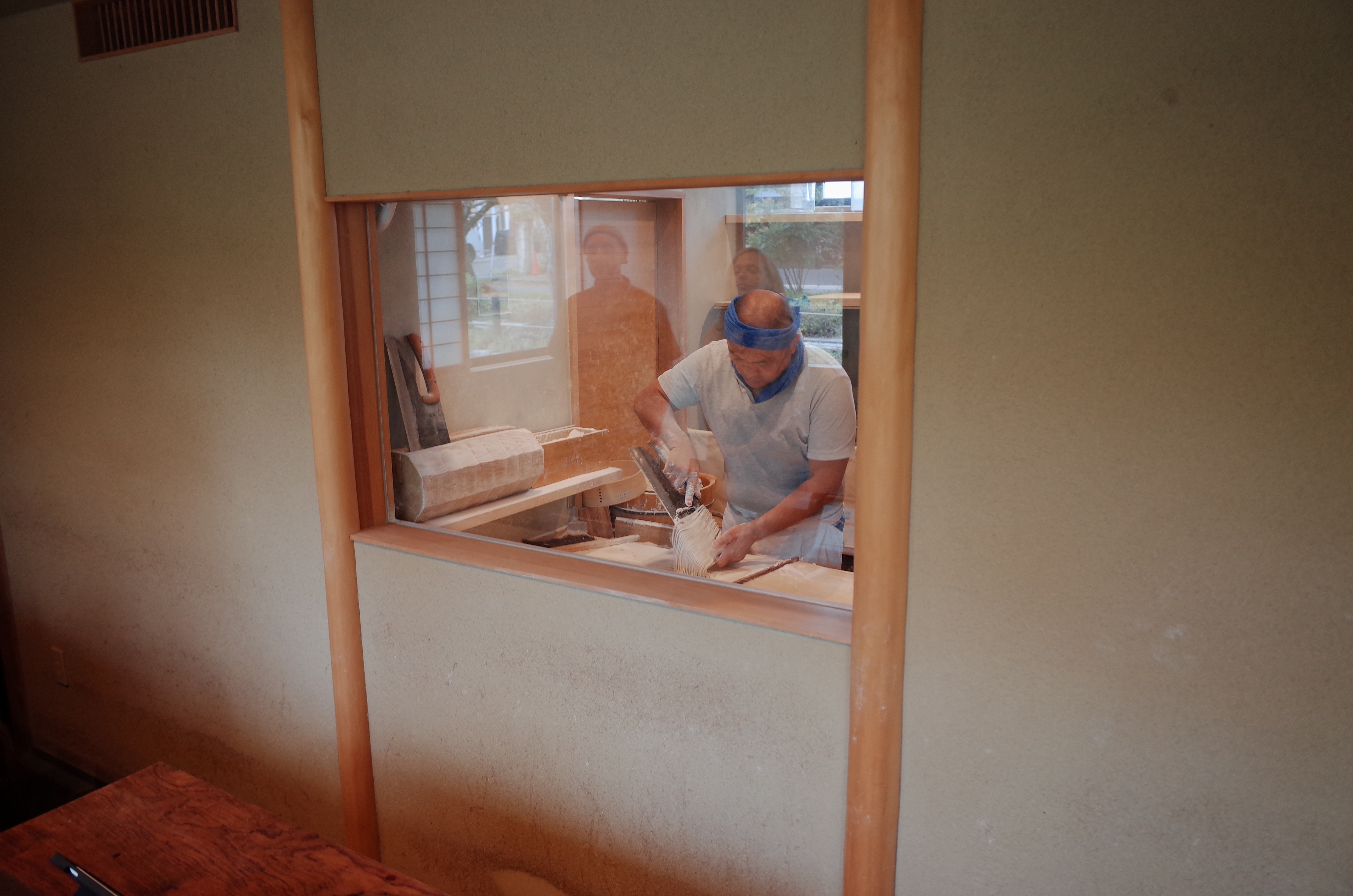 식당 쥬고는 오직 소바만을 파는 식당입니다. 간혹 계절에 따라서 별미 메뉴를 추가한 경우도 있지만 대부분 단일 메뉴로 운영을 하는 것 같습니다. 이 가게의 가장 큰 특징은 사진처럼 손님들이 미리 인터넷으로 주문을 해 놓으면, 주문한 수량 만큼 준비된 반죽으로 직접 실시간으로 면을 뽑아서 조리 후 제공한다는 점입니다. 이전에 후쿠오카에서 '라멘 극장'이라는 개념의 식당에서 실시간으로 면을 뽑고 조리하는 것을 영화처럼 관람하면서 먹어본 경험이 있지만, 비교적 고급 요리에 속하는 소바를 실시간으로 조리하는 것은 처음으로 보았습니다.