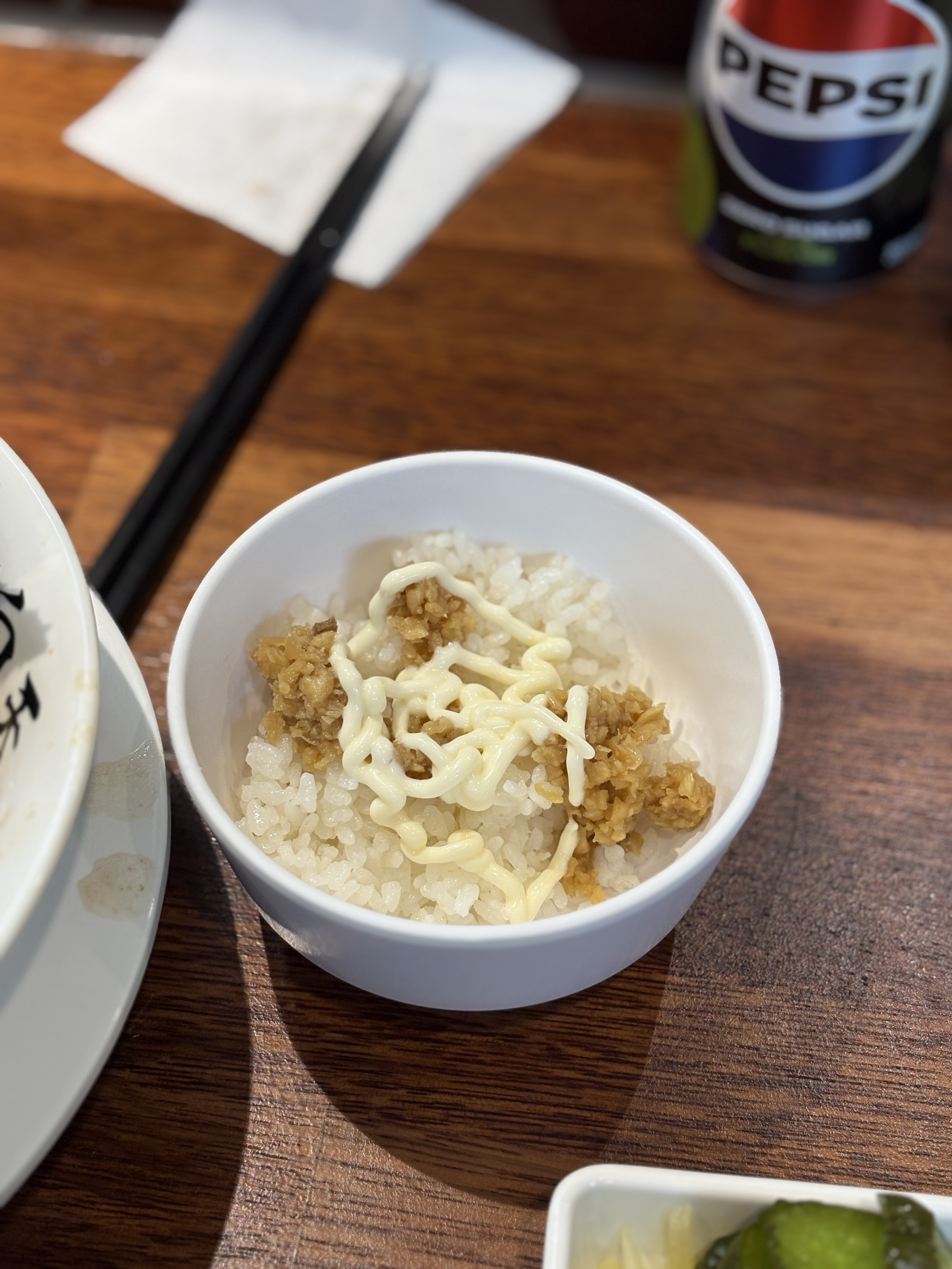 연남동 하쿠텐은 어느 라멘집보다도 사이드 메뉴가 잘 준비되어있는 곳입니다. 김치, 그리고 초록빛이 감도는 일본식 피클, 초생강, 그리고 다진 양파와 간마늘 장까지. 옆에는 공기밥은 무료로 먹을 수 있게 비치되어있습니다. 미니 메뉴처럼 공기밥을 퍼서 위에 마늘장과 마요네즈를 버무려 돈부리 형식으로 먹는 것이 이 집의 히든 메뉴 중 하나입니다.
