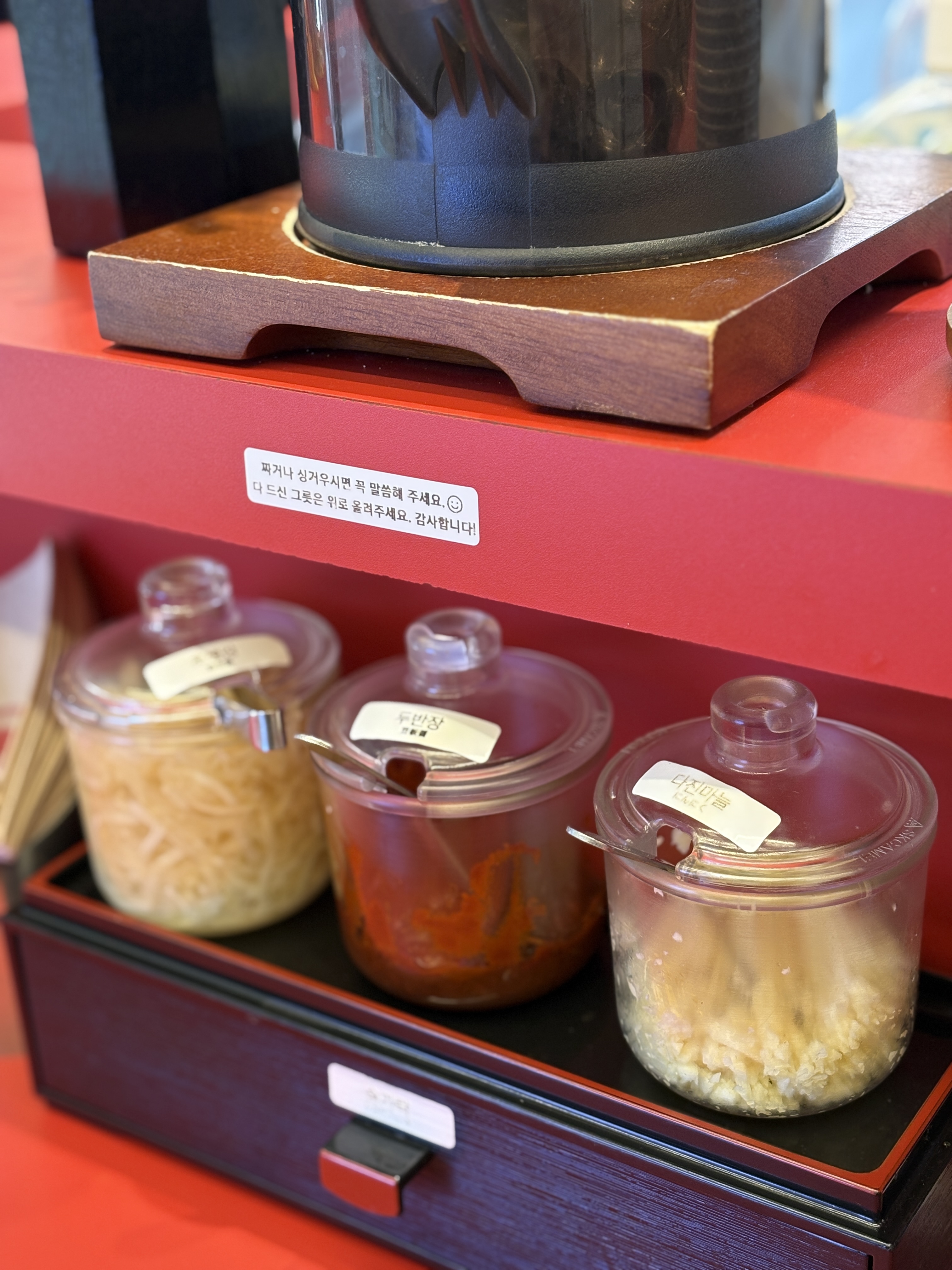 하지만 앞에 놓인 대기 의자들과 사장님의 따뜻한 마음이 느껴지는 보리차 세팅이 시간을 잘못맞춰오면 대기할수밖에 없는 집이구나를 느낄 수 있게 해줍니다. 이렇게 대기하는 줄에 따뜻한 보리차를 구비해두는 것은 일본 맛집에서 자주 보던 풍경인데 뭔가 반가웠습니다. 별거아니지만 이게 뭐라고 기다리면서 친구와 담소를 나누며 따뜻한 차 한잔에 몸을 녹이면 피로도 눈녹듯이 사라집니다.