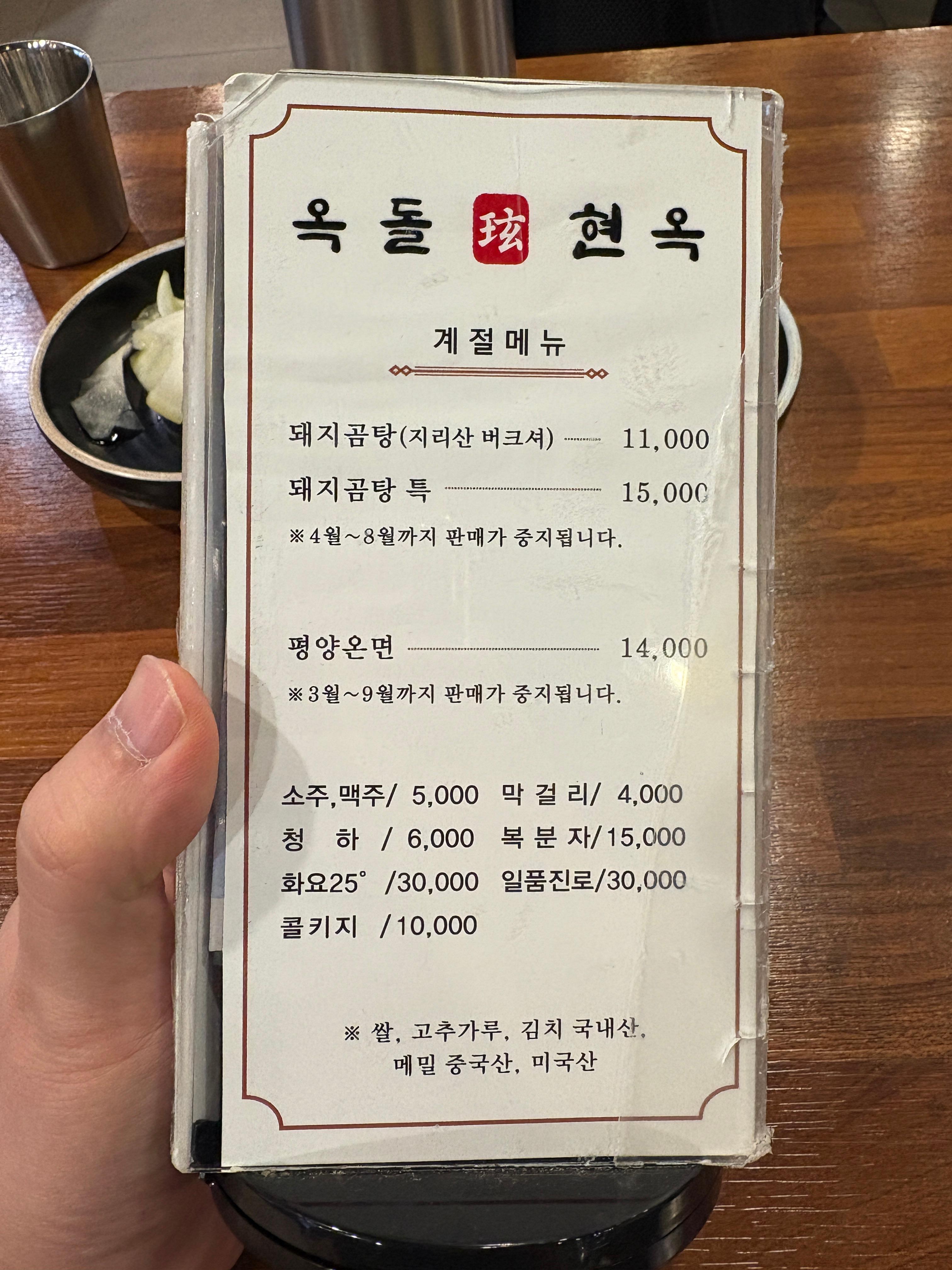 계절메뉴로 판매하시는 돼지곰탕과 온면도 겨울철 따뜻한 음식을 찾으시는 어르신들에게는 좋은 선택지가 될 것 같습니다. 주류 및 음료 가격대는 요즘 음식점 표준 정도인 것 같구요, 콜키지는 10,000원을 받으시네요. 평냉/어복쟁반과 와인 마시는게 또 묘미입니다 ㅎㅎ