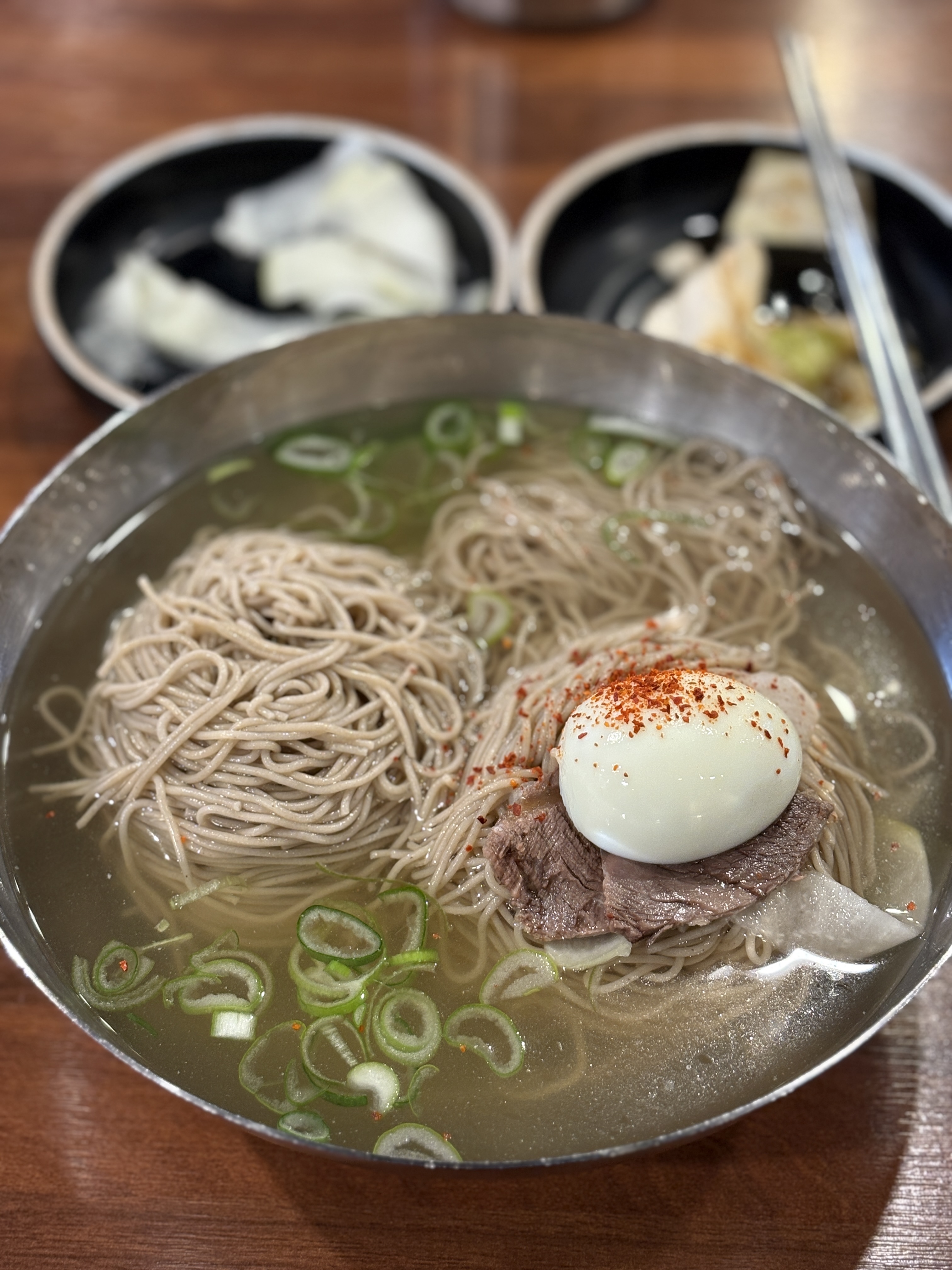 비주얼적으로 보았을 때는 을지면옥이 떠오르는 담음새입니다. 뿌려진 고춧가루와 파를 보아도 을지면옥이 떠오르는.. 고명으로 사태 2조각과 달걀 반개가 올라가있습니다. 그리고 앞서 말씀드린대로 곱배기를 시켯더니 그냥 두덩이가 나와버리는 ㄷㄷ...
