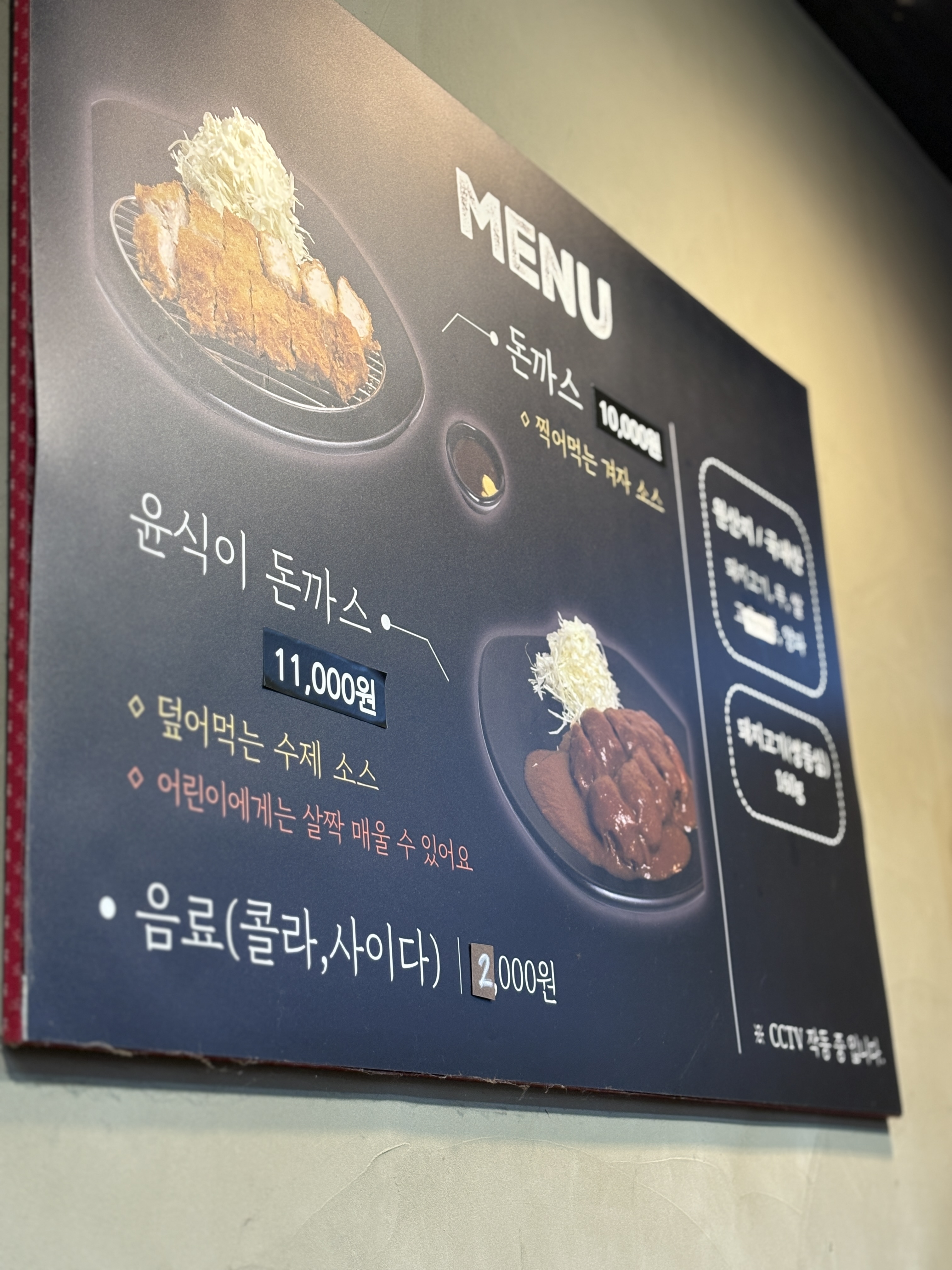 벽에 걸려있는 메뉴판에 보이는 것은 단 두가지 메뉴, '돈까스(10,000원)' 과 가게명을 담은 '윤식이 돈까스(11,000원)'