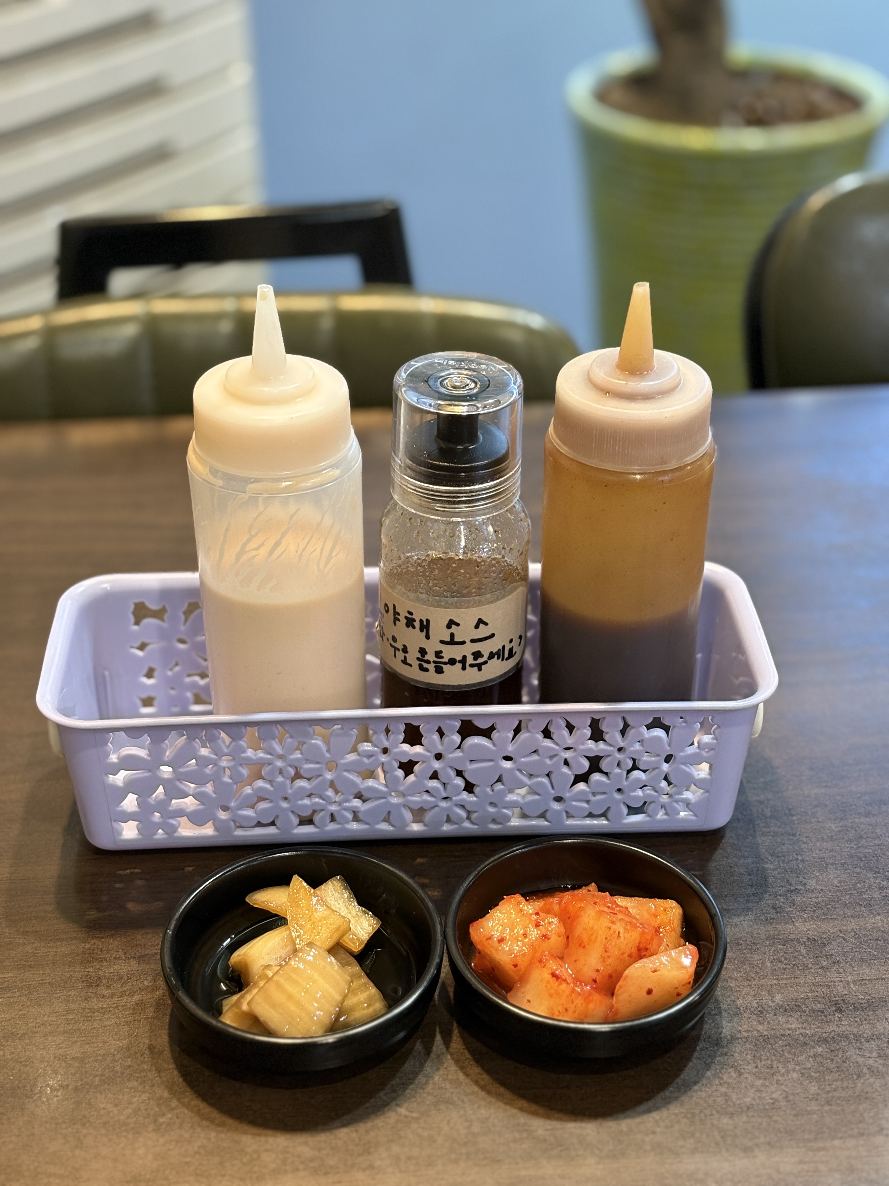 좌측부터 마요베이스의 샐러드소스, 오리엔탈 베이스 샐러드소스, 그리고 돈까스 소스 순서입니다. 양배추에 뿌려먹을 수 있는 소스가 두가지 버전으로 준비되어있어서 좋았습니다. 별거아니지만 양파 절임과 깎두기도 깔끔하니 맛있었습니다.
