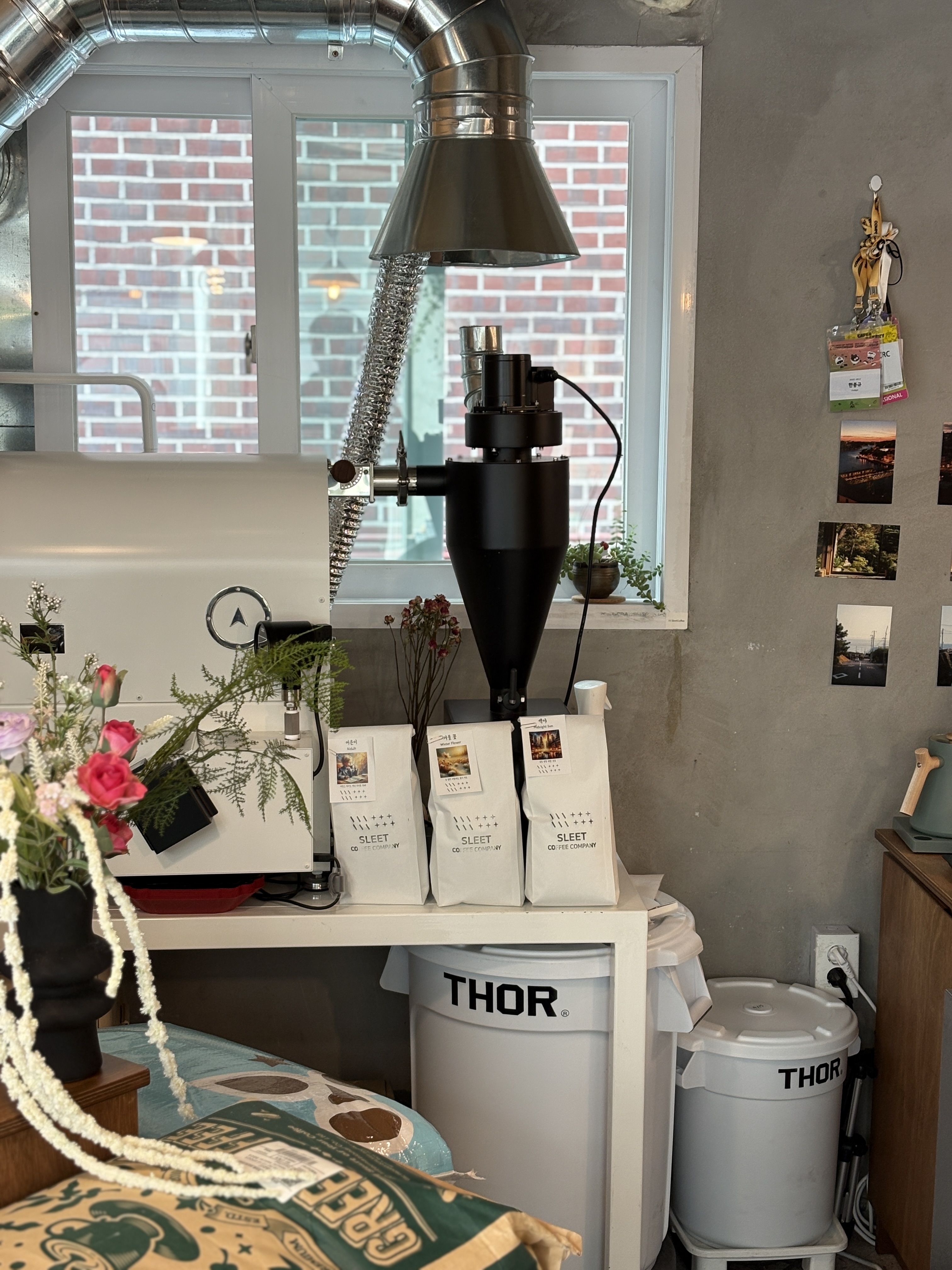 한켠에서는 직접 로스팅 하는 장비들도 구비되어있는데요, 이따금씩 들리면 직접 커피 로스팅 하는 장면도 마주칠 수 있고, 가끔씩은 다른 업계 분과 함께 심도있는 커피 원두에 대한 토론을 나누시는 모습도 볼 수 있습니다. 커피 관련 강의도 하시고 원두에 대한 질문에도 아주 반짝이는 눈으로 설명해주시는 사장님을 보면, 이런 집을 왜 나는 이제야 발견했는가 하는 아쉬움마저 드네요 ㅎㅎ