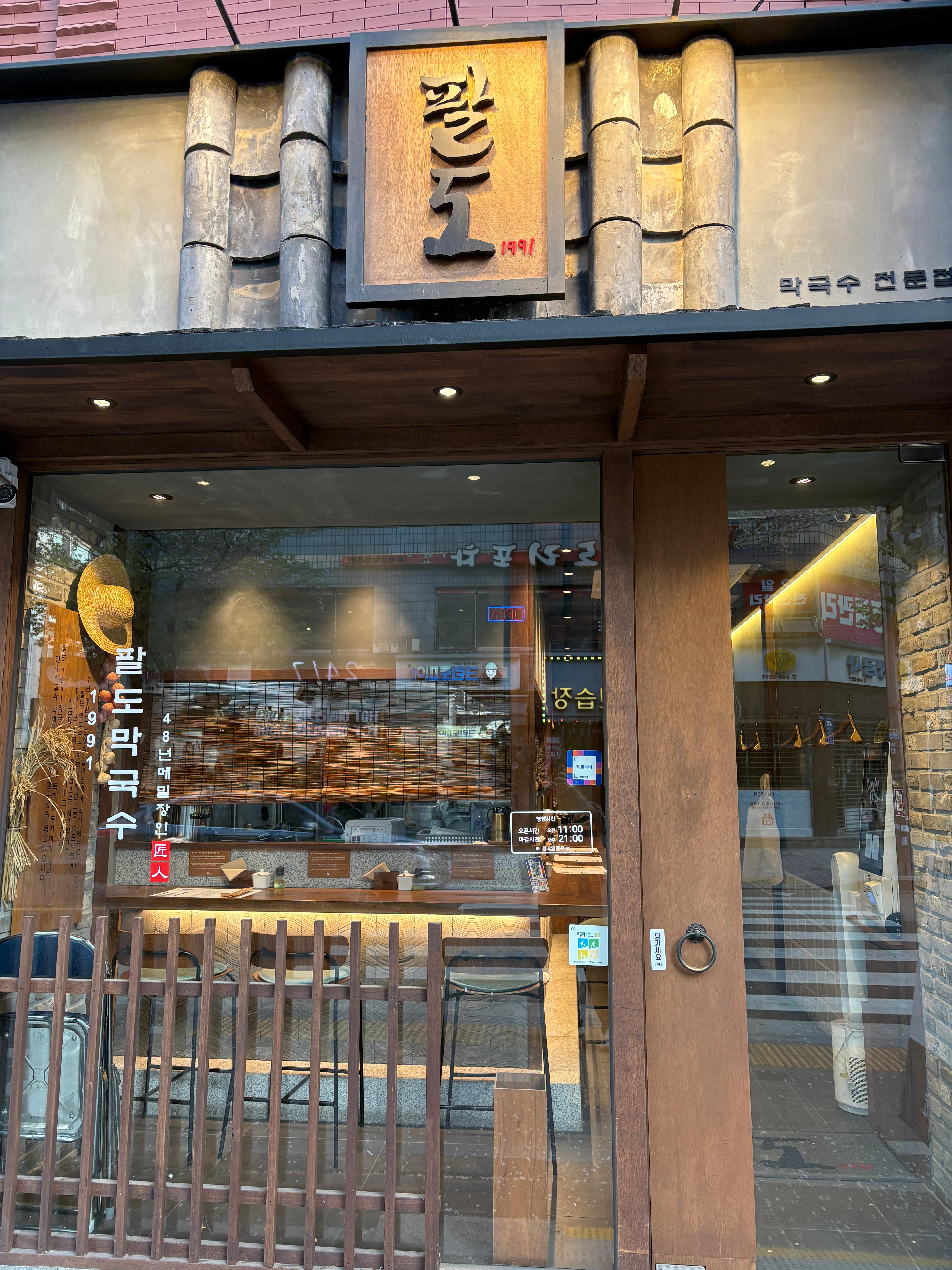 매장 외관은 전통적인 요소를 최대한 가미한 듯 합니다. 나무자재를 이용하여 마감을 했고, 문고실부터 밀짚 모자등의 소품 디테일까지 '메밀 막국수'집에 가장 잘 어울리는 외관을 갖추시려고 노력한 듯 합니다. 요즘 유행하는 깔끔한 현대적인 인테리어도 좋지만 이런 느낌의 인테리어도 괜찮네요 ㅎㅎ 외국인 친구가 막국수를 좋아한다면 (...겠냐..?) 데려오면 좋아할 듯한 분위기 ㅎㅎ
