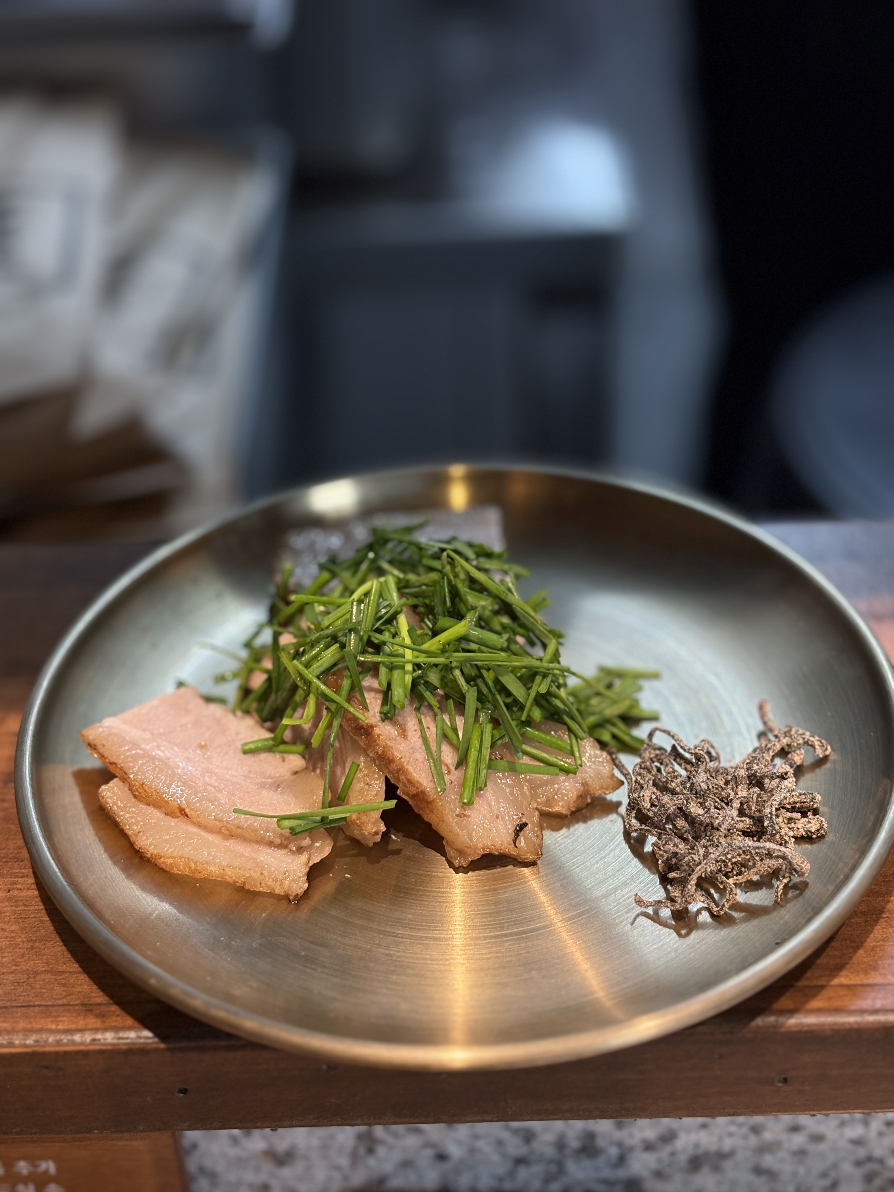 팔도 1991 막국수가 좋았던 점 중 하나가 또 있습니다. 바로 이 항정수육인데요, 잘 삶아낸 기름진 수육이 1인이 먹기에 딱 적당한 양으로 나옵니다. 가격도 아름다운 무려 4,000원... 위에 올라간 것은 영양부추 같구요, 옆에는 일식에서도 가끔 볼 수 있는 시오콘부(다시마소금절임) 같네요. 생각보다 궁합이 잘 맞았는데, 시오콘부를 너무 많이 얹어 먹으면 짜니까 주의하셔야합니다. 양도 적당하고 아주 야들야들하게 잘 삶아진 수육이라 매우 만족도가 높았습니다. 혼자와서 곁들여먹기 정말 좋네요.