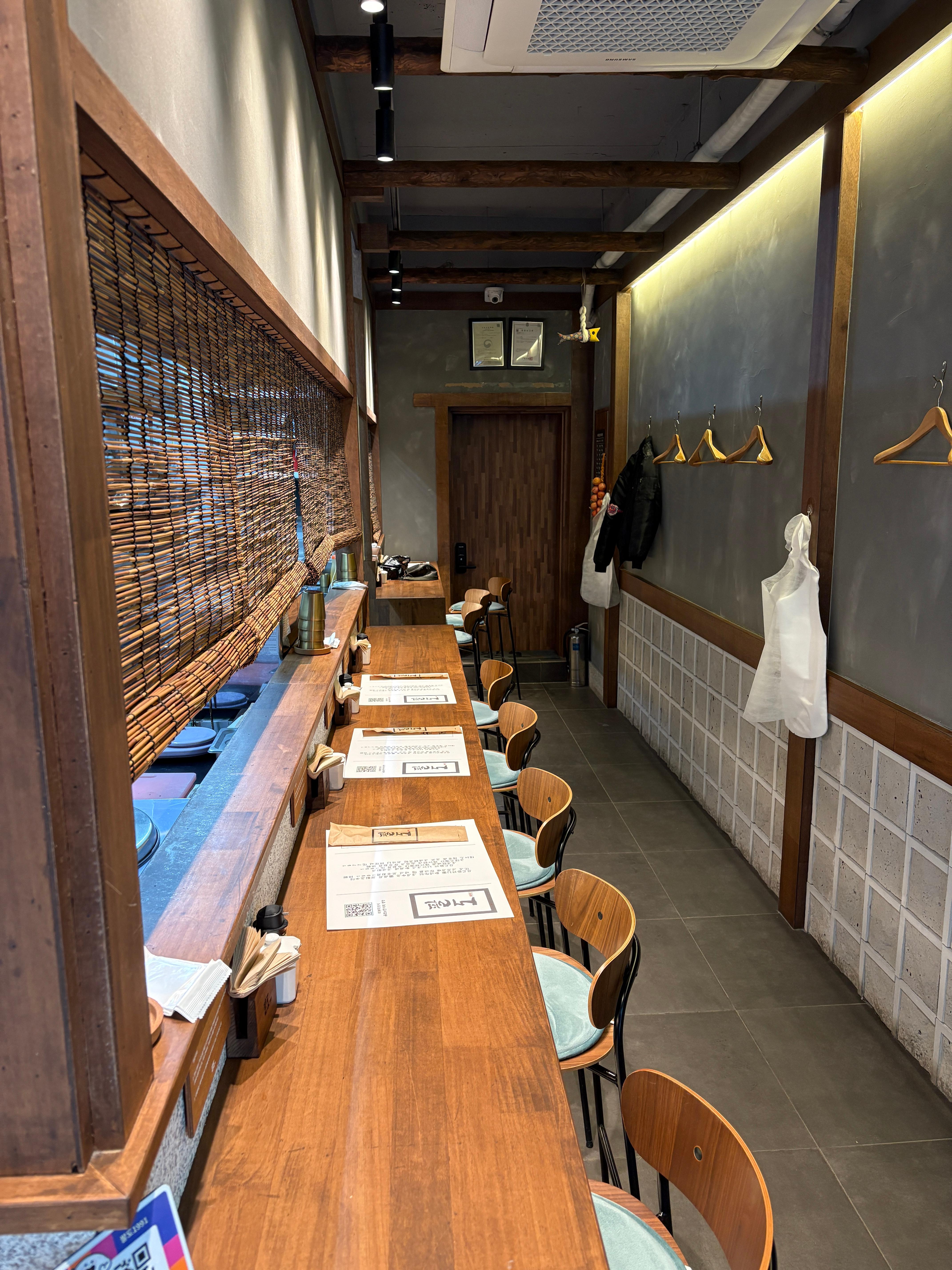 내부는 전석 카운터석으로 이루어져있습니다. 근처에 직장인들이 점심시간에 많이 찾는다고 하는 만큼, 혼자서 와서 빠르게 먹고 일어나기에 좋아보이네요. 여럿이서 와서 먹기는 힘들겠지만 둘이서 오기엔 나쁘지 않은 느낌. 제가 식사하는 동안에도 2인 팀들이 제법 들어왔습니다. 그리고 카운터석의 장점인 서빙이 빠르고 인건비를 줄일 수 있는 구조라서 택하신 것도 있는 것 같습니다.