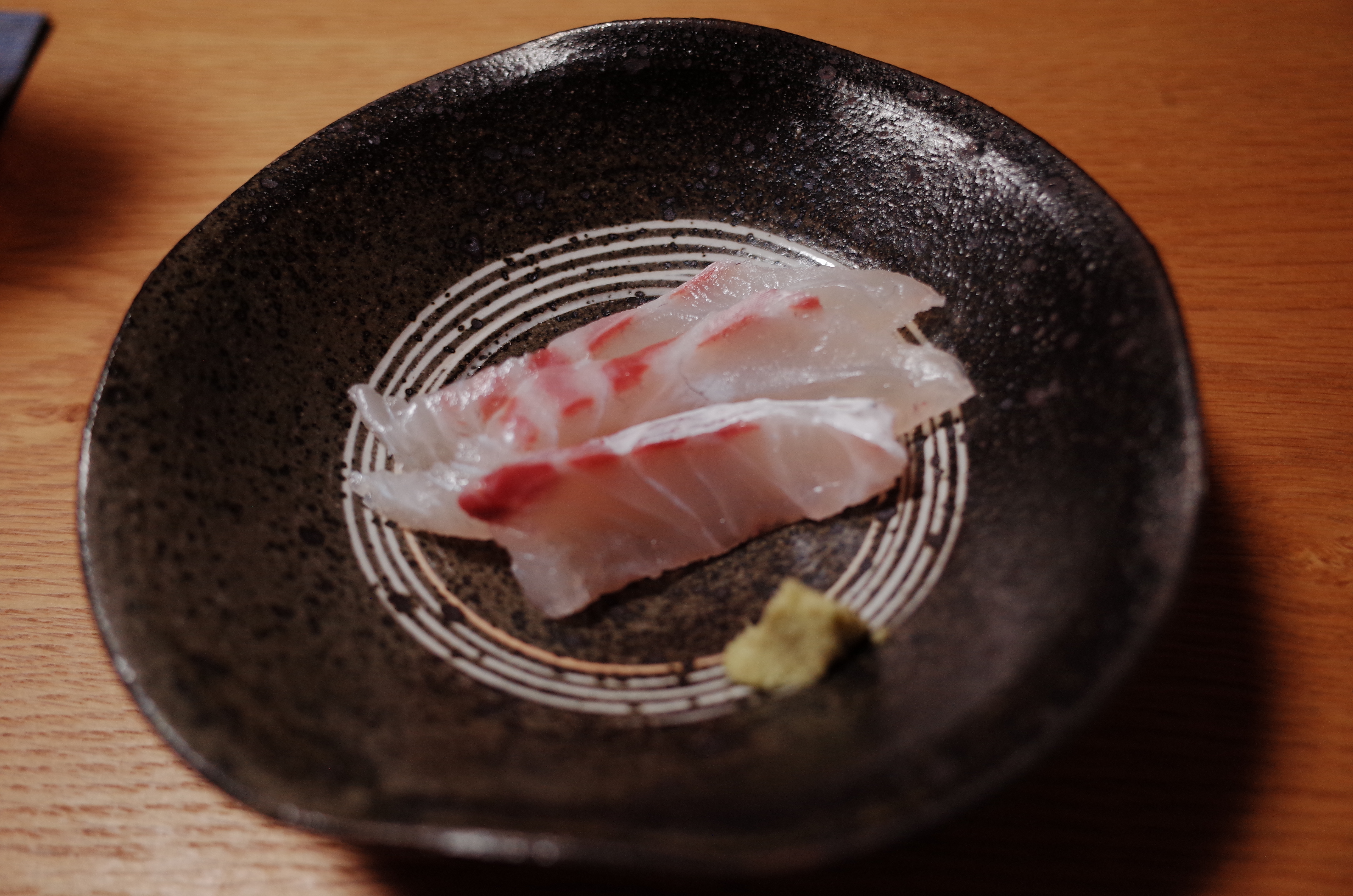자리에 앉아 간단히 맥주를 한잔 시키면 (물론 저는 제로맥주..) 오츠마미로 숙성회가 나옵니다. 도미 종류였던 것 같은데 적당히 숙성되어 식감과 풍미를 모두 끌어올린 느낌이었습니다. 스타트부터 기분 좋은 시작입니다.