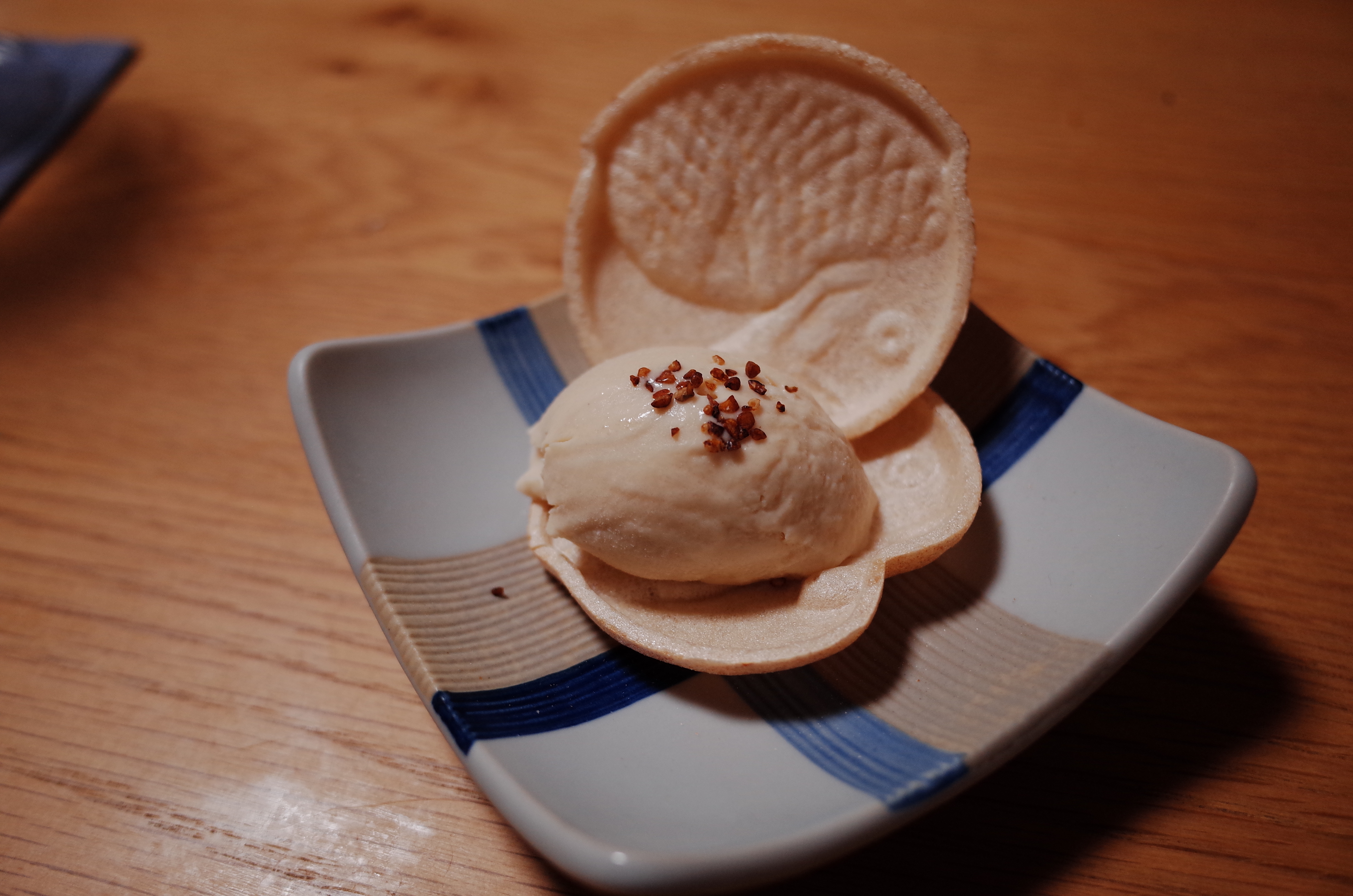 마무리는 호지차 아이스크림 모나카입니다. 직접 모두 만드신거라고 하시네요. 고급 스시집에서 가끔 나오는 메뉴이기도 한데요, 호지차 아이스크림 모나카가 나오는 곳 중에서 맛없던 곳은 한군데도 없던 것 같습니다 ㅎㅎ