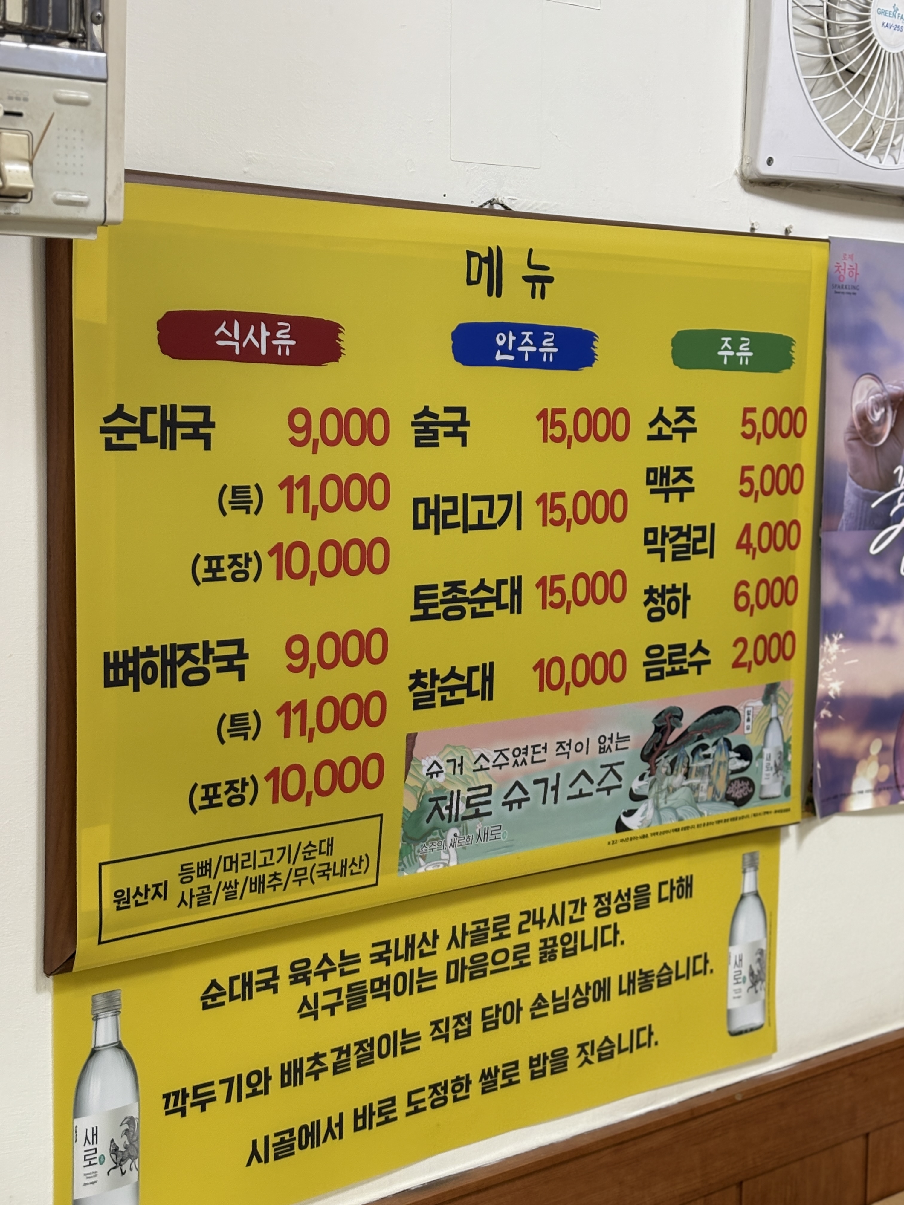 메뉴는 역시 단촐합니다. 순대국과 함께 독특하게 뼈해장국을 팔고 계셨구요, 안주로 건더기가 푸짐한 순대국물인 술국, 머릿고기 수육과 순대 2종이 보입니다. 주류 가격은 어느새 서울 평균이 되어버린 5,000원. 원산지가 모두 국내산인게 아주 아름답죠? 손님이 없는 시간이었지만 가게 내부의 테이블이라던지 집기류라던지 모든 것이 매우 깨끗하게 관리되고 있었습니다. 그리고 아래 글귀에서 볼 수 있듯이, 식구들을 먹인다는 마음으로 음식을 준비하신다고 하니, 거짓말을 아닌 것 같습니다. 매우 기대가 되네요.