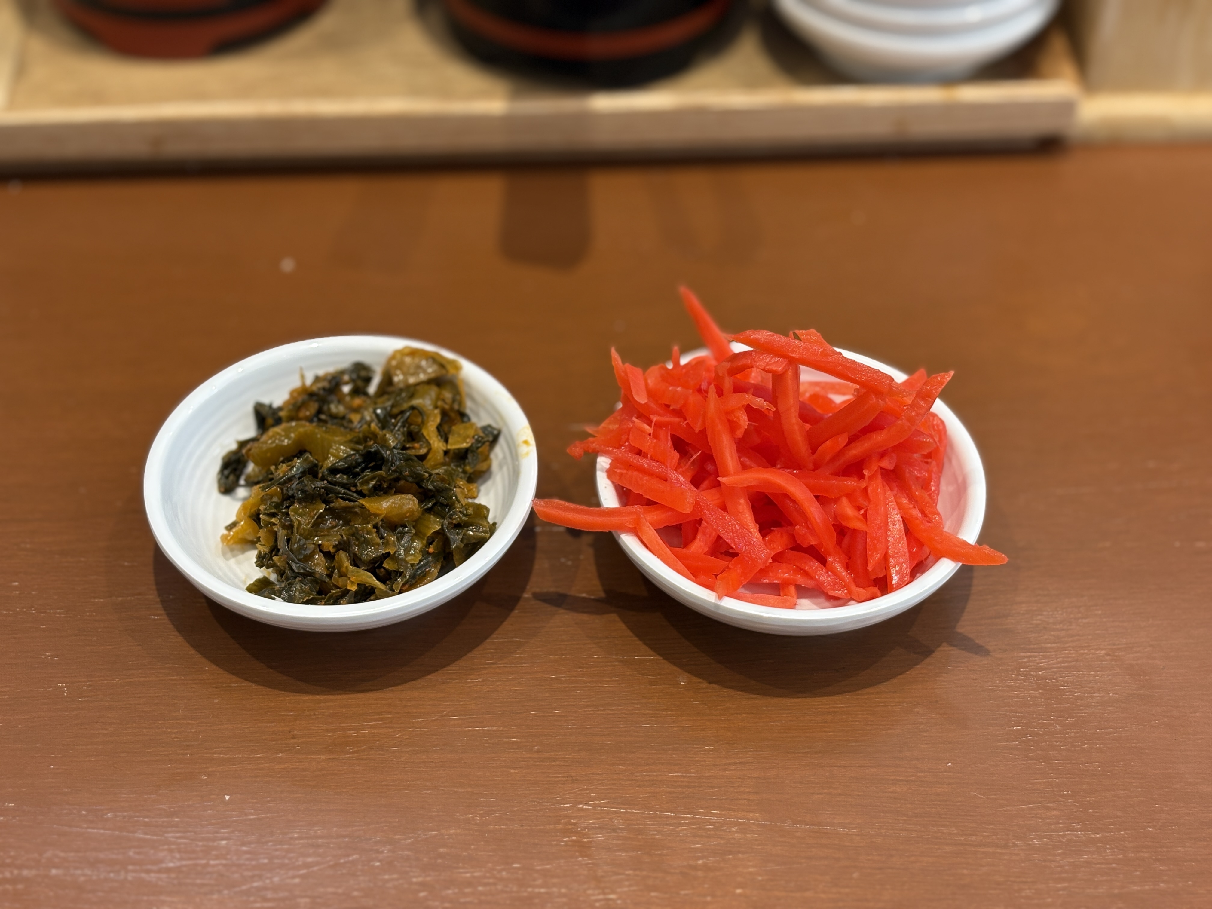 음식을 주문하면 기본 반찬이 나옵니다. 다나카 무침으로 추정되는 반찬과 시제품 생강입니다. 개인적으로 돈코츠 계열을 먹을 때 생강을 매우 좋아합니다. 돼지의 느끼한 맛을 잘 잡아주기 때문이죠.
