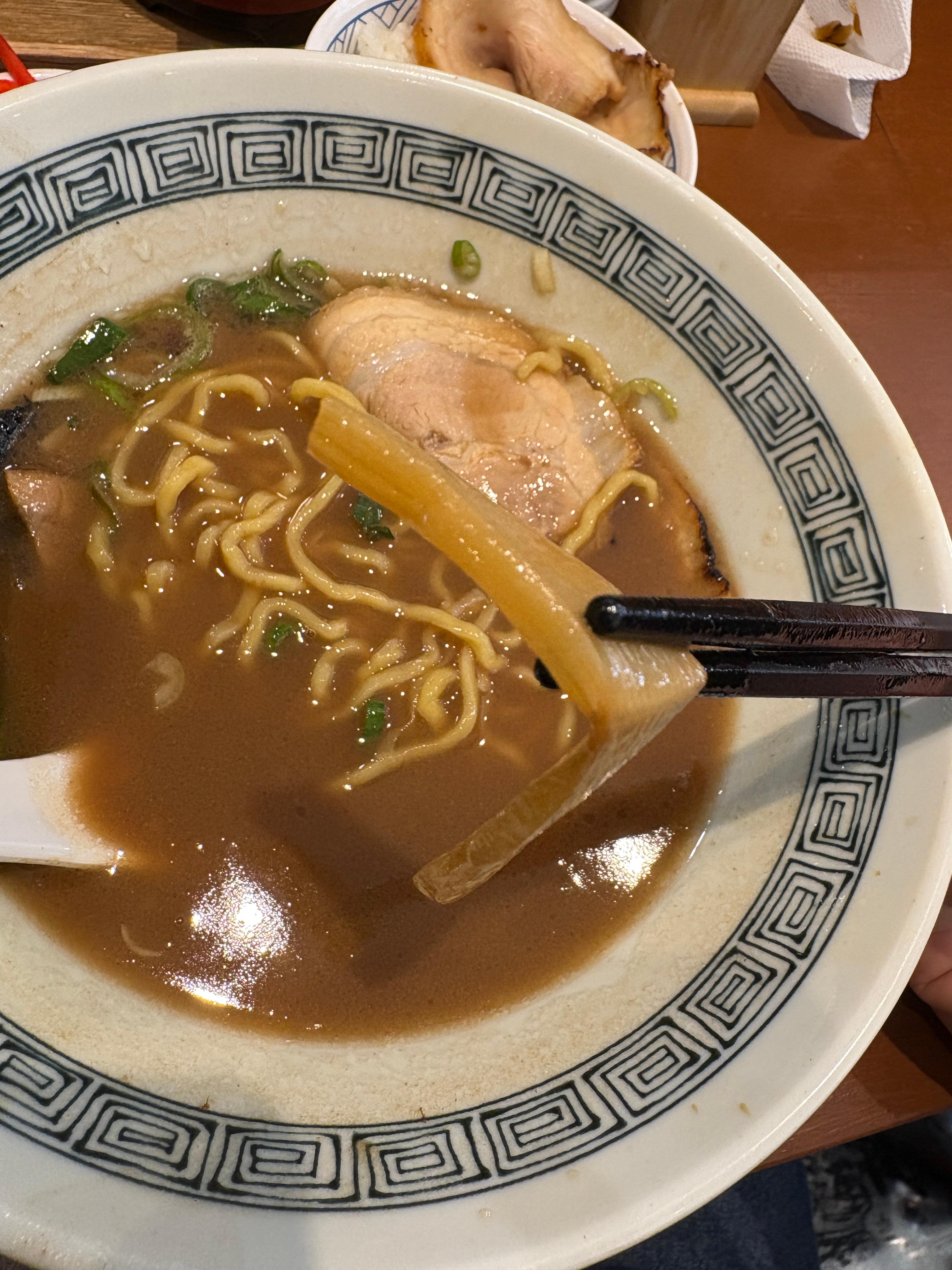 맛스구의 최대 장점인 아주 두텁고 진한 육수입니다. 염도를 짜게로 한 것도 있지만 기본적으로 이런 정도의 깊은 맛이 나는 라멘 국물을 좋아하는데요, 그것도 이렇게 집에서 쉽게 갈 수 있는 거리에 있다니 너무나도 행복한 순간이었습니다. 돼지 잡내는 전혀 없으면서도 아주 오랜 시간 고아낸 깊은 육수 맛에 쇼유의 맛이 치고 들어옵니다. 왜 이에케 라멘 이야기가 나오는지 알겠네요. 동네가 동네이다보니 기본적인 세팅은 염도를 좀 낮게 해두시고, 매니아들은 염도 조절을 해서 먹을 수 있게 배려를 해주신 것 같습니다.