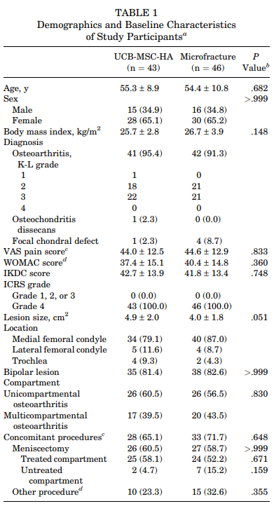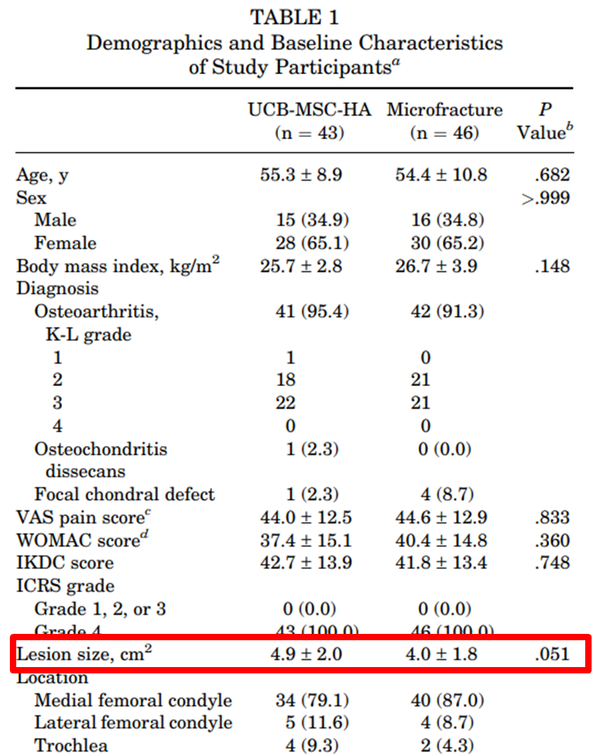 으로 나누어서 결과를 비교하였습니다. 이 두 그룹 환자의 성상이 달라버리면, 예를들면 카티스템을 도포한 환자군이 더 연골 손상이 덜한 사람들로 이루어져있다면 결과에 차이를 줄 수 있기에, 위와 같이 표를 통해서 두 군의 차이가 없음을 나타내줬네요.