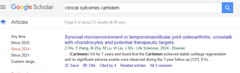 이외에도 학술 전용 검색 사이트인 Google Scholar를 통해 2024년 이후 카티스템의 임상적 결과에 대해 다룬 논문들을 검색해보았는데요, 국내에서 진행한 논문 이외에는 (해당 건도 오스굿씨 병의 치료에 관한 내용.) 특별한 내용이 없습니다.