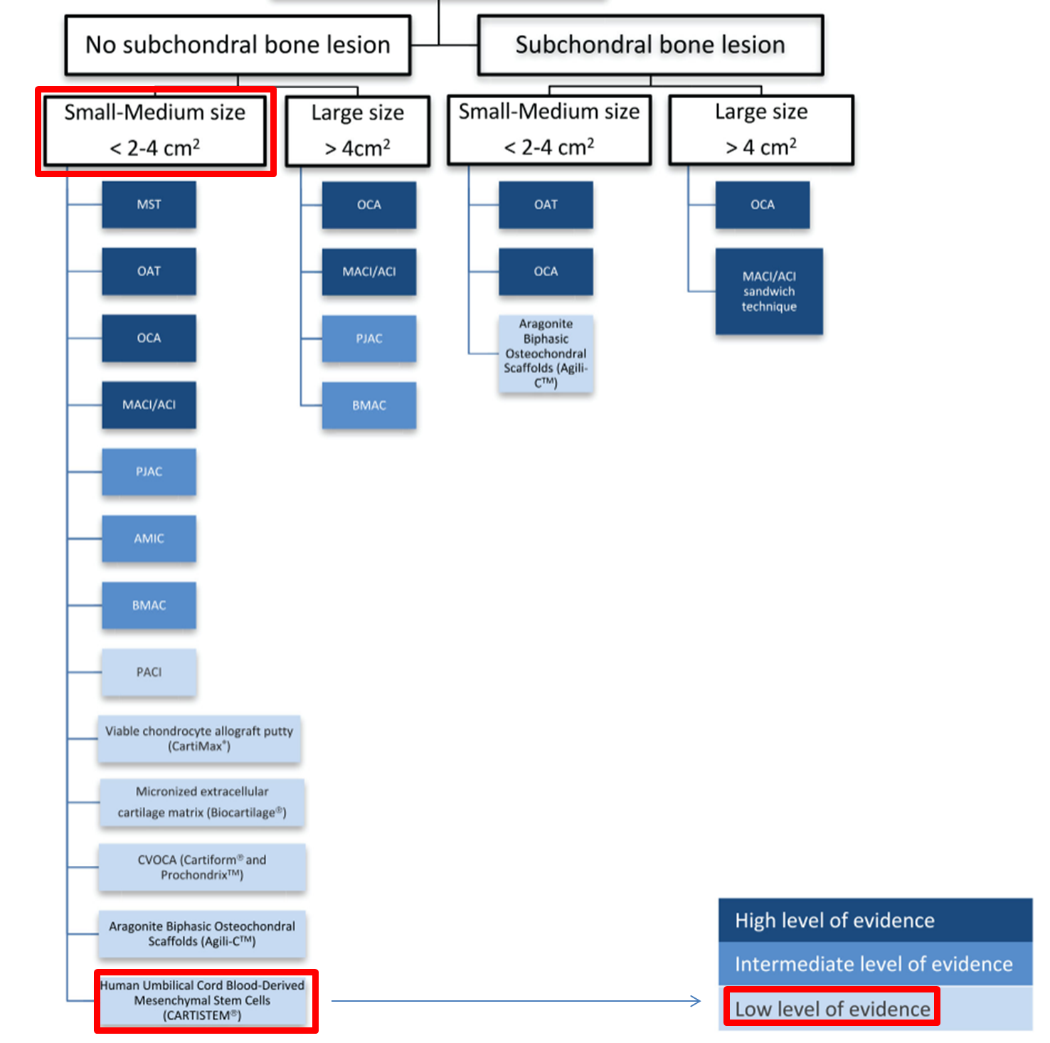 보시게되면 재미난 표가 하나 들어있는데요, 해당 논문에서 카티스템을 치료의 방법으로 소개하고 있지만, 연골 병변의 크기가 2-4제곱센치미터 이내에서만, 그 중에서도 'Low level of evidence'로 소개를 하고 있다는 점입니다. 달리말하자면, 제한된 병변의 크기 내에서만 써야하고, 치료 방법 선택지중에서는 우선순위에서 좀 뒤로 밀려있다는 의미입니다.