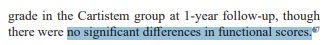 그 결과 값이 위 그래프가 보여주는 결과입니다. 수술 후 1년까진 차이가 없었지만, 3년뒤부터는 '통계적으로 유의미하게' 차이가 있다고 그래프는 나타내주고 있습니다. 그런데 이 그래프 차이가 어느 정도의 차이를 의미하는 걸까요? VAS점수라는게 30점인것과 20점인것과는 내가 느끼는 차이가 얼마나 있는 것일까요? 다른 논문들에서는 카티스템을 어떻게 평가하고 있을까요?