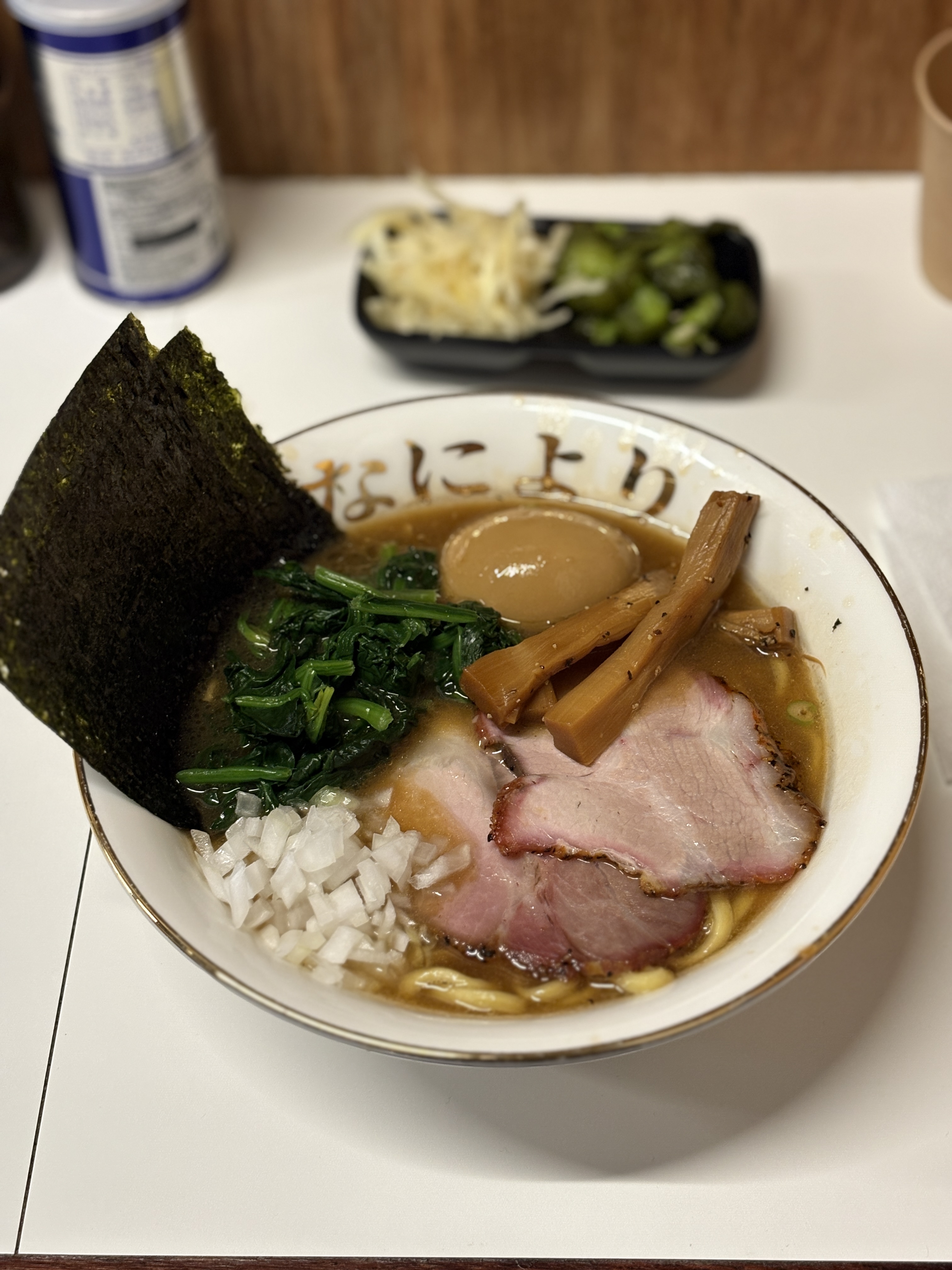 국물이 진득하기로 유명한 나니요리, 역시나 점도가 마치 중식 스프와 같은 끈적한 느낌이 다분했는데요, 육수를 낼 때 콜라겐 성분을 더 넣고 만드신 듯 합니다. 꾸덕한 느낌이 전 좋았습니다. 그리고 무엇보다 같이 나온 멘마가 두터운 편이고 상등품을 쓰는 것 같아서 멘마를 추가하길 잘했다는 생각이 들었습니다. 아지타마고는 살짝 내부가 차갑게 나오는 편이지만 거슬리진 않았습니다.