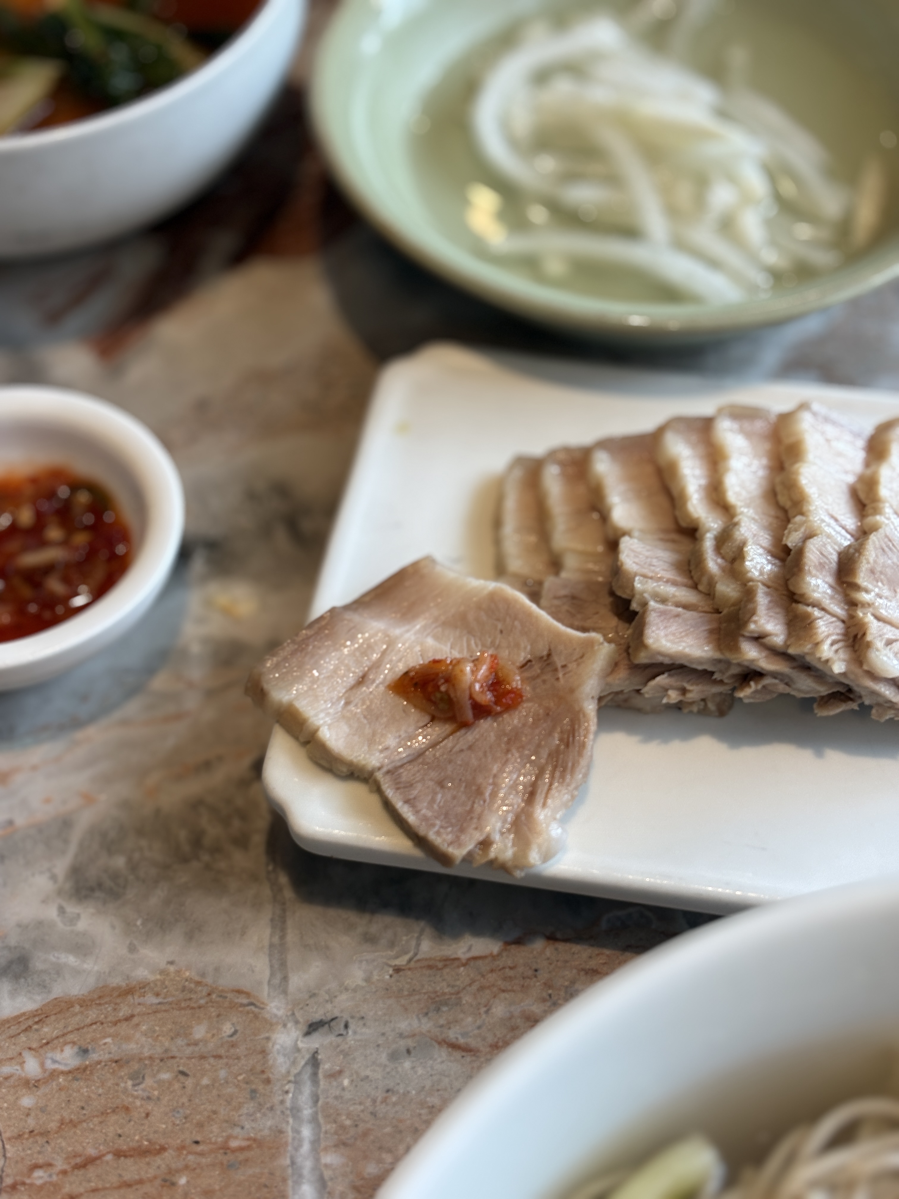 꾸미로는 기본적인 절임류들과 배, 그리고 수육이 2점 올라가있습니다.