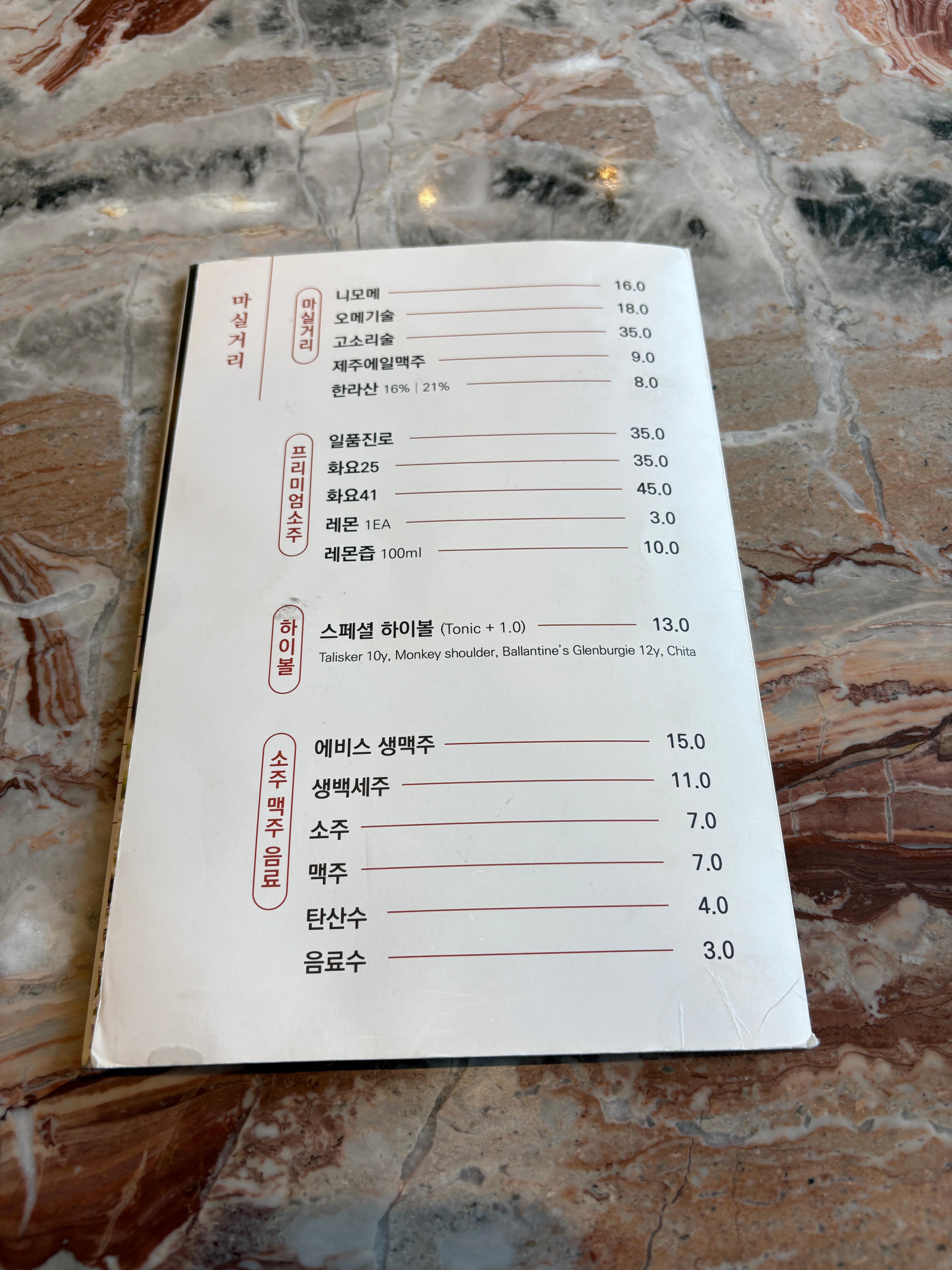 구비해둔 주류도 전통주와 하이볼을 포함해서 다양하게 갖추고 있는 점은 좋았습니다. 다만 역시 이번에도 가격이 미스.. 소주 7천원은 정말 적응이 안되네요..