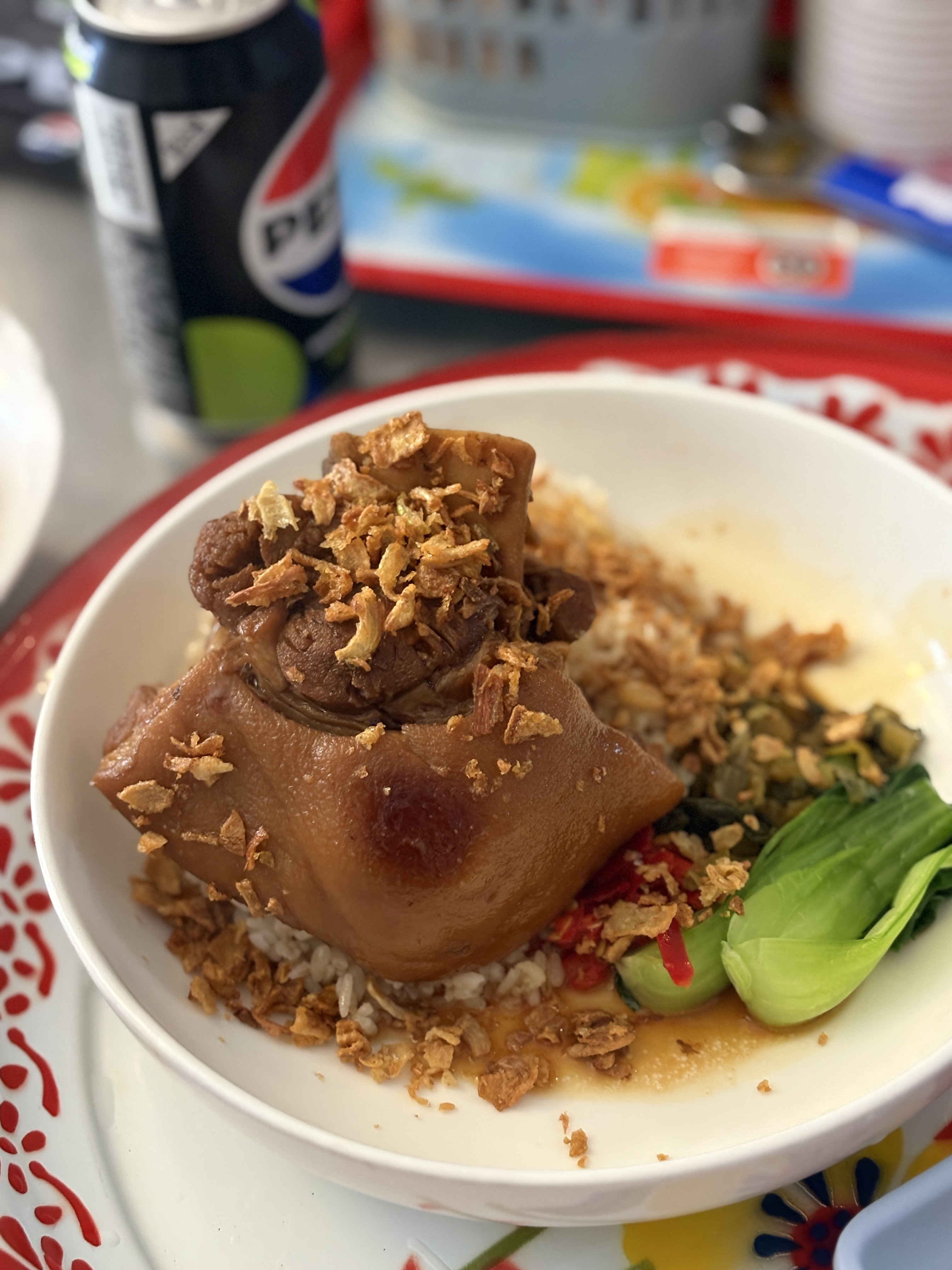 드디어 등장한 족발덮밥(13,000원). 아름다운 자태입니다. 서빙 및 치우기가 쉬워서 그런지 큰 그릇을 하나 더 깔아주십니다. 족발 뼈를 담기에도 좋아보이네요. 잘 삶아진 족발이 청경채와 고추, 그리고 샬롯 튀김등과 함께 나옵니다. 소스는 따로 옆에 주셔서 족발덮밥 위에 끼얹어 먹는 식으로 되어있네요.