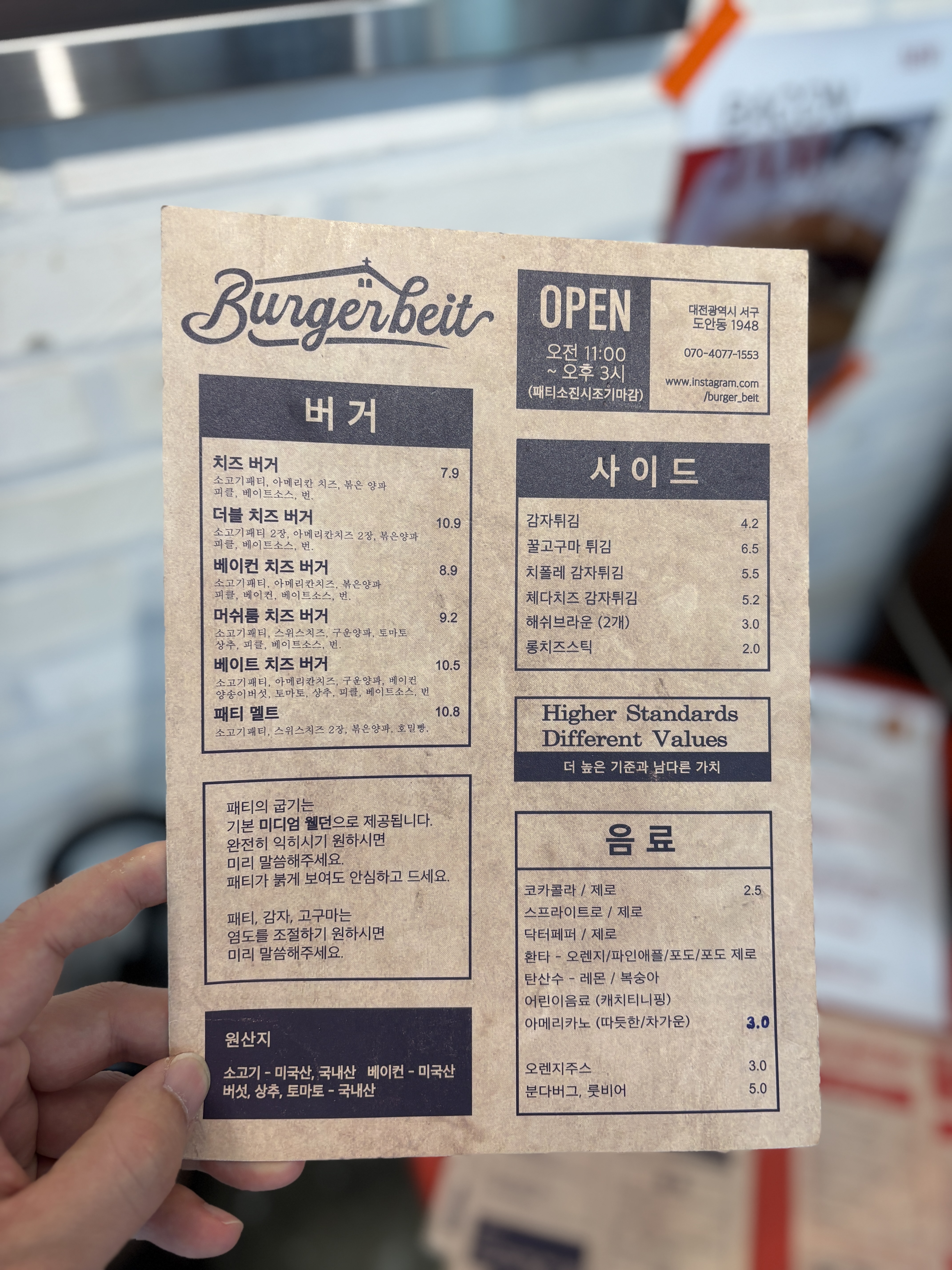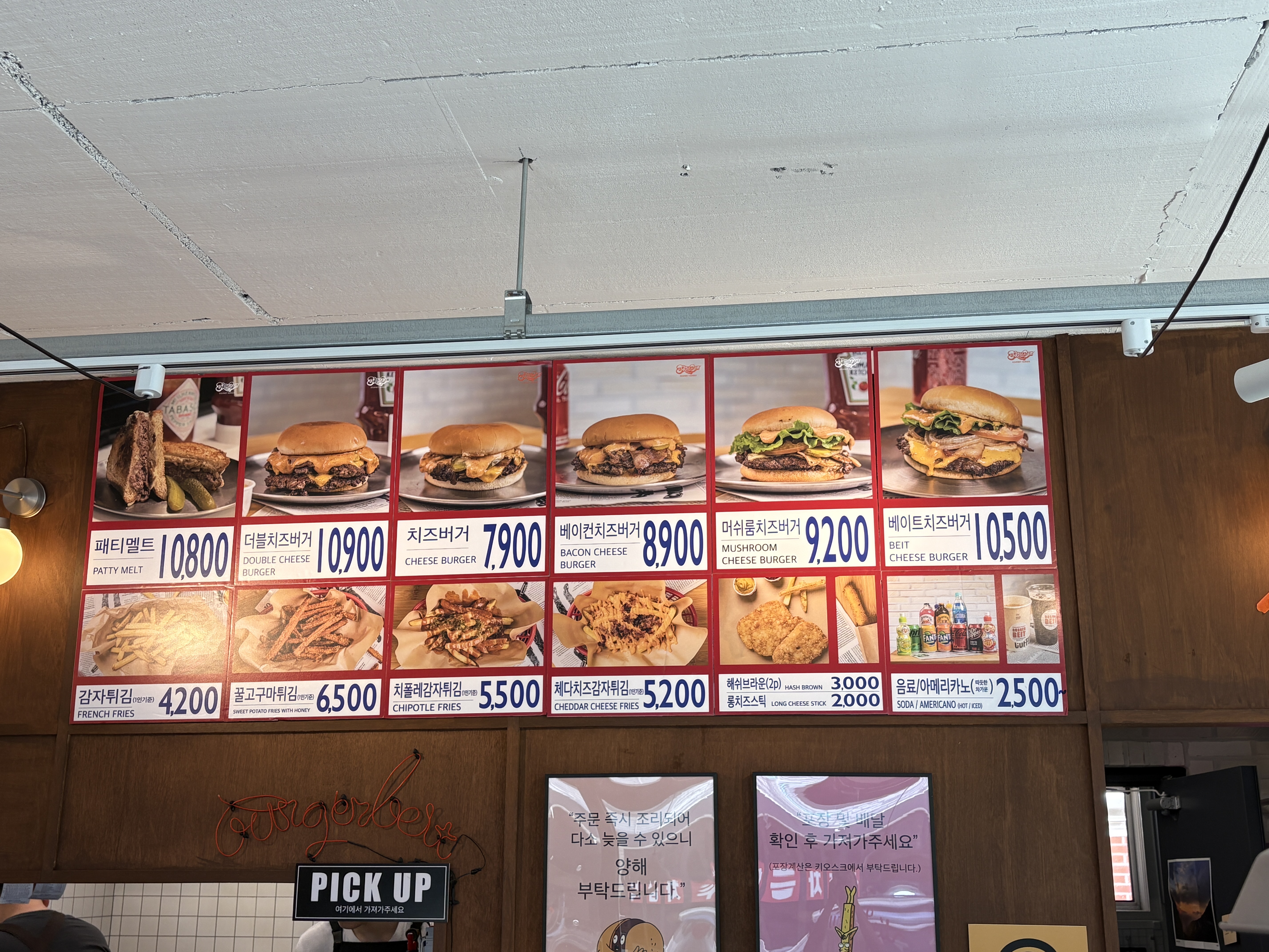 메뉴판을 살펴봅니다. 미국인이 인정하고 소개한 햄버거 맛집이어서 그런지 외국인들도 자주 찾아오는 모양입니다. 영어 메뉴판을 따로 구비해두셨네요. 외국인들에게는 이런 디테일이 반갑죠 ㅎㅎ 와이프는 리뷰에서 본 '베이트 치즈버거(10,500원)'을, 저는 패티와 치즈 본연의 맛을 느끼-하게 느끼고 싶어 '더블 치즈버거(10,900원)'을 주문했습니다. 야채가 들어가냐 안들어가냐는 중요한 차이지요 ㅎㅎ 취향에 맞게 고르시면 되겠습니다.