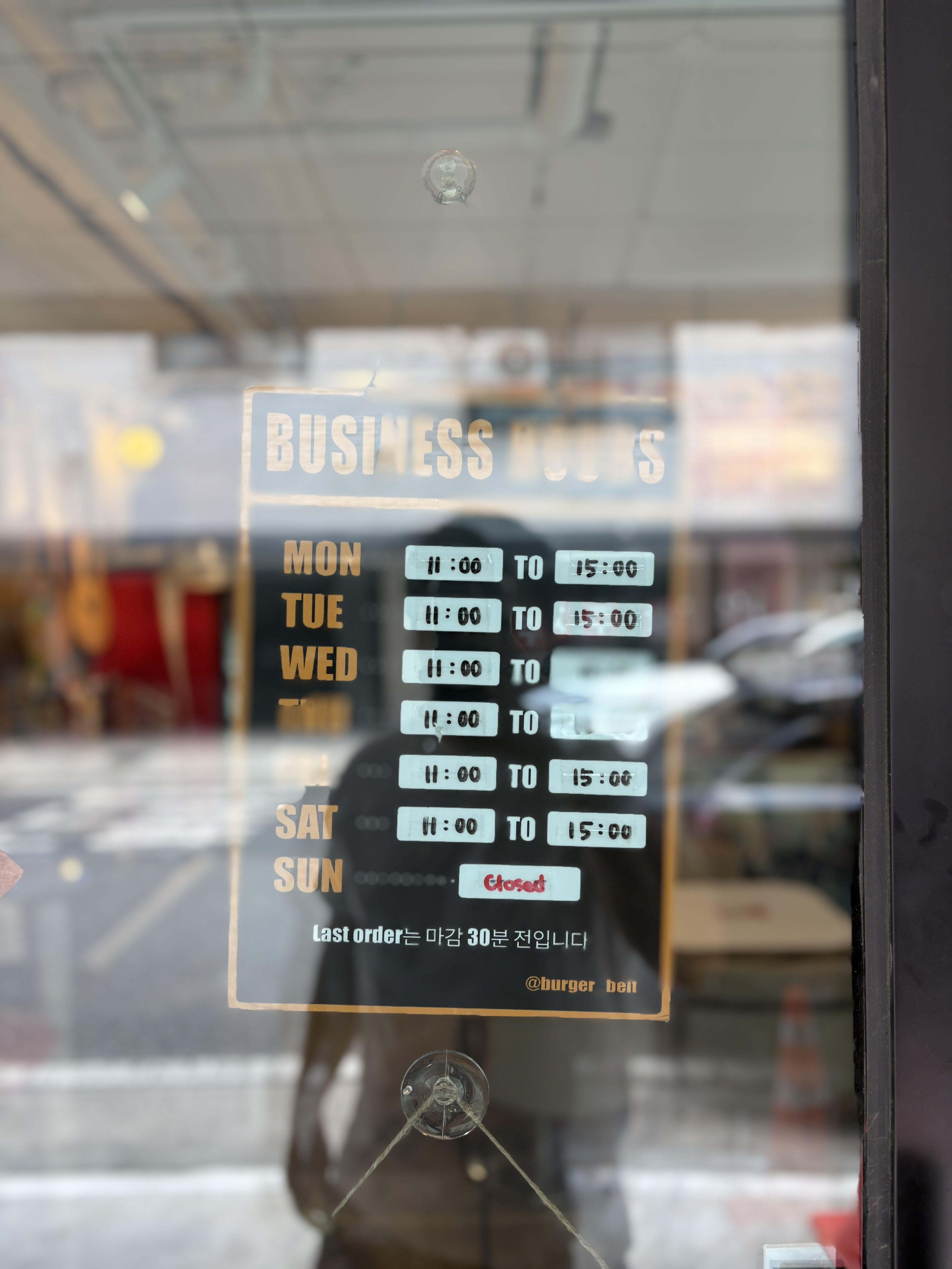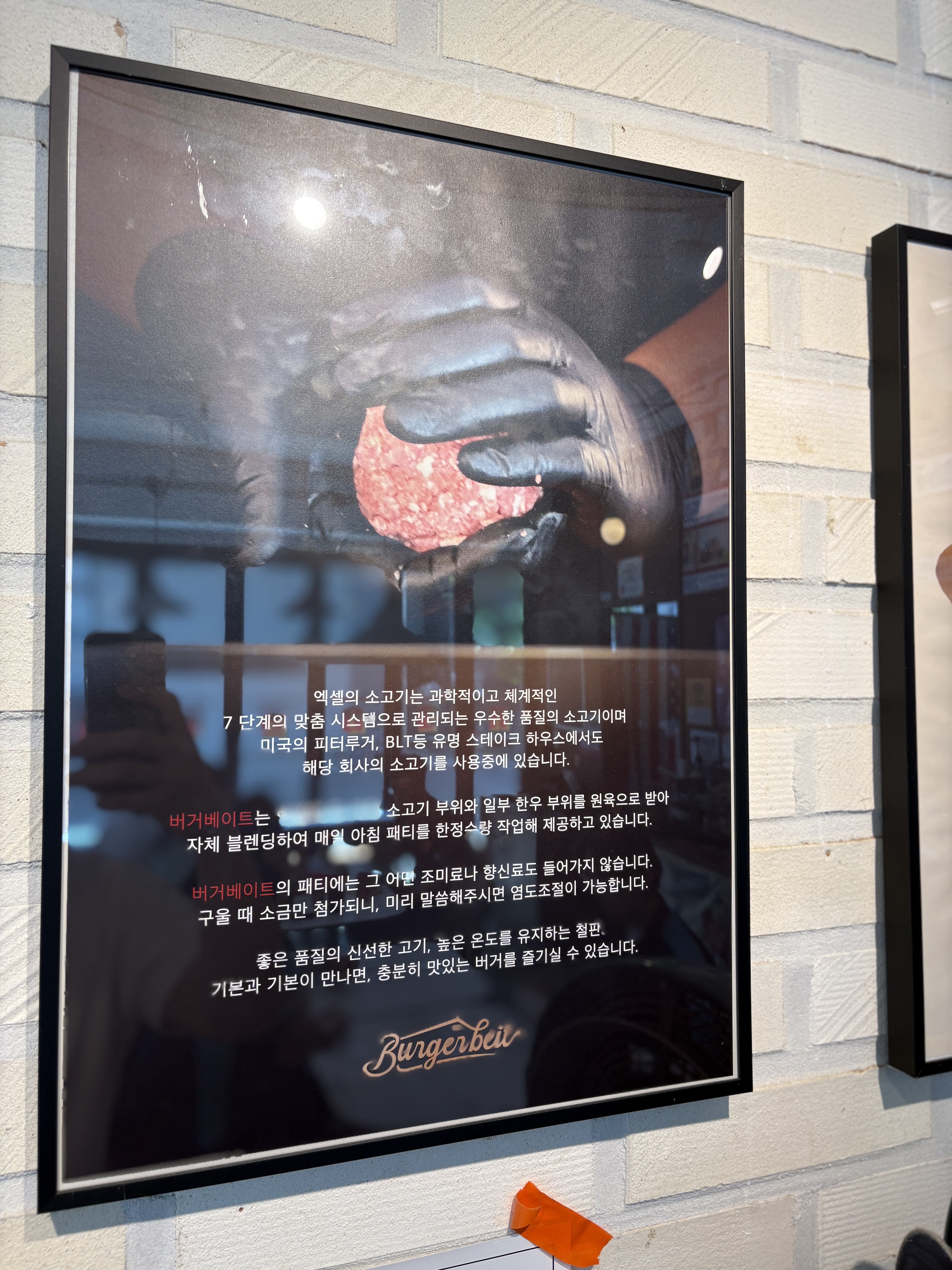 벽에 붙어있는 내용을 보니 유명한 피터루거 스테이크나 BLT등에서 사용하는 브랜드의 소고기를 사용하신다고하네요. 음식장사하실 때 좋은 재료를 써도 고객들이 몰라주는 경우가 있는데, 이렇게 공신력있는 업장에서 사용하는 제품을 쓴다고 설명해두신 것은 잘하신 것 같습니다. 잘 모르는 사람이 봐도 "아 이집 좋은 고기 쓰는구나" 할 수 있으니까요 ㅎㅎ 패티에는 소금 이외의 조미료나 향신료는 전혀 안쓰신다는 점에서 신뢰가 가는 대목입니다.
