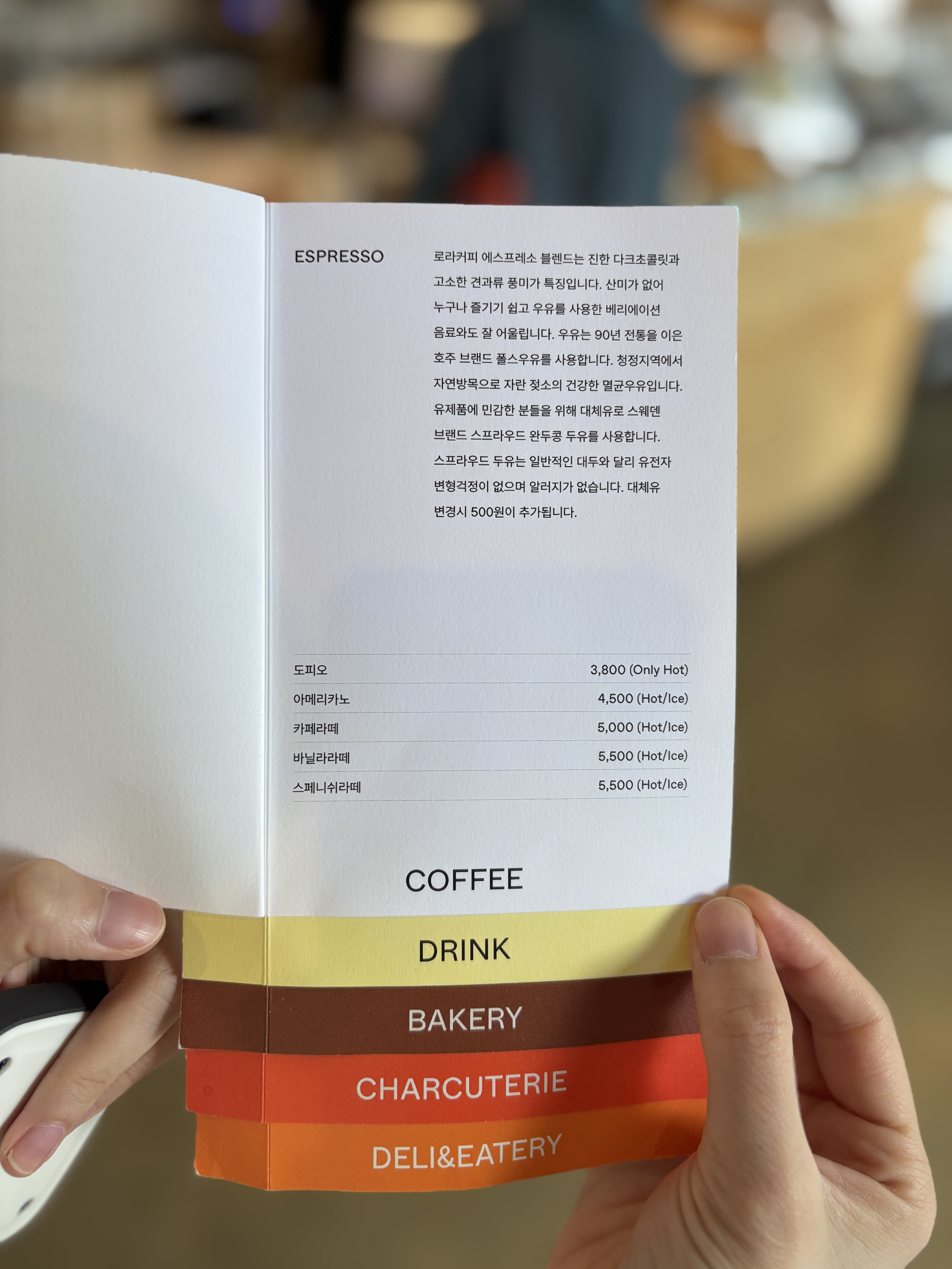 메뉴판도 느낌있게 층층이 다른 색으로 제작하셔서 어느페이지에 뭐가있는지도 직관적으로 펼칠 수 있게 되어있었습니다. 아메리카노보다는 내려주시는 커피를 좋아하는 저희에겐 딱 맞는 카페죠 ㅎㅎ