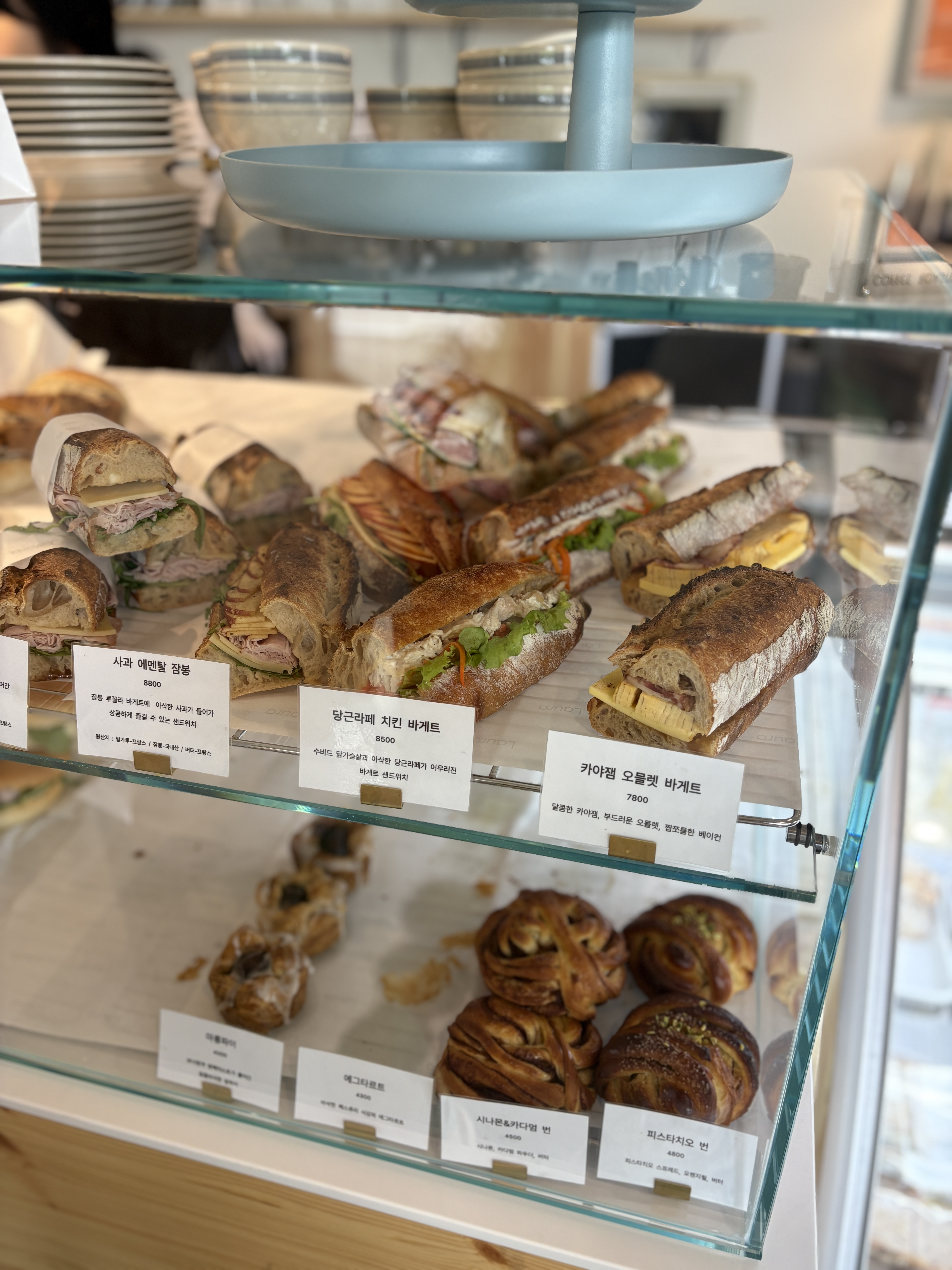 매장 입구부터 보이는 진열대에서 빵이 먹음직스럽게 보이고, 양옆으로 공간을 분리해둔 것도 좋아보였습니다.