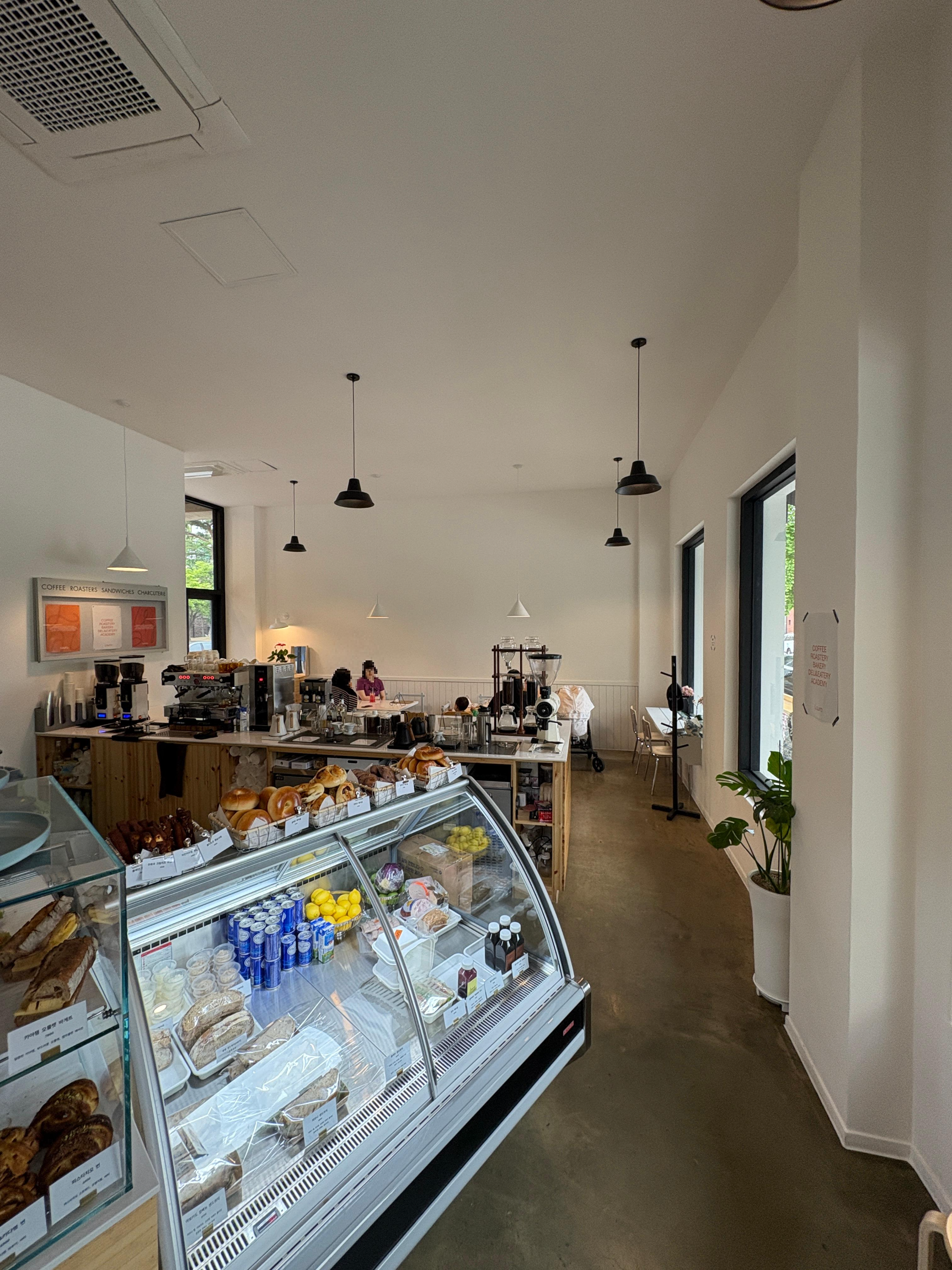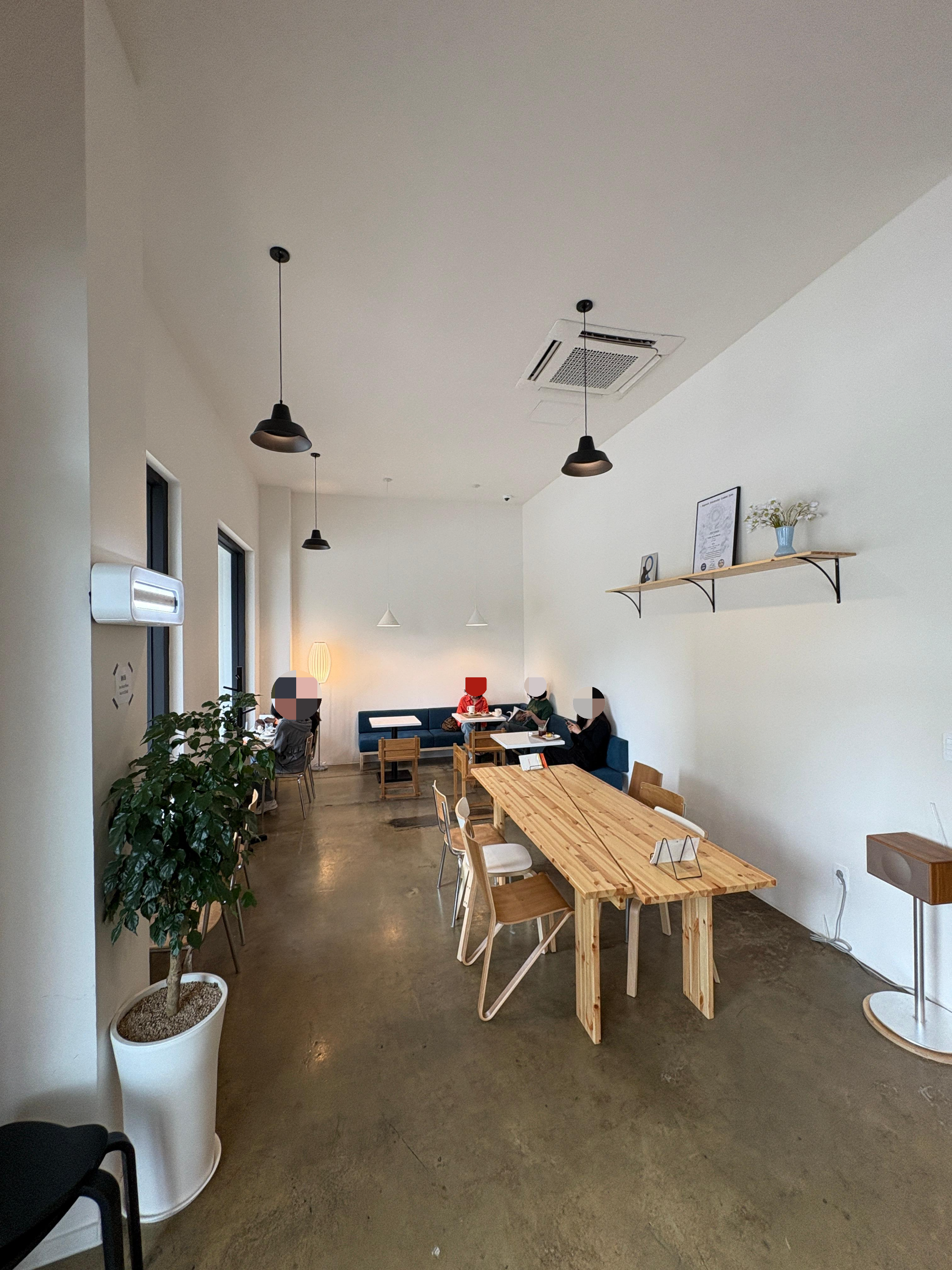 매장 내부는 테이블을 밀도있게 배치하시기 보다는 널찍널찍하게 공간을 쓴 느낌입니다. 이런 주거지 근처에 위치한 카페 특성상 의자가 많은 테이블이 필요할 수 있는데, 다인용 테이블을 목재로 두고 뒤에는 소규모용 테이블을 따로 둔건 좋은 것 같습니다.