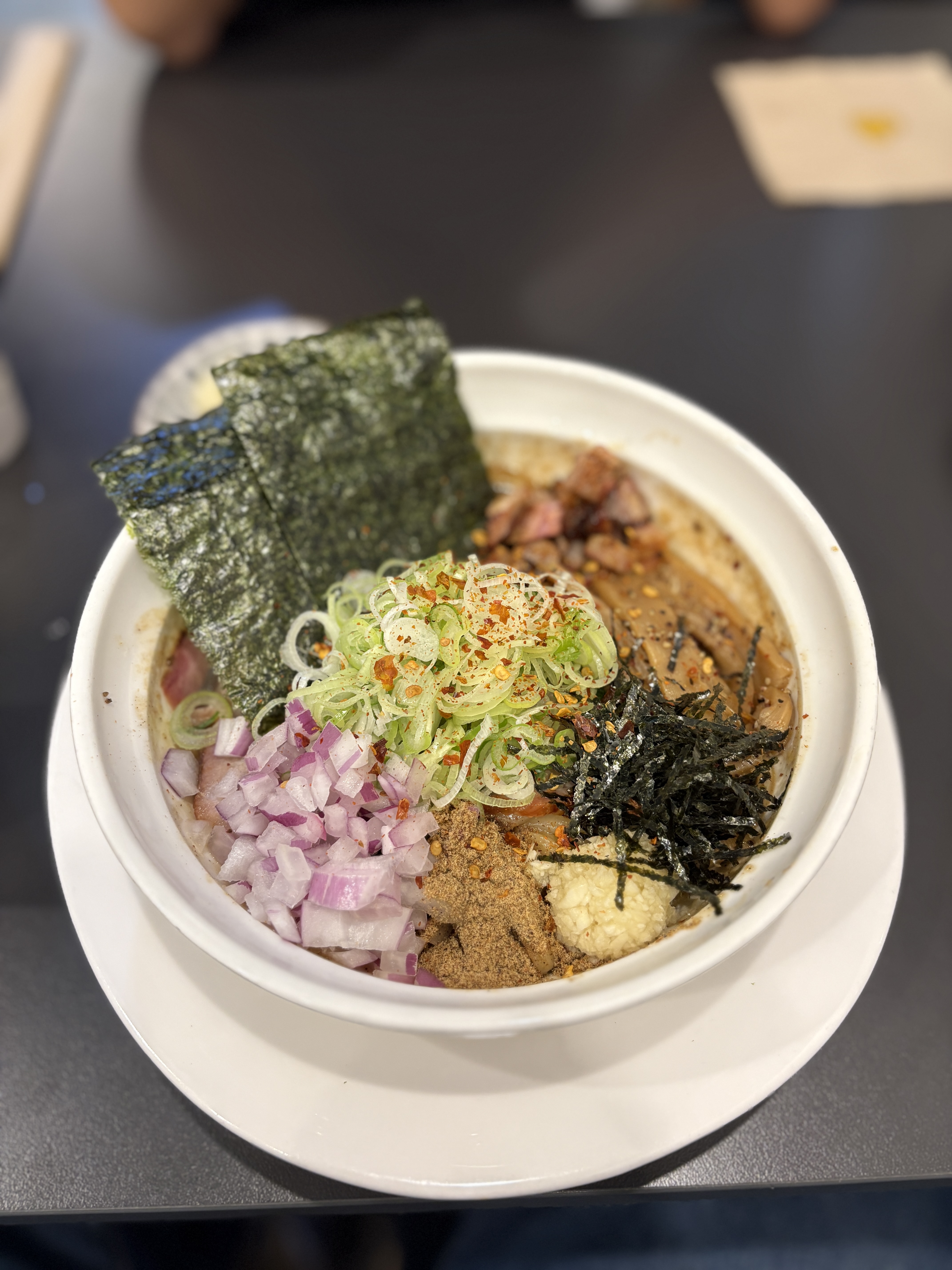 각종 야채들과 김가루, 차슈와 멘마와 어분가루가 들어있구요, 스프는 매니아 단계 답게 염도가 진하게 느껴졌습니다. 멘마를 상당히 아낌없이 주시는 점이 마음에 들었습니다. 자체적으로 스프도 있는데, 적양파에서도 수분이 나오는지 꽤나 자작하게 먹을 수 있는 비빔라멘입니다.