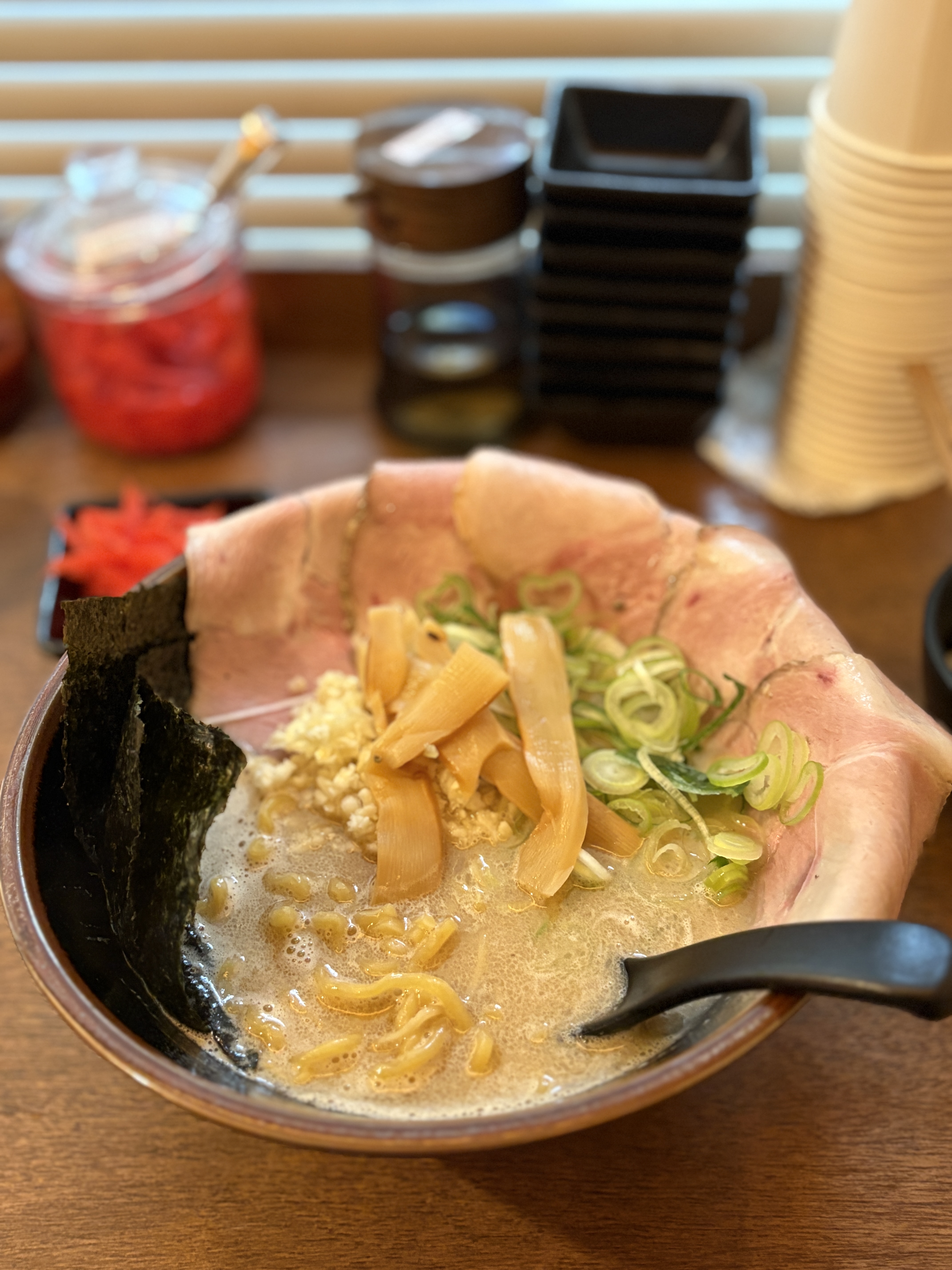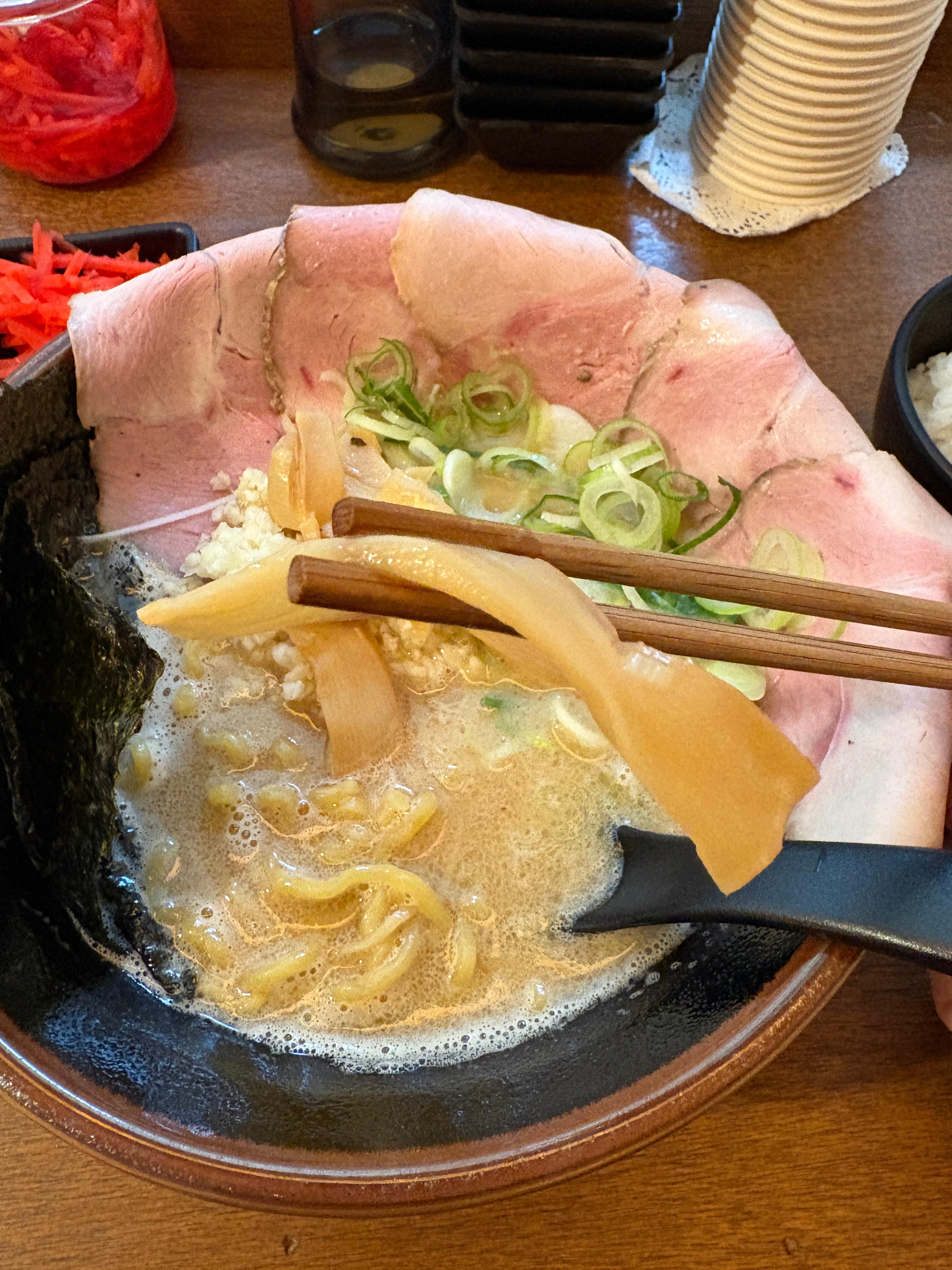 드디어 나온 멘야코이시의 시그니쳐 '돈코츠라멘' 멘마와 파, 김, 그리고 수비드 차슈를 얇게 썰어 내주셨습니다. 특이한 점은 다진마늘이 미리 듬뿍 올라가서 나온다는 점. 어떤 사람들은 마늘이 미리 올라가져있는 것에 대해서 부정적으로 보시기도 하지만, 사장님이 매일 아침 본인 라멘을 드시면서 만든 일종의 궁합이 맞는 비율로 넣으셨을 것이라는 믿음으로 전 그대로 먹는 것을 좋아합니다.