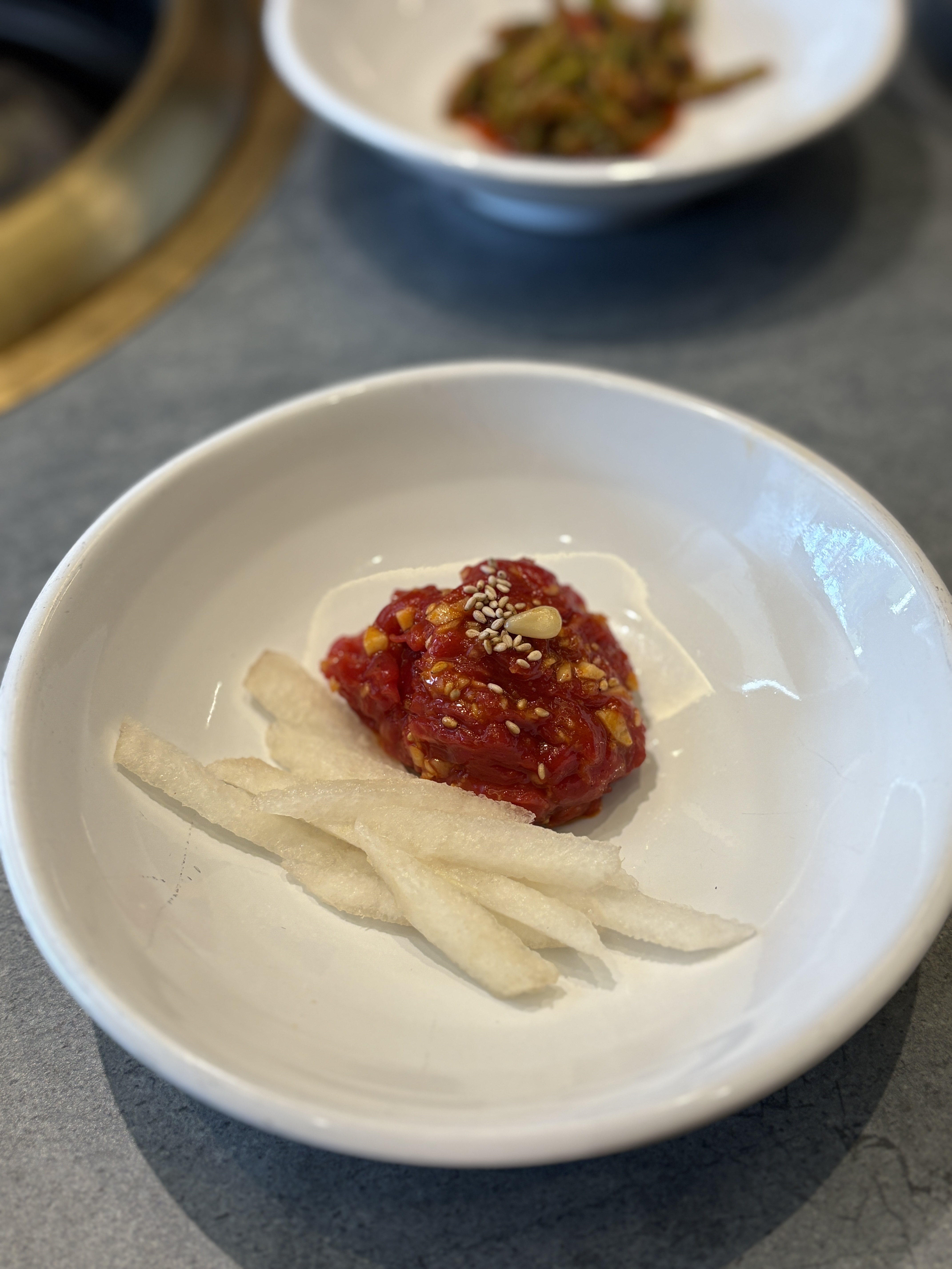 처음 맛본것은 육회였는데요, 달큰하면서도 고소한 양념이 매력적이어서 기본찬이라는 생각은 절대 안들었습니다. 추가해서 더 먹고 싶었지만 (유료) 고기양이 많아서 참았습니다 ㅎㅎ