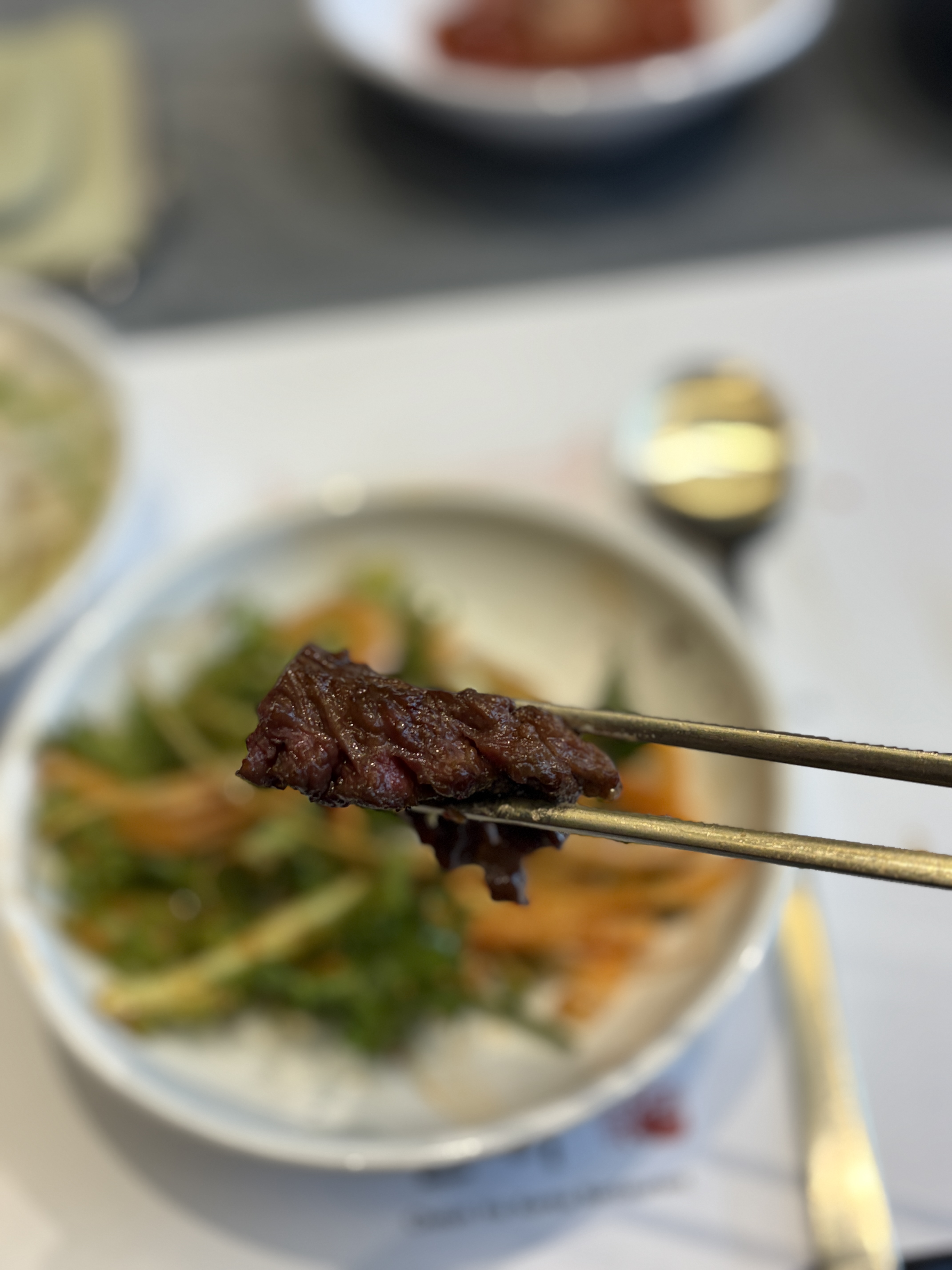 바로 평양냉면입니다. 고기를 주문하면 후식 냉면으로 주문을 할 수 있는데요 (7,000원) 후식냉면이라는 이름이 무색할정도로 양도 넉넉합니다. 식육식당 시판 물냉면으로 만든 후식냉면과는 차원이 다릅니다 ㅎㅎ 메밀의 구수함과 적당히 끊기는 식감이 살아있는 제가 사랑하는 평양냉면 스타일입니다.
