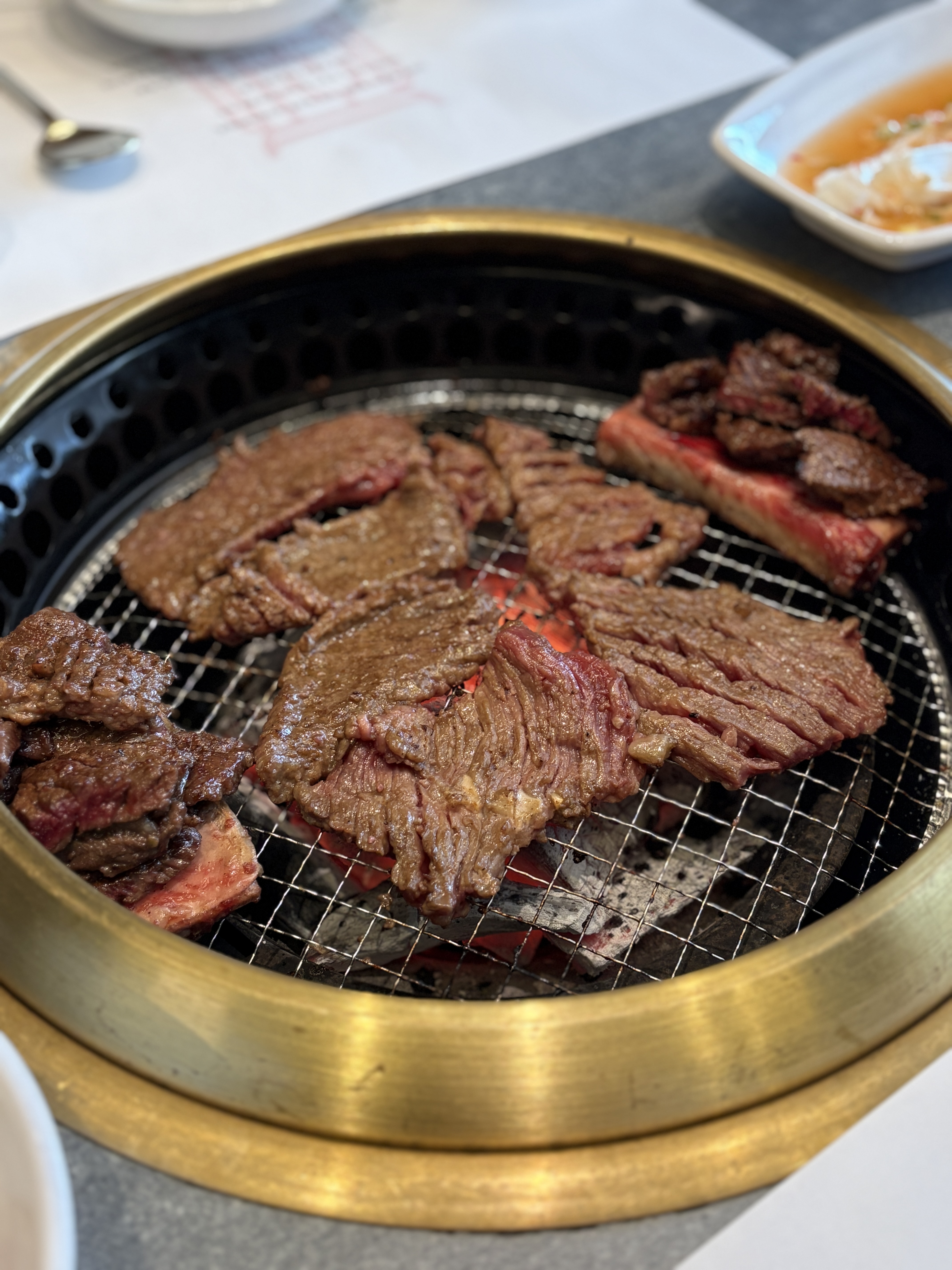숯불판위에서 지글지글 구워지는 양념갈비.. 뼈를 손질해서 받침을 만들어주시고 구워진 고기를 위에 올려주십니다. 약간 미디엄 레어정도로 익혀주셔서 추가로 더 익히시고 싶으면 불판위에서 더 익혀드시면 되는 구조입니다. 숯도 좋은 퀄리티 숯을 쓰시는 듯한데 비장탄인지 뭔지 물어보지를 못했네요. 담에 가면 물어봐야지..