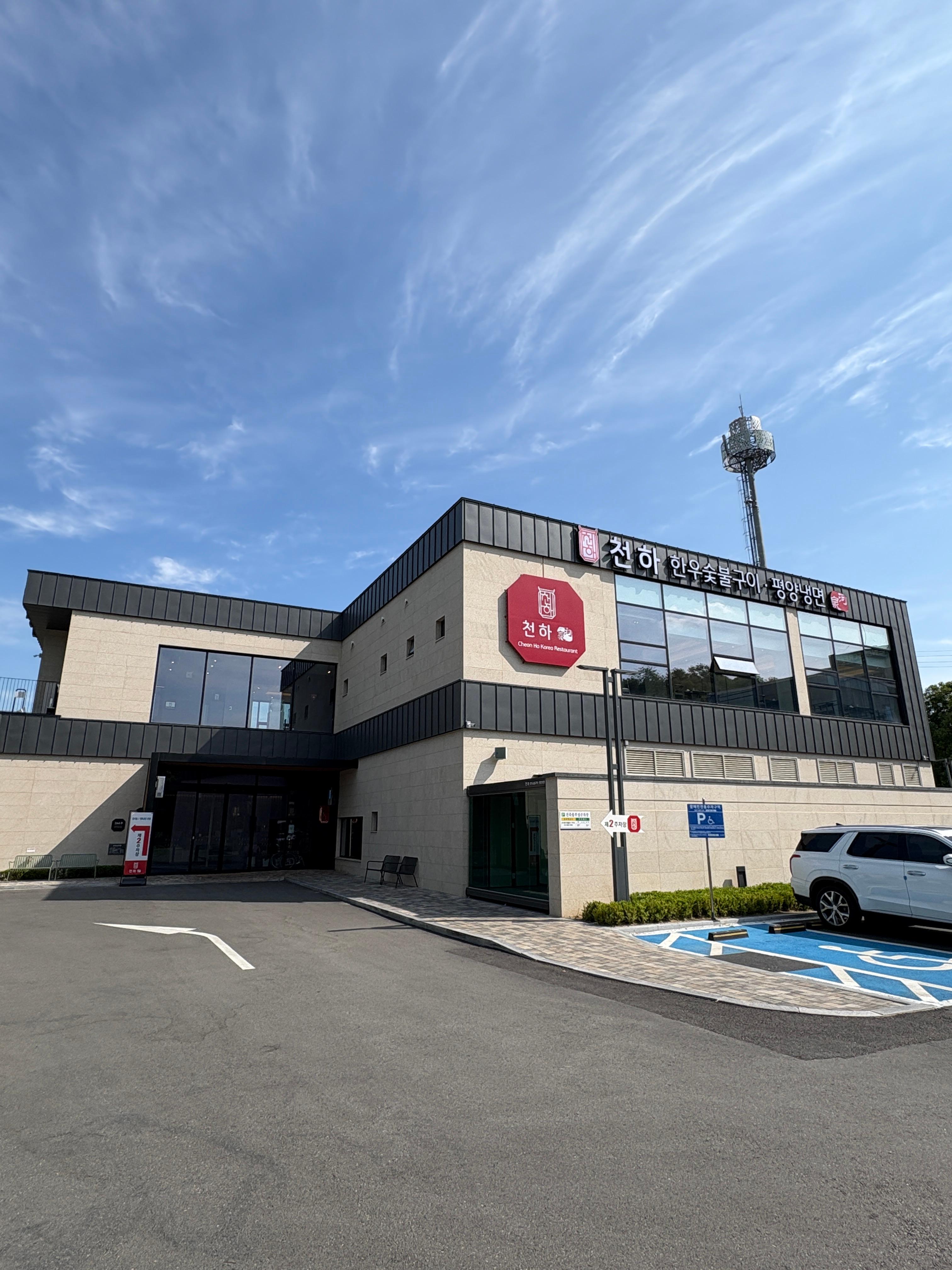 천하는 대전 유성구의 갑천 강변을 따라 자리잡은 음식점인데요, 부지 자체가 굉장히 넓어서 주차 공간도 매우 넉넉하고 앞에 보이는 천변의 풍경이 인상적입니다. 사장님이 오래전부터 요식업에 몸을 담으셨던 분이시고, 오래전부터 부지를 매입하여 가지고 계시다가 준비 끝에 오픈하셨다고 합니다. 뒤에서도 말씀드리겠지만 사장님이 요식업에 대한 센스가 굉장히 좋으신 것을 여러 부분에서 느낄수있습니다. 숯불구이와 평양냉면을 찾는 타겟 고객층을 명확하게 잡고, 거기에 맞는 인프라 등을 구축해두신건데요, 사실 1인분에 몇만원하는 소고기를 숯불에 구워먹는 고객들이 지하철타고 오는 경우보다는 자차를 가지고 이동하는 경우가 많거든요. 그래서 이렇게 음식점을하기에는 약간 변두리라고 생각될 수 있는 공간이지만 충분히 넓은 부지로 주차공간과 앞의 풍경을 볼 수 있는 룸을 갖추면 장사가 안될수가 없습니다.