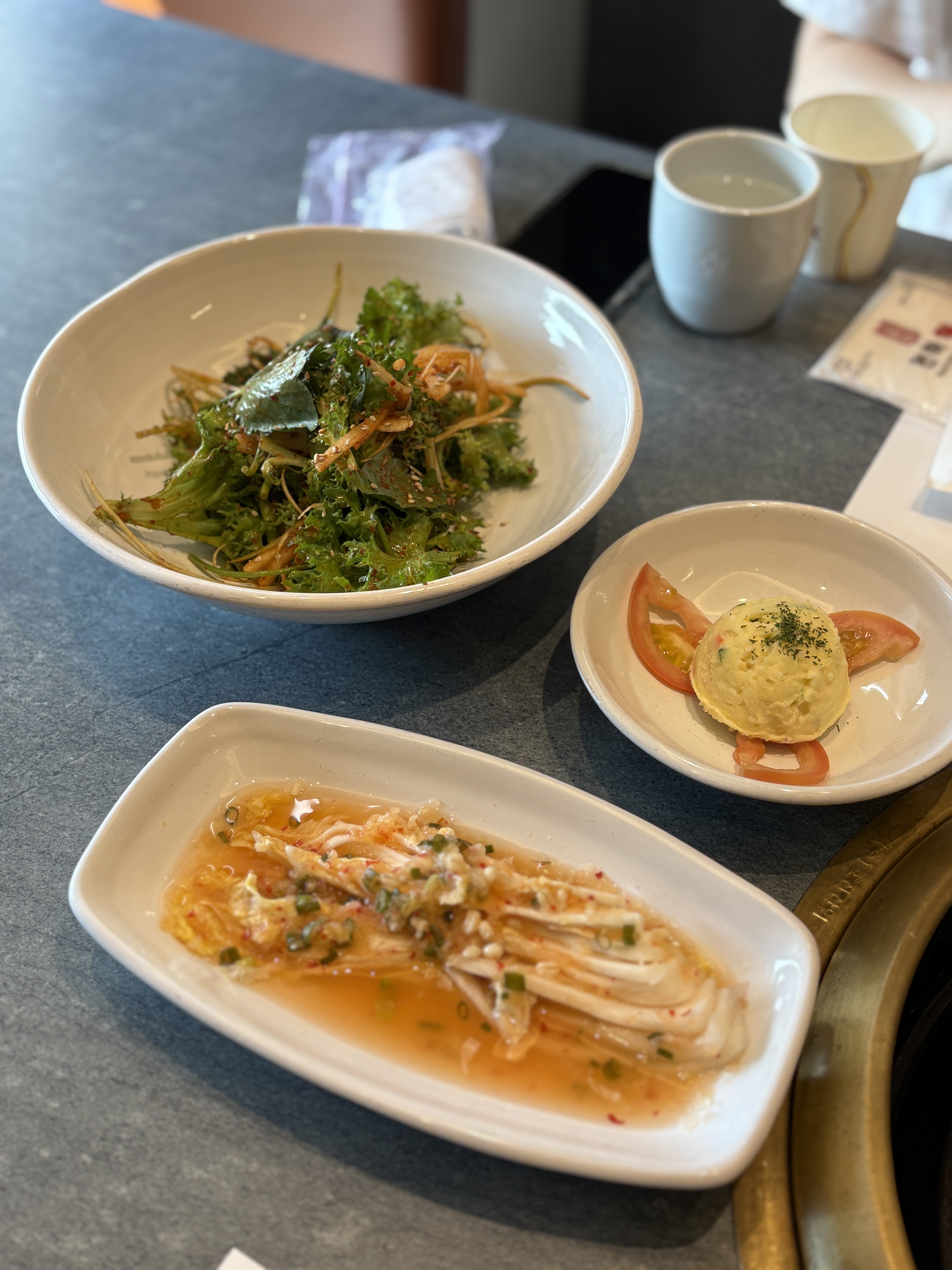 처음 맛본것은 육회였는데요, 달큰하면서도 고소한 양념이 매력적이어서 기본찬이라는 생각은 절대 안들었습니다. 추가해서 더 먹고 싶었지만 (유료) 고기양이 많아서 참았습니다 ㅎㅎ