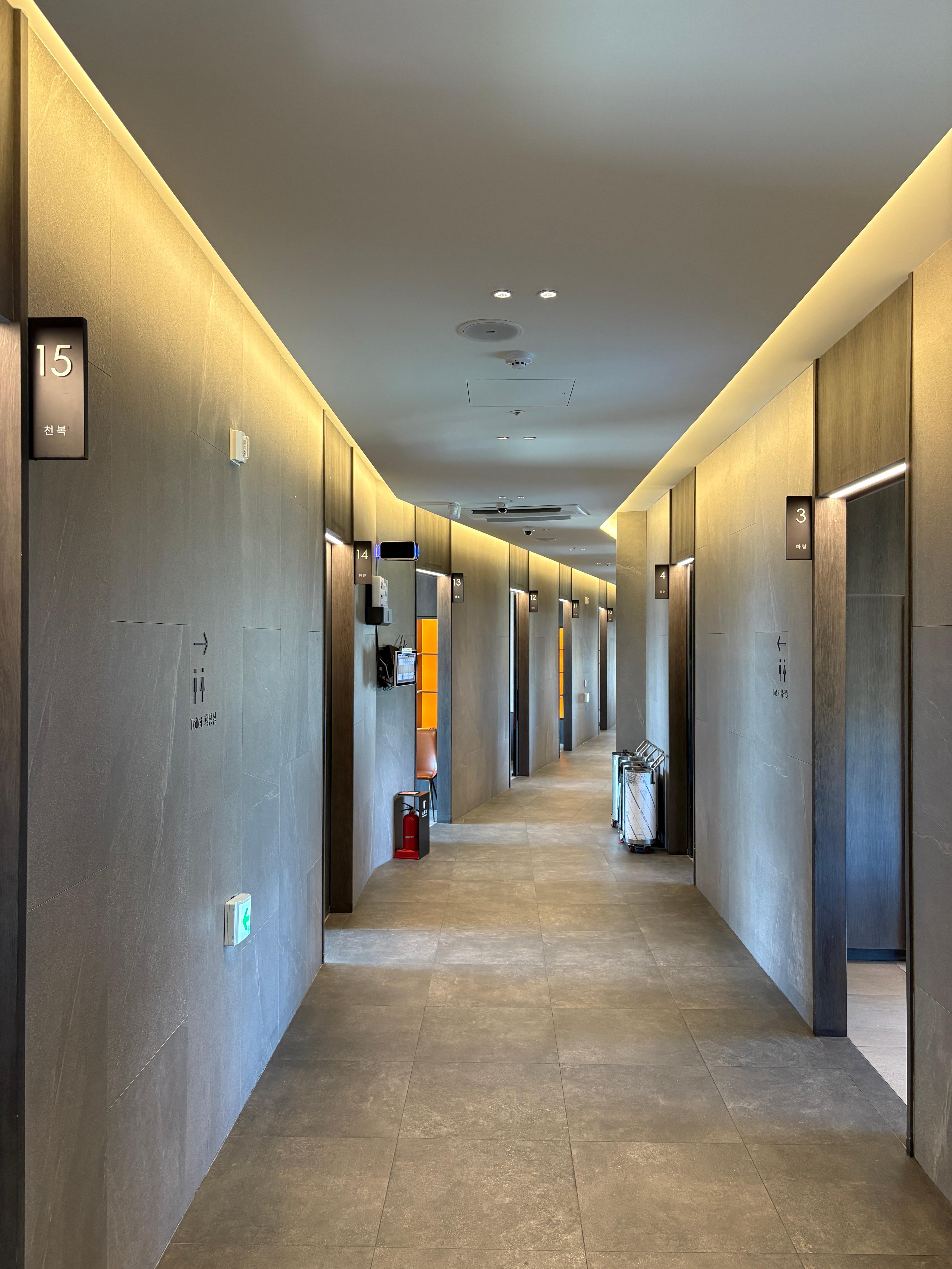 입구 공간에서 좌측으로는 모두 룸으로 구성되있을 만큼 룸에 집중한 식당인 것을 알 수 있습니다. 규모에 맞게 다양한 룸을 갖추고 있어서 실제로도 입구에 보면 모임 예약을 한 팀이 상당히 많은 것을 알 수 있습니다.