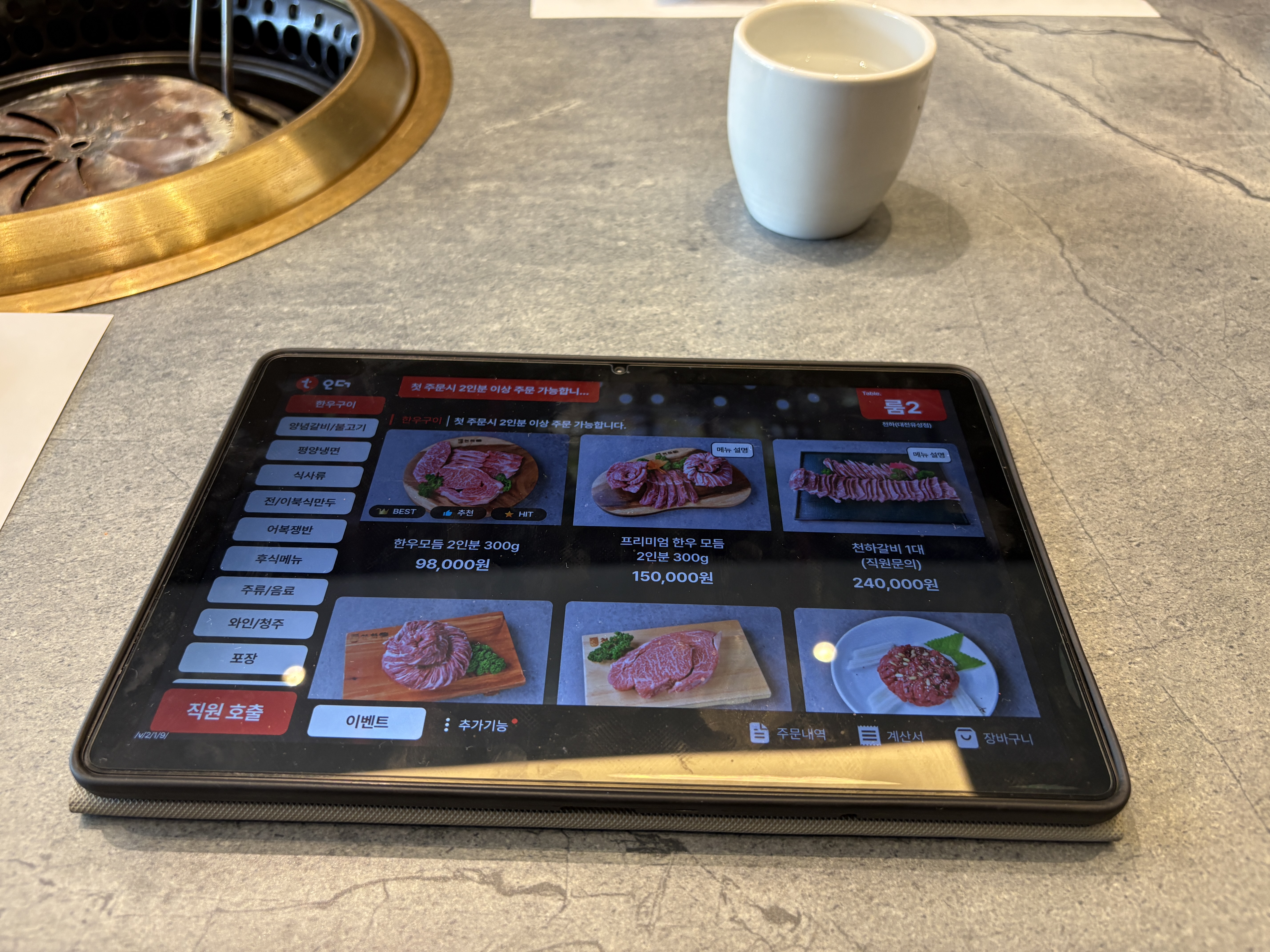 주문은 모두 자리에서 테블렛으로 주문이 가능합니다. 기기사용이 어려운 어르신들은 직접 주문도 받아주신다네요. 가격을 보시면 아시겠지만 고급 한우구이집의 괴랄한 가격보다는 저렴하고, 저렴한 식육식당보다는 비싼 중간 정도의 가격대로 책정되어있습니다. 저희같은 경우는 방문 당시 아기가 있어서 룸으로 배려를 해주셨는데요, 룸에서 먹을때는 대부분 고기를 구워주신 것 같습니다. 바쁘시면 못구워주시는 경우도 있다고 하시니 이부분은 참고해주세요!