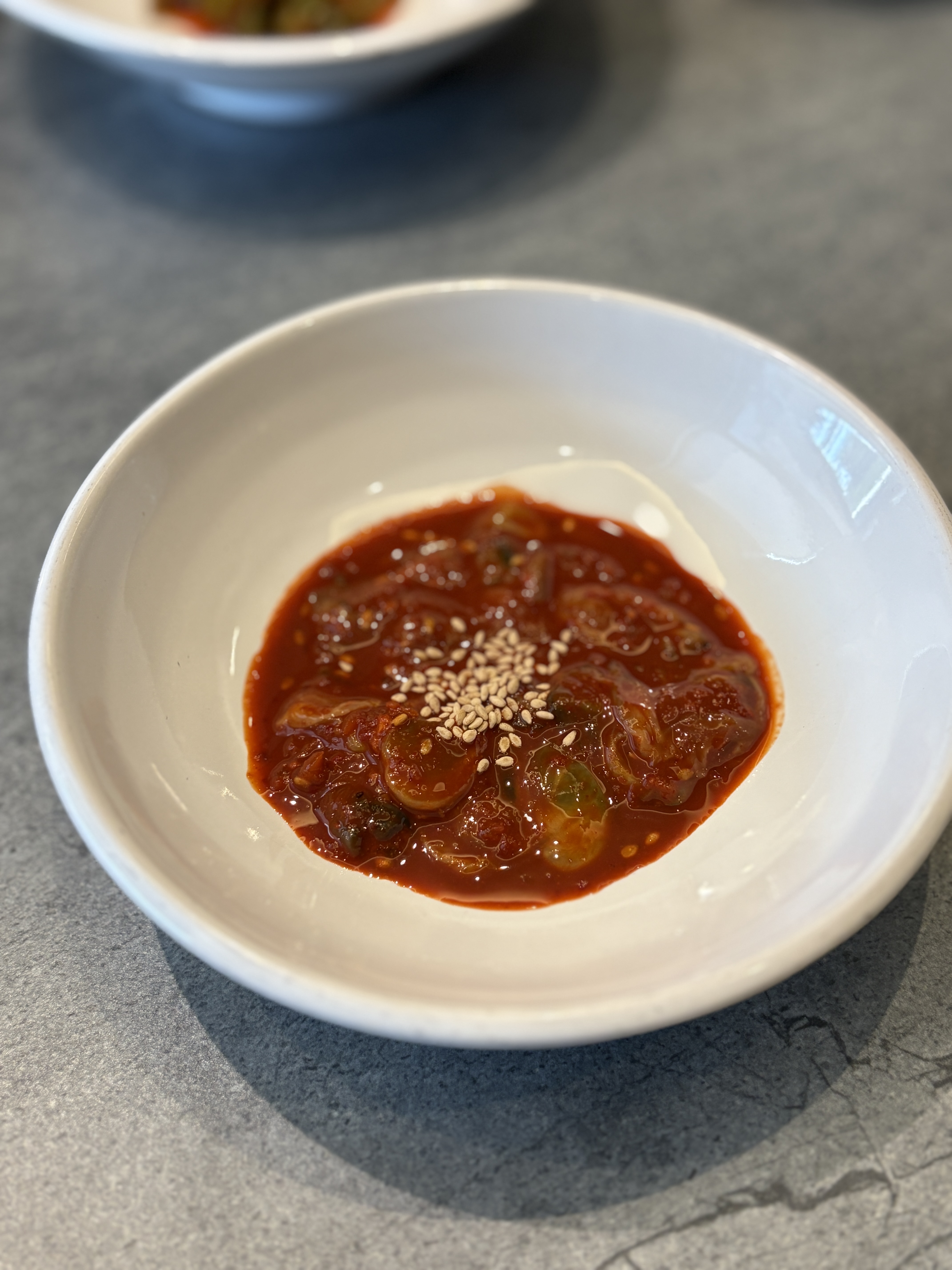 요 어리굴젓은 무료로 리필이 가능했습니다. 시원한 맛의 어리굴젓이 양념갈비로 혀가 지쳐갈때쯤 같이 먹어주면 입맛이 다시 살아나게끔해주는 맛도리였습니다. 천하에 가면 무조건 리필하는 반찬이네요.
