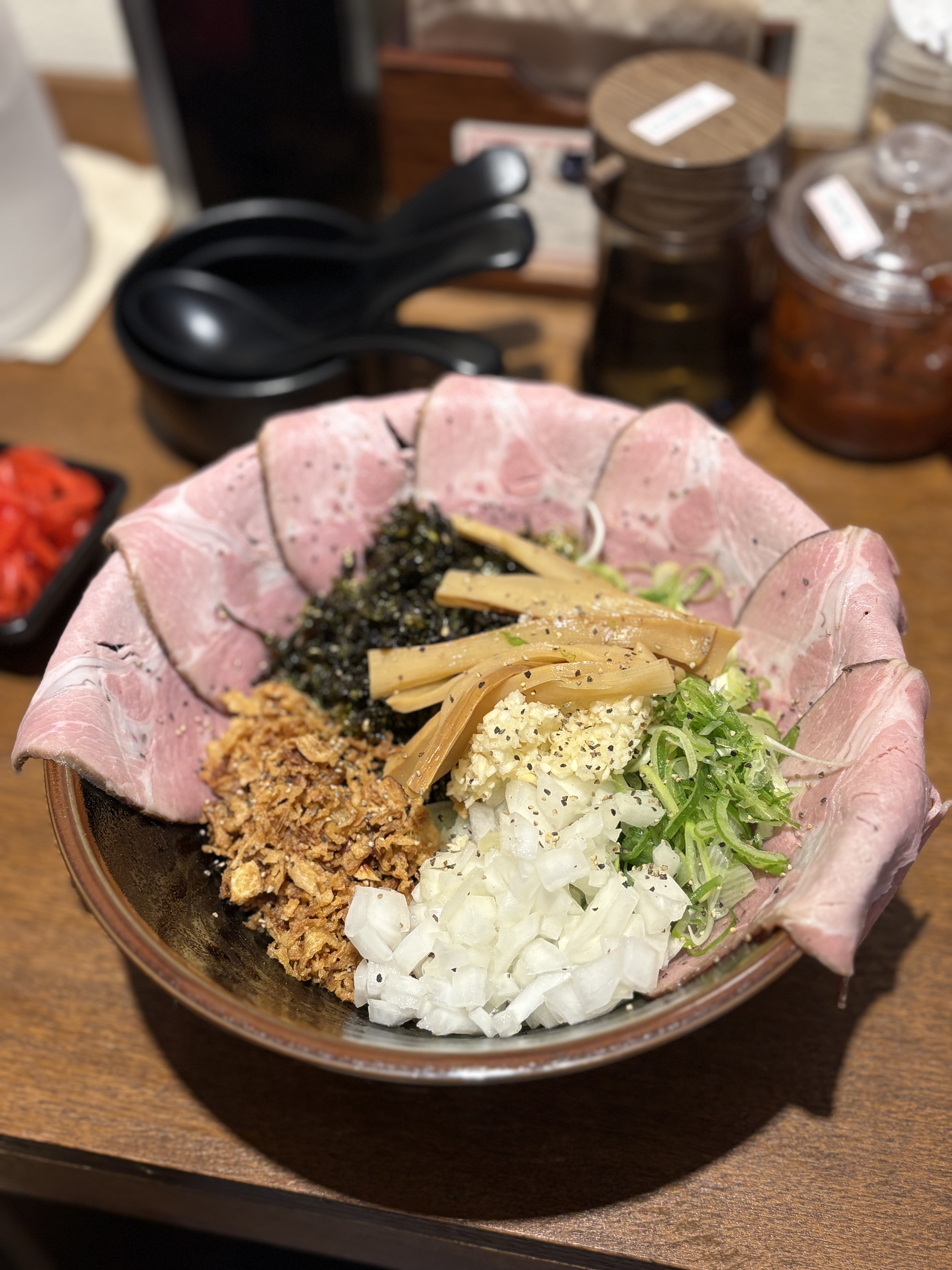 멸치비빔라멘은 새로 추가된 메뉴인데요, 사장님께서 의왕시에 있는 라멘구락부의 멸빔 메뉴를 드셔보시고 영감을 받아 만드신 것 같습니다. 저로서는 처음 먹어보는 메뉴인데요, 우선 토핑이 매우 푸짐하게 나옵니다. 양파, 마늘, 그리고 튀긴 양파, 파, 멘마도 상당히 넉넉하게 들어가있구요 김가루도 꽤 많네요 ㄷㄷ 굉장히 묵직한 느낌입니다. 차슈는 기본 돈코츠와 같은 차슈로 나오네요. 라멘구락부의 멸빔의 경우에는 깍둑차슈가 나오는데 아무래도 혼자 하시다보니 깍둑 차슈는 힘드신 것 같습니다.